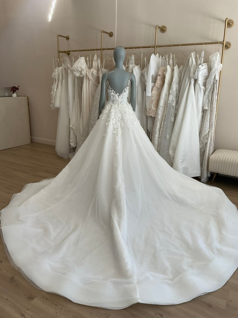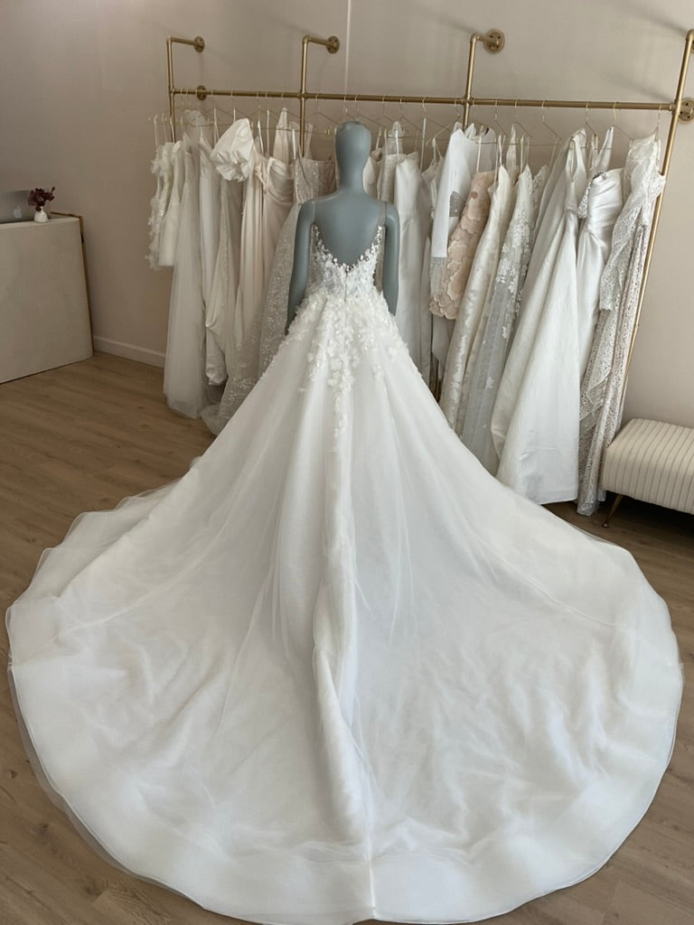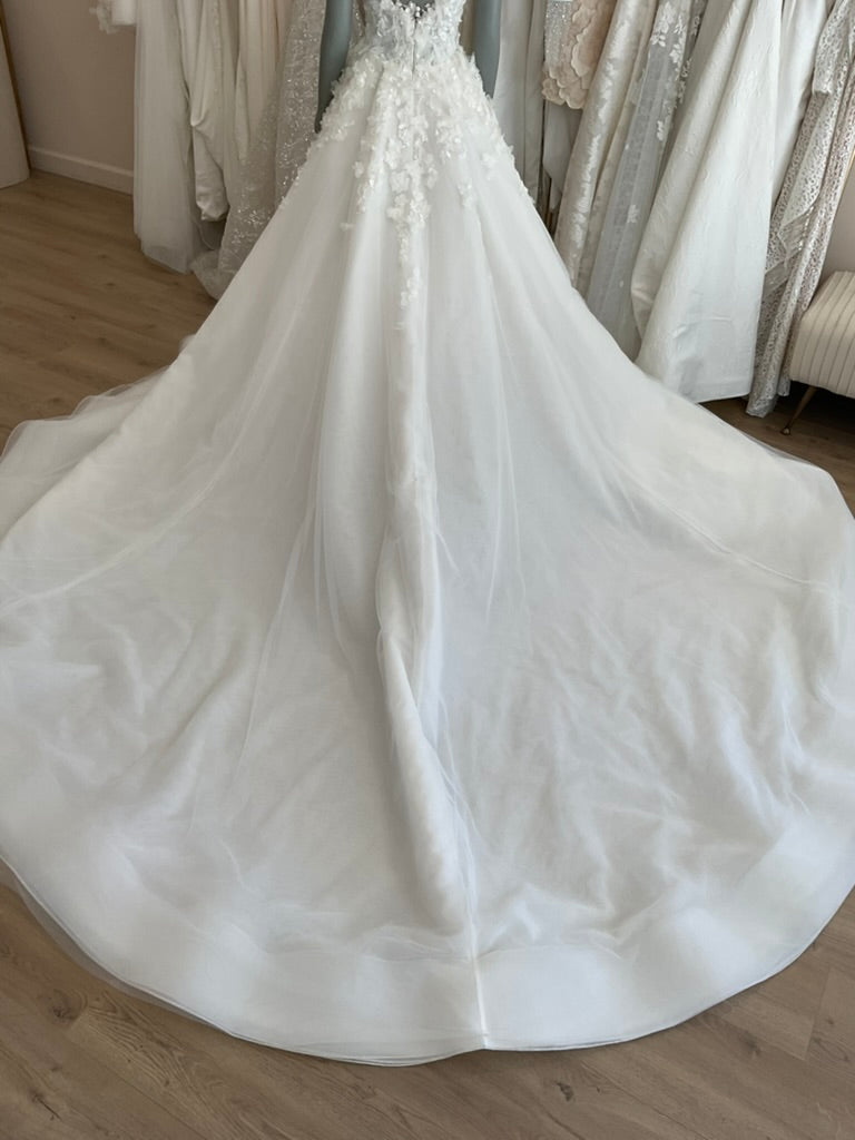 NOT LOCAL TO LA-Schedule a free 30 minute virtual fitting appointment before it's too late. Our inventory of hard to find wedding dresses is limited, and this is the only dress in stock and is available on a first come, first-served basis. Click here for a virtual Appointment