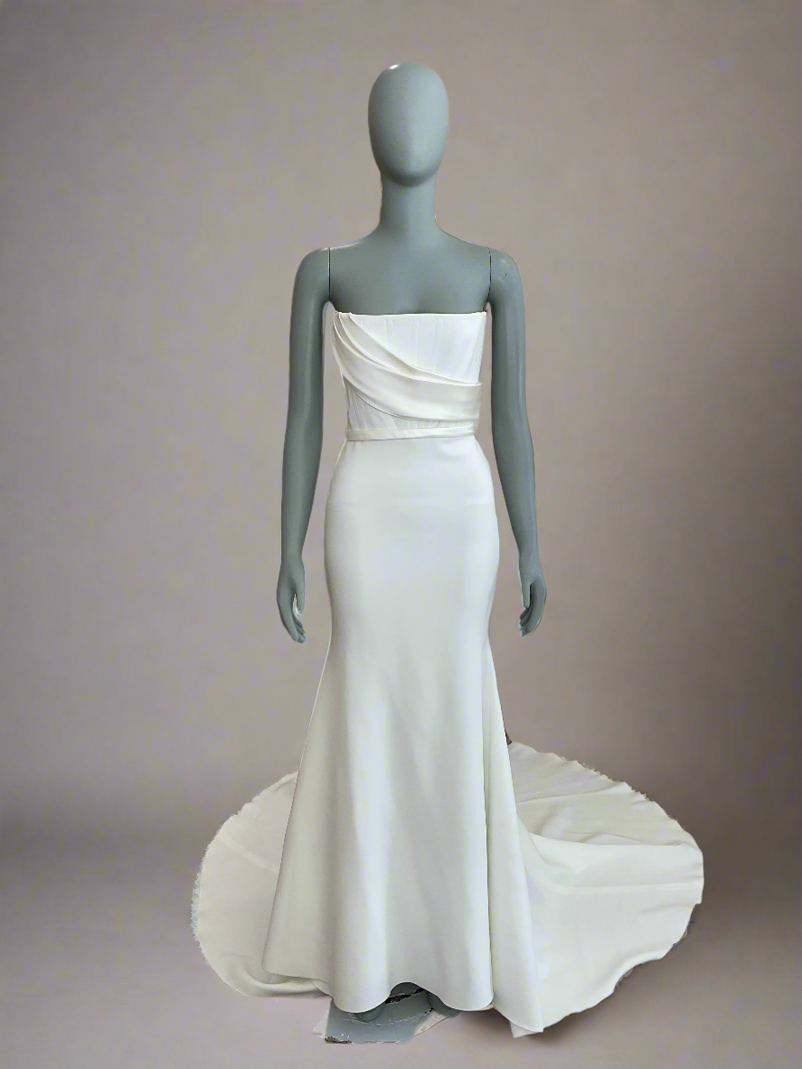 This Alex Perry Elyse fit and flare crepe gown is meticulously crafted using Japanese silk fabric and master corsetry. The straight neckline and princess corset make this gown flattering on any bust size. The silk duchess draping and belt accentuate your waist, while the dome buttons on the back of the gown add a nice touch. The skirt perfectly hugs and shows off your curves before cascading out into a flowing skirt with a cathedral train that has a three point french bustle. While this gown has been altered, it has never been worn.