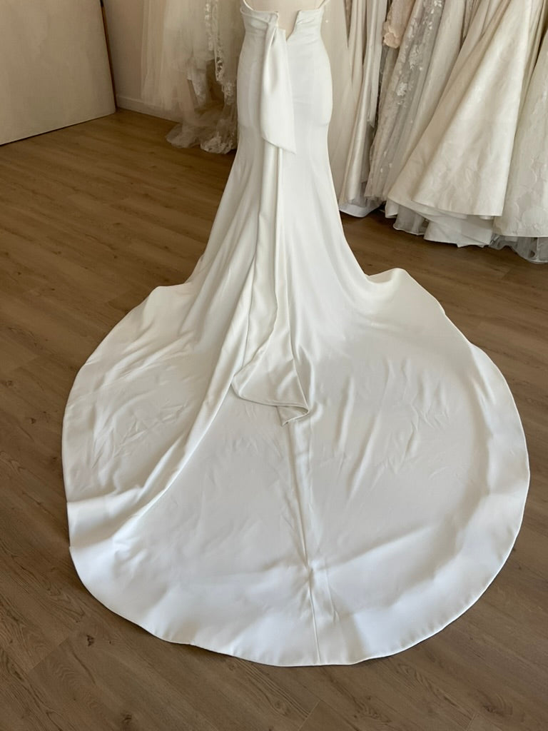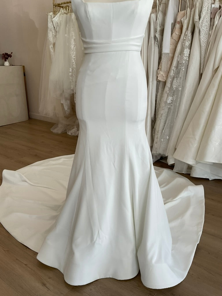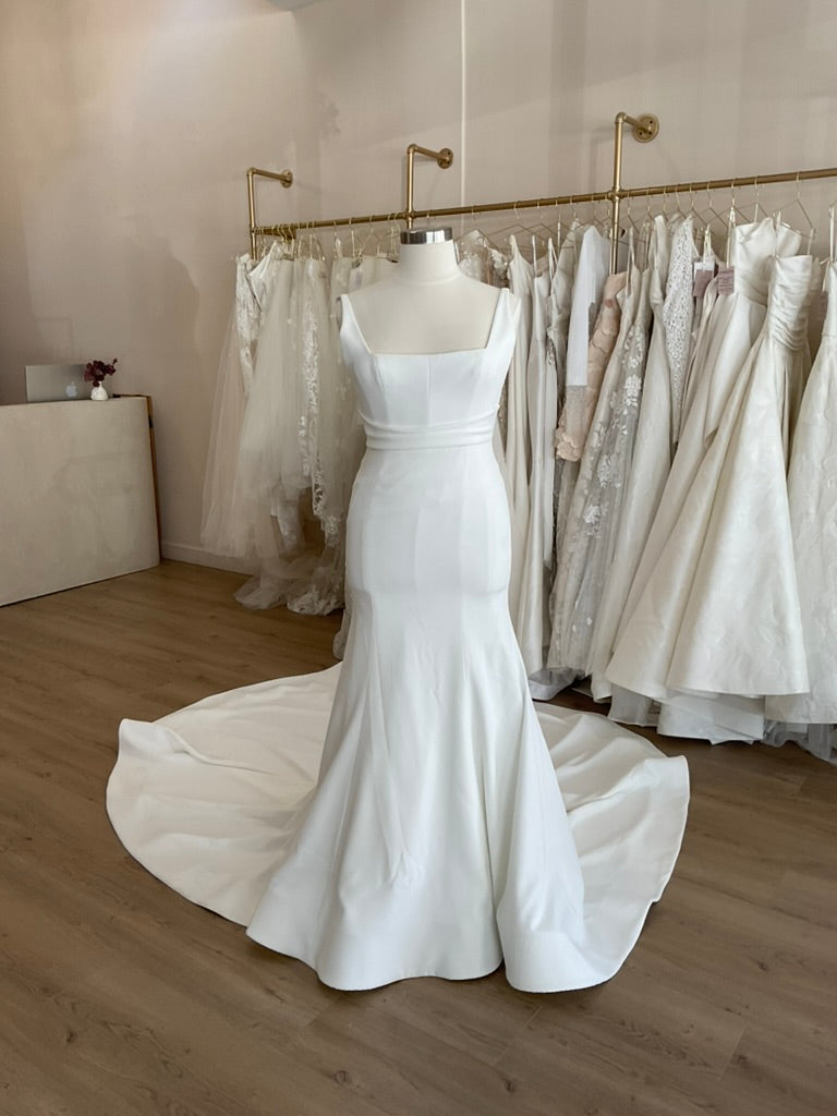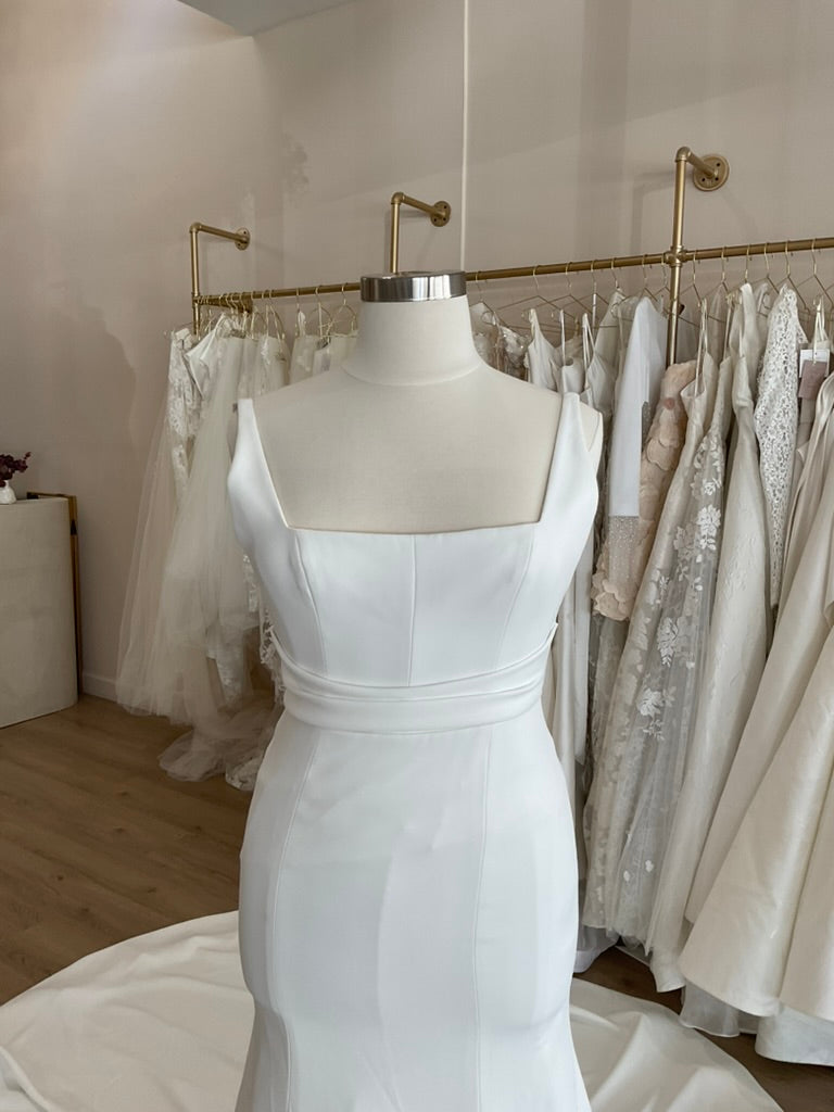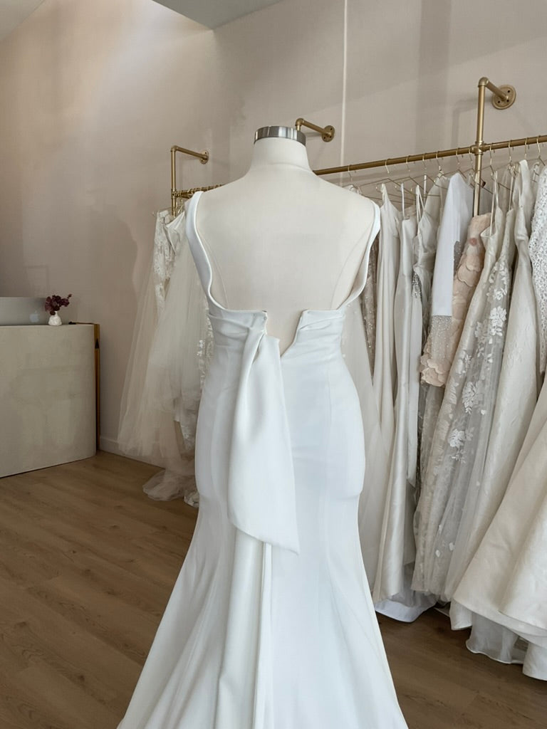 The Alyne by Rita Vinieris June gown is the epitome of modern minimalism with timeless sophistication. Crafted in luxe crepe, this gown features a structured square neckline and thick straps that flatter the décolletage while offering elegant support. The fitted bodice enhances your natural curves before flowing effortlessly into a soft flared skirt. From the back, a plunging scoop adds a romantic edge, accented by a minimalist bow detail at the waist for a subtle touch of drama. The long, sweeping train lends graceful movement and classic bridal presence. The *June* is perfect for the bride who desires a clean, architectural silhouette that speaks volumes without saying a word.