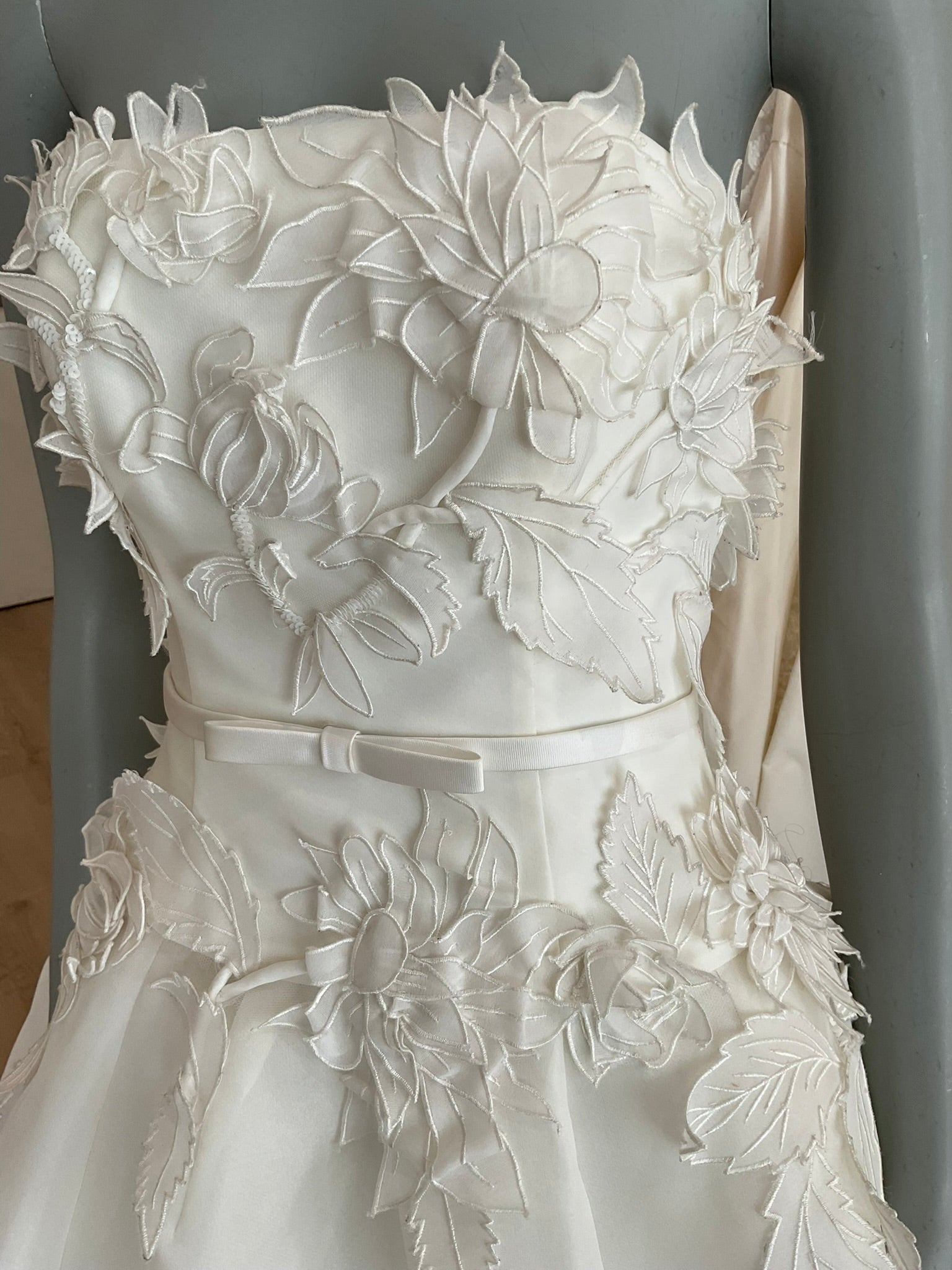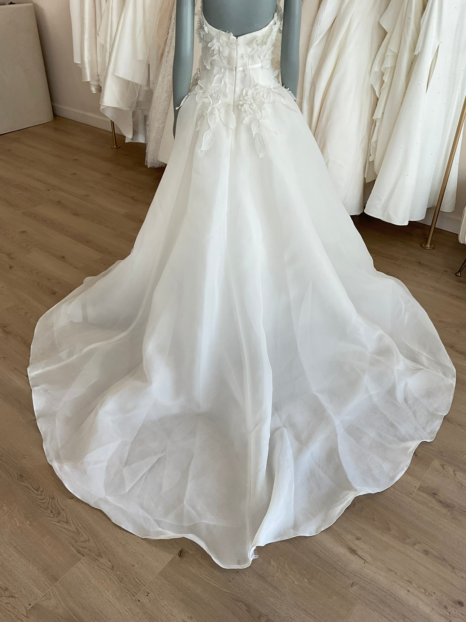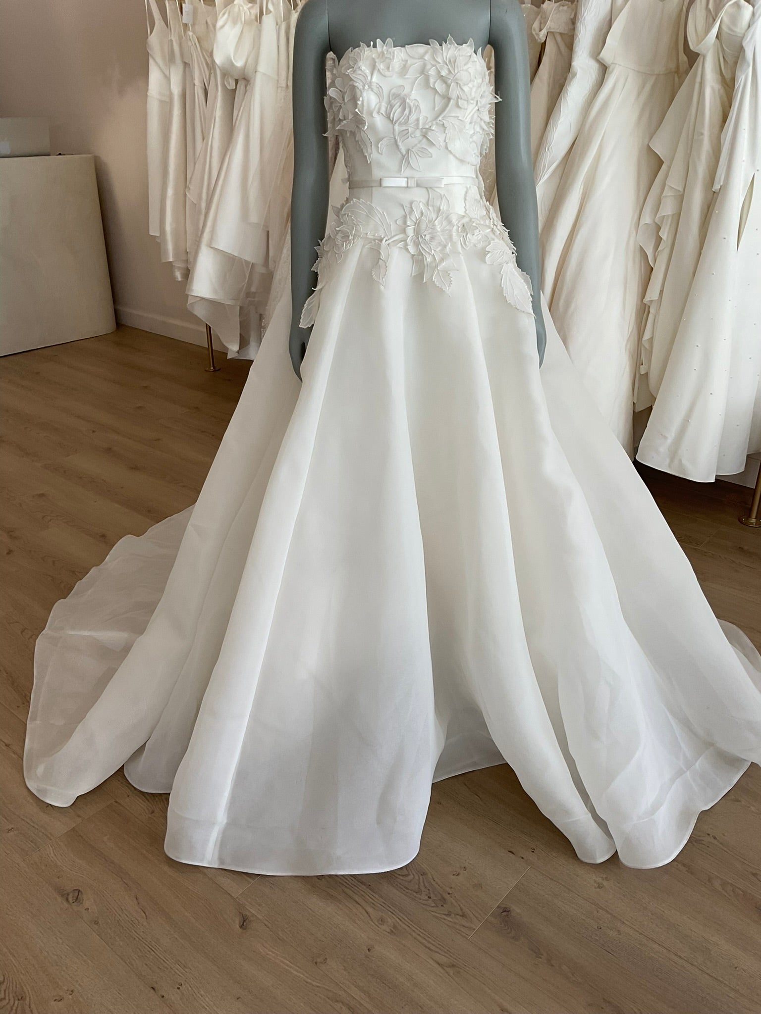 The Amsale Blossom is a beautiful modified aline. The natural waist belt accentuates the waist while the floral appliques move the eye around the gown. The gazar fabric is lightweight and whimsical. This gown comes to us directly from the designer as a sample and will need a dry clean.