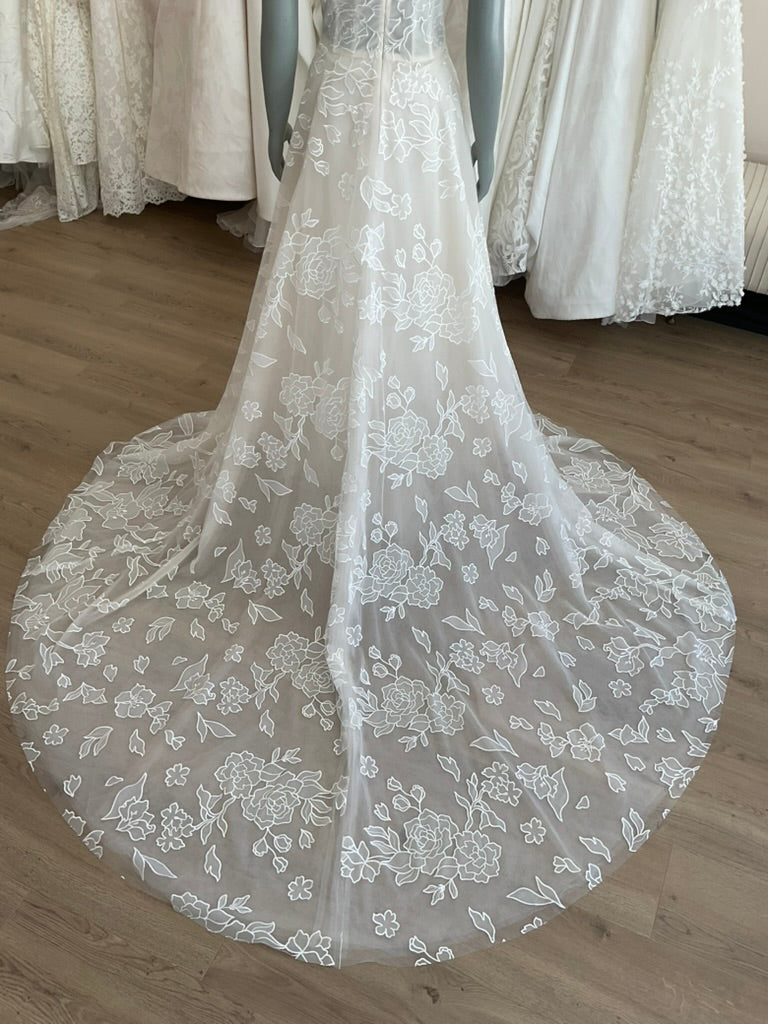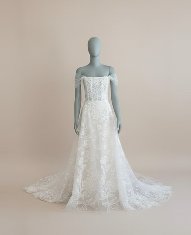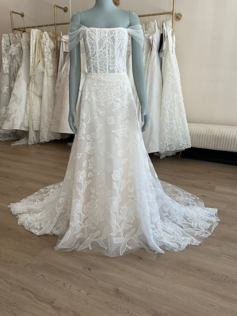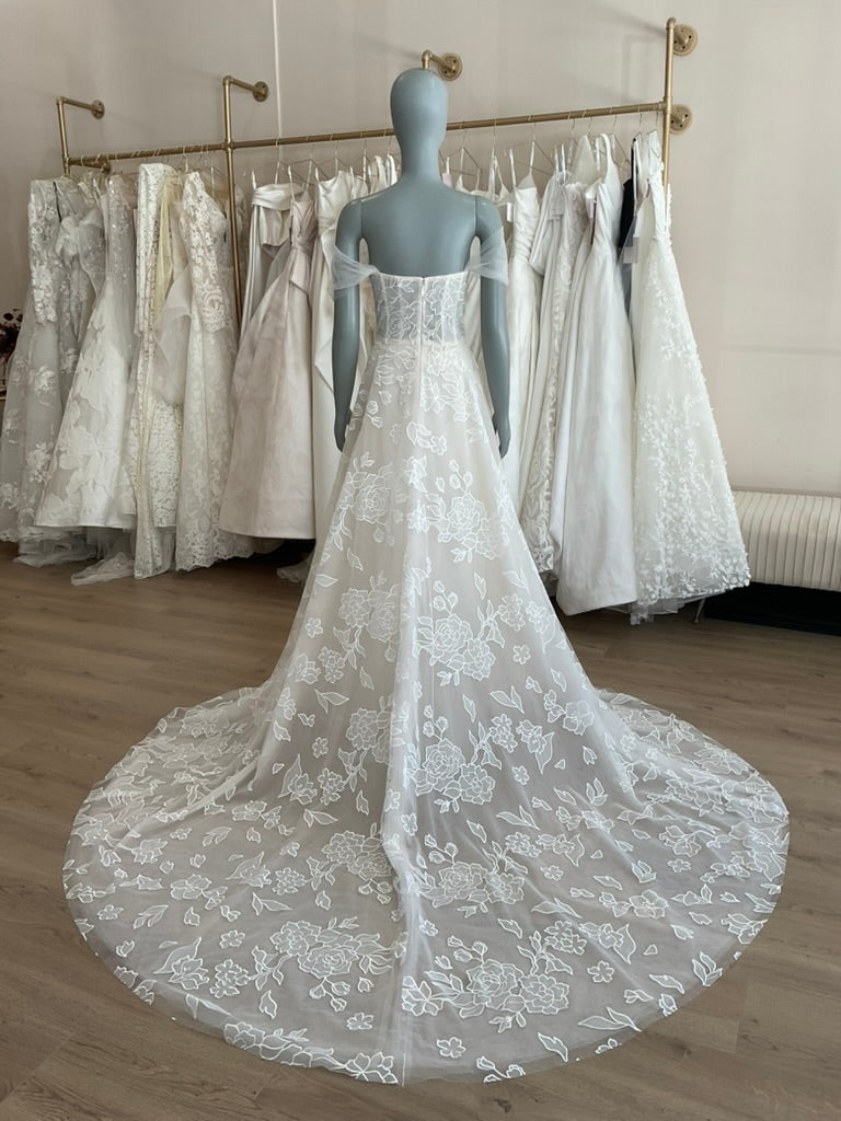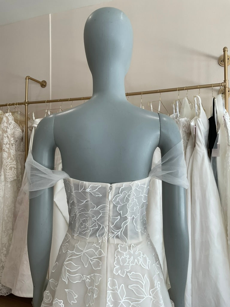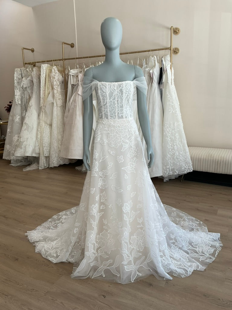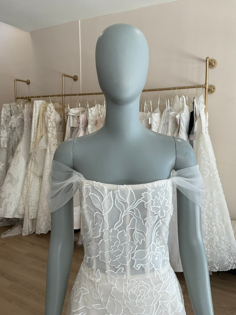 The Amsale Calypso is a romantic and ethereal gown perfect for the modern bride with a love for classic elegance. This soft A-line silhouette features a structured corset bodice adorned with delicate embroidered floral appliqué. The straight neckline is enhanced by whimsical off-the-shoulder tulle sleeves, adding a dreamy touch to the overall look. A subtle satin waistband defines the waist, flowing into a light and airy skirt crafted from layers of embroidered tulle. The sheer train cascades gracefully, offering soft movement and a timeless finish. Ideal for garden weddings, vineyard vows, or serene coastal celebrations.