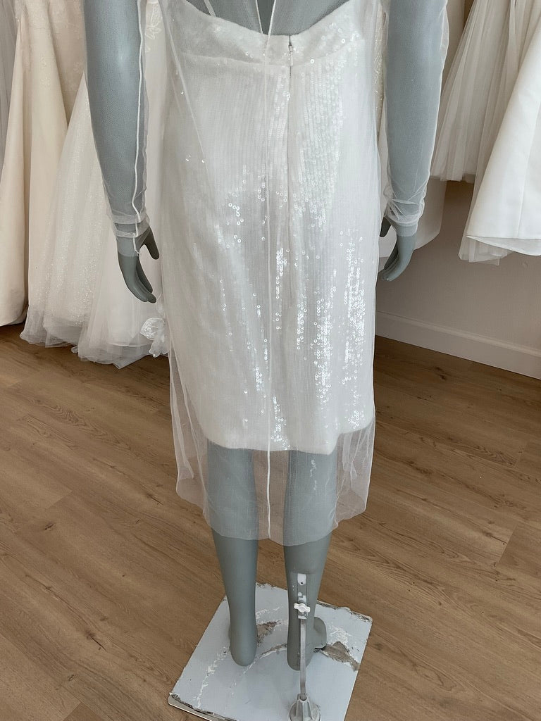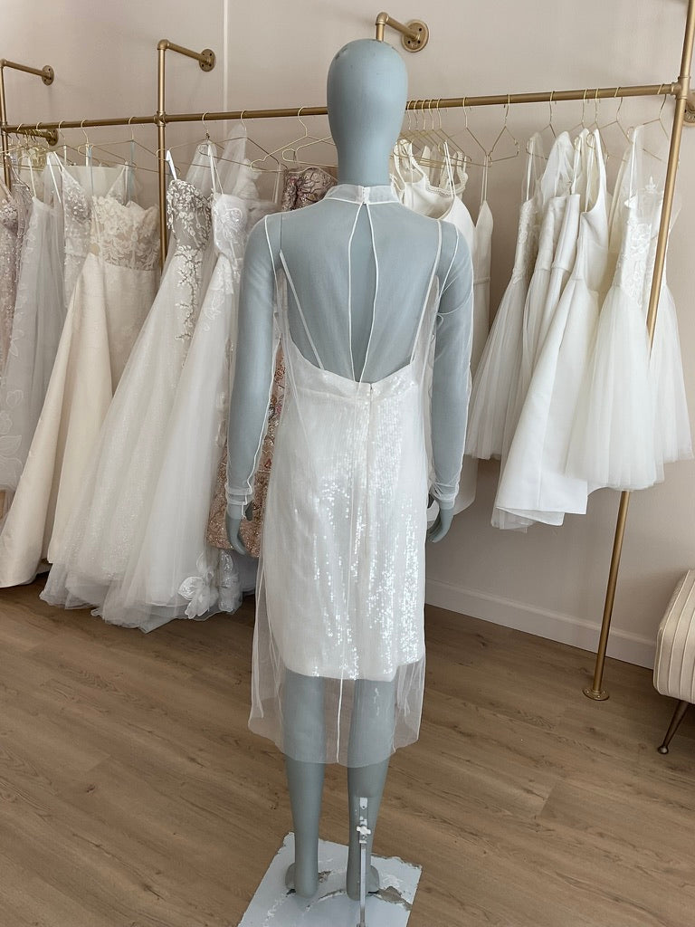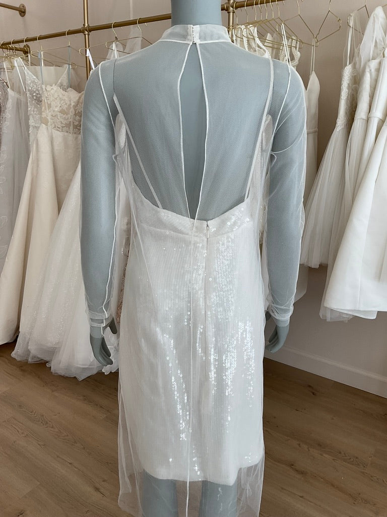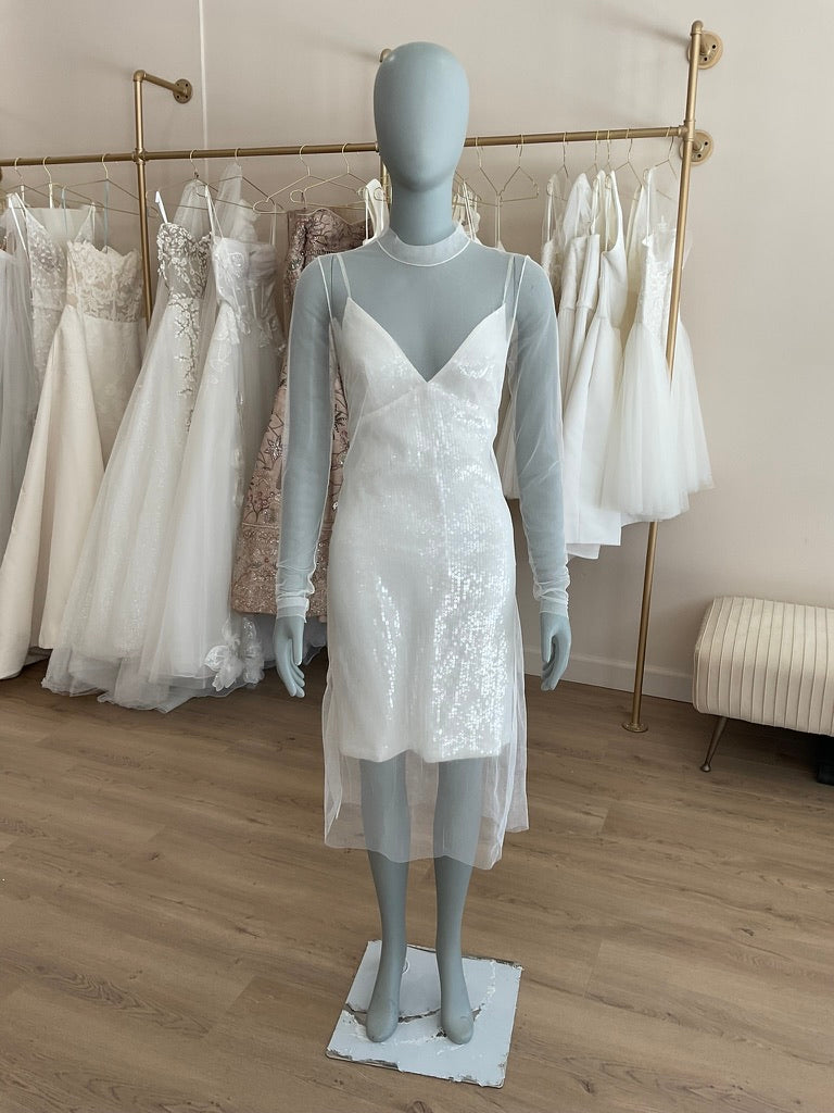The Amsale LW 131 is a chic sheath gown made for the fashion lover. The sheath sequin slip dress is a fitted dress with a separate tulle overlay for a unique twist.