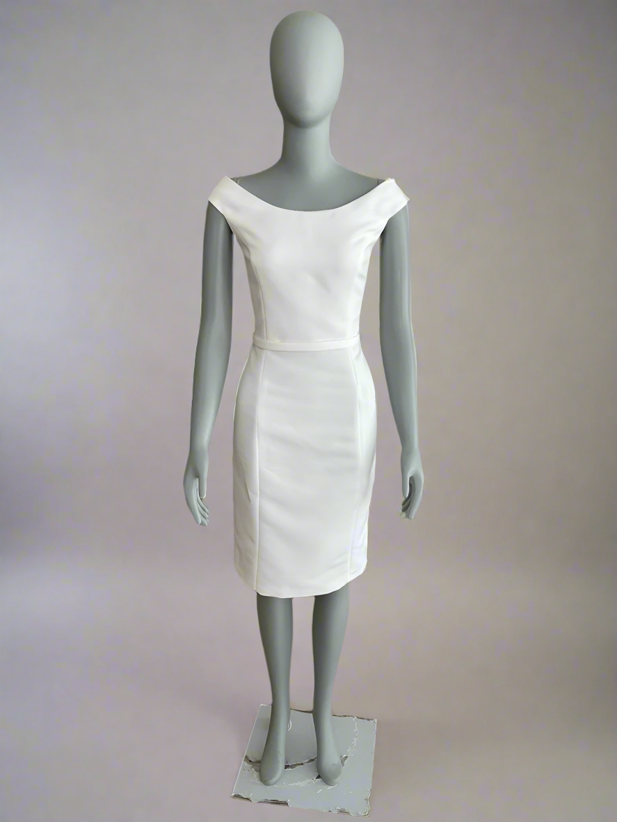 The Amsale LW 148 is a elegant midi faille dress. The subtle scoop/boat neckline drops into an off the shoulder neckline. The dress has princess seams down the seam contour the body for a pencil skirt fit.