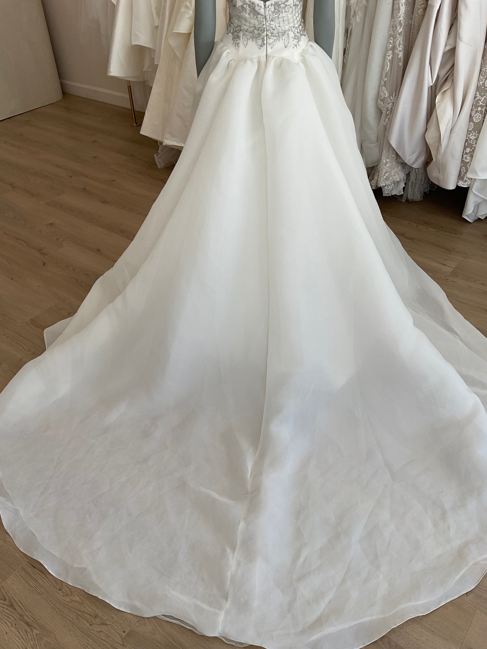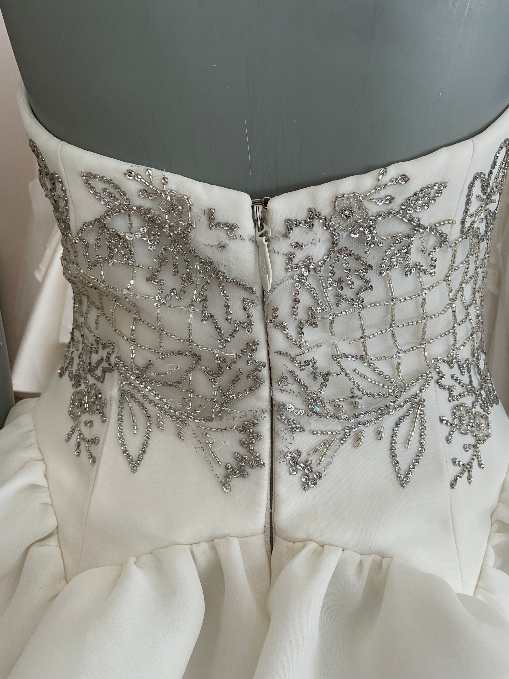 Flaws : There are a few beads missing in the back of the gown. There is a light dusting on the train and hem