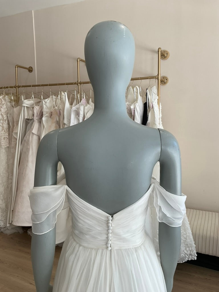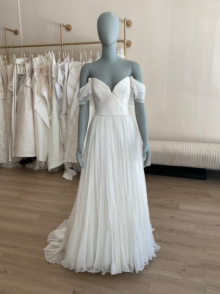 The Amsale R336C is a romantic and ethereal bridal gown perfect for the bride seeking effortless elegance. Crafted in soft ivory tulle, this strapless A-line silhouette features a sweetheart neckline and flattering pleated bodice with subtle architectural structure. The delicately draped bodice transitions into a flowy layered skirt that moves beautifully with every step. The back is finished with covered buttons and a soft sweep train, offering timeless bridal charm. Amsale’s signature minimalist design ensures a graceful, modern look for your walk down the aisle.