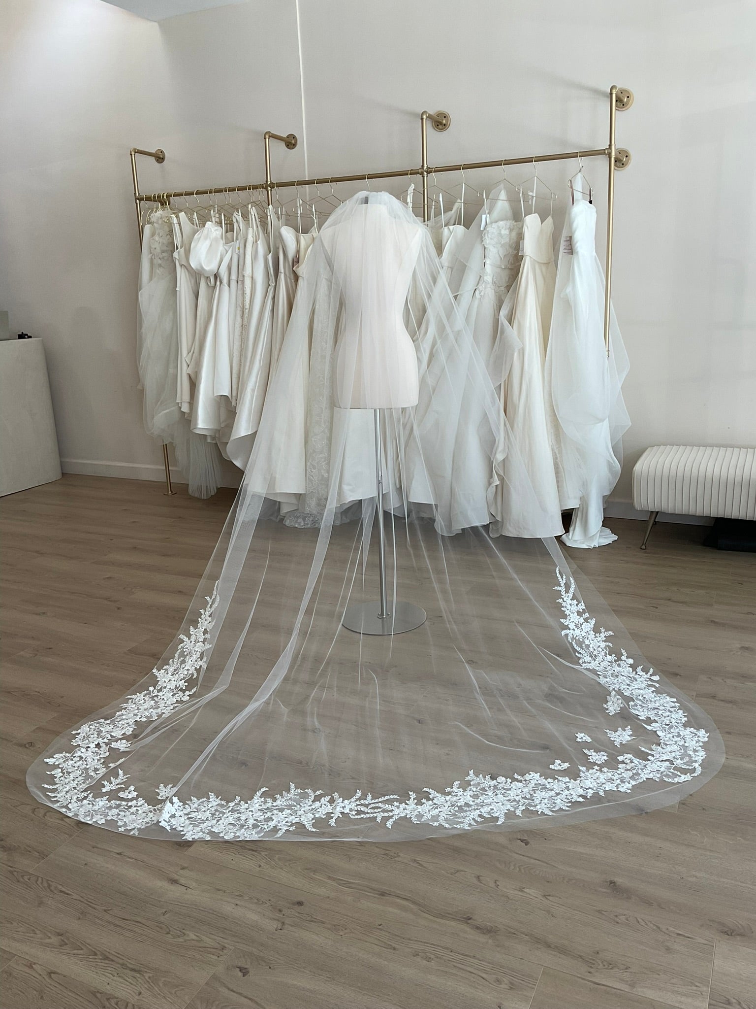 The Single layer raw edge veil has beautiful lace appliques in the bottom 1/2 edge.