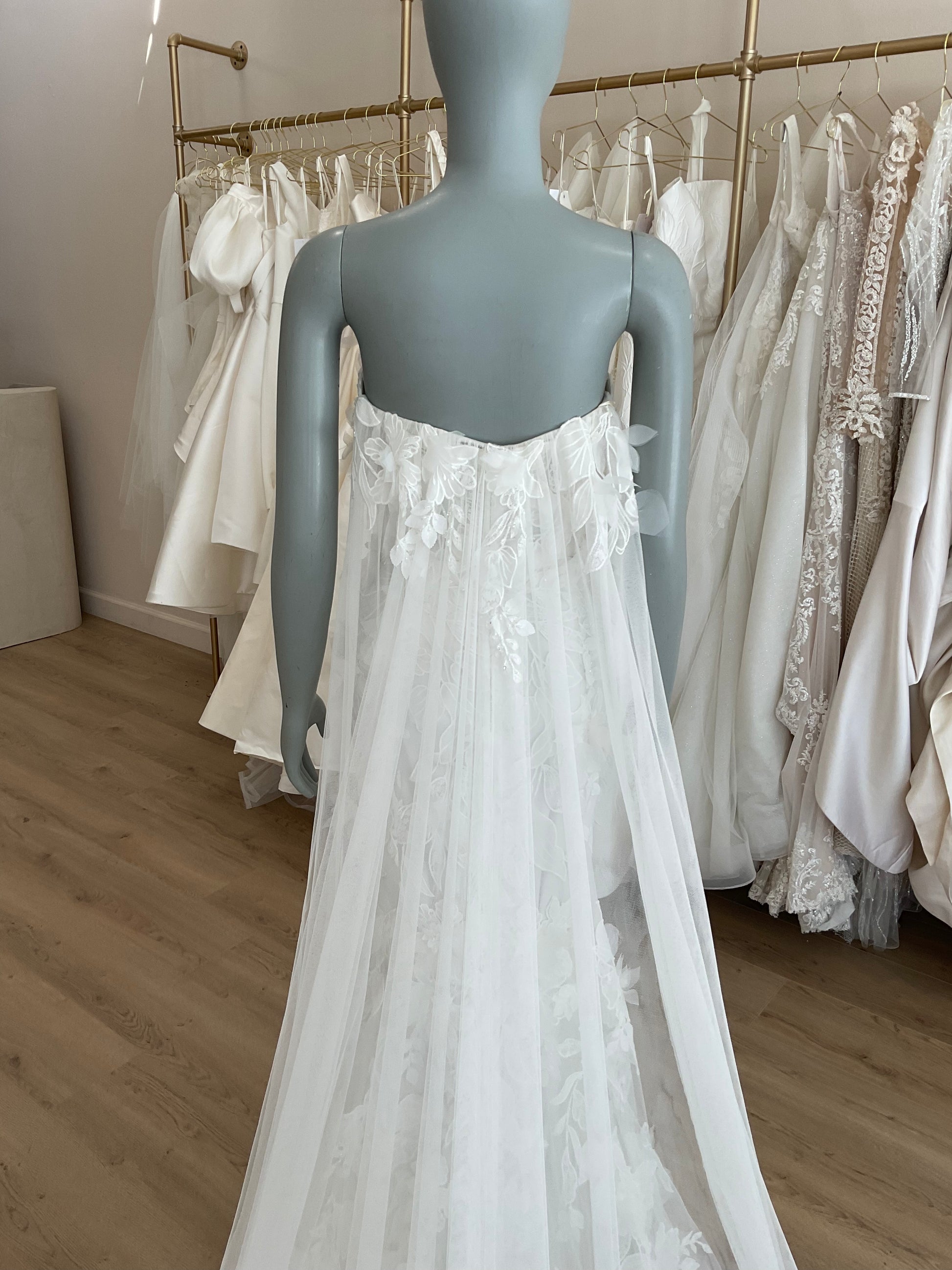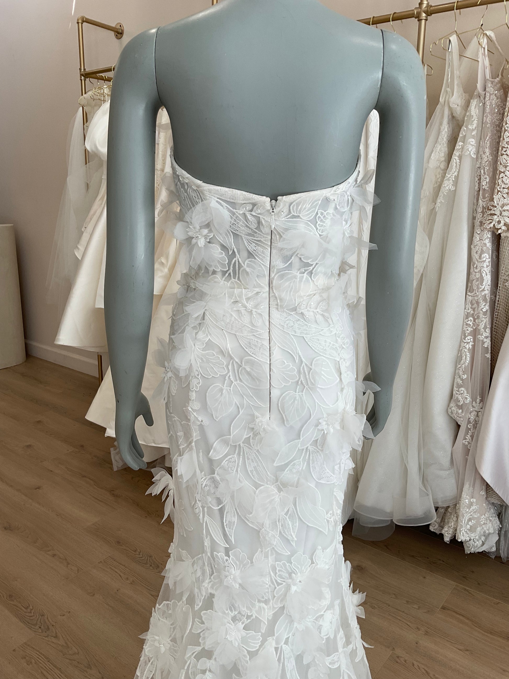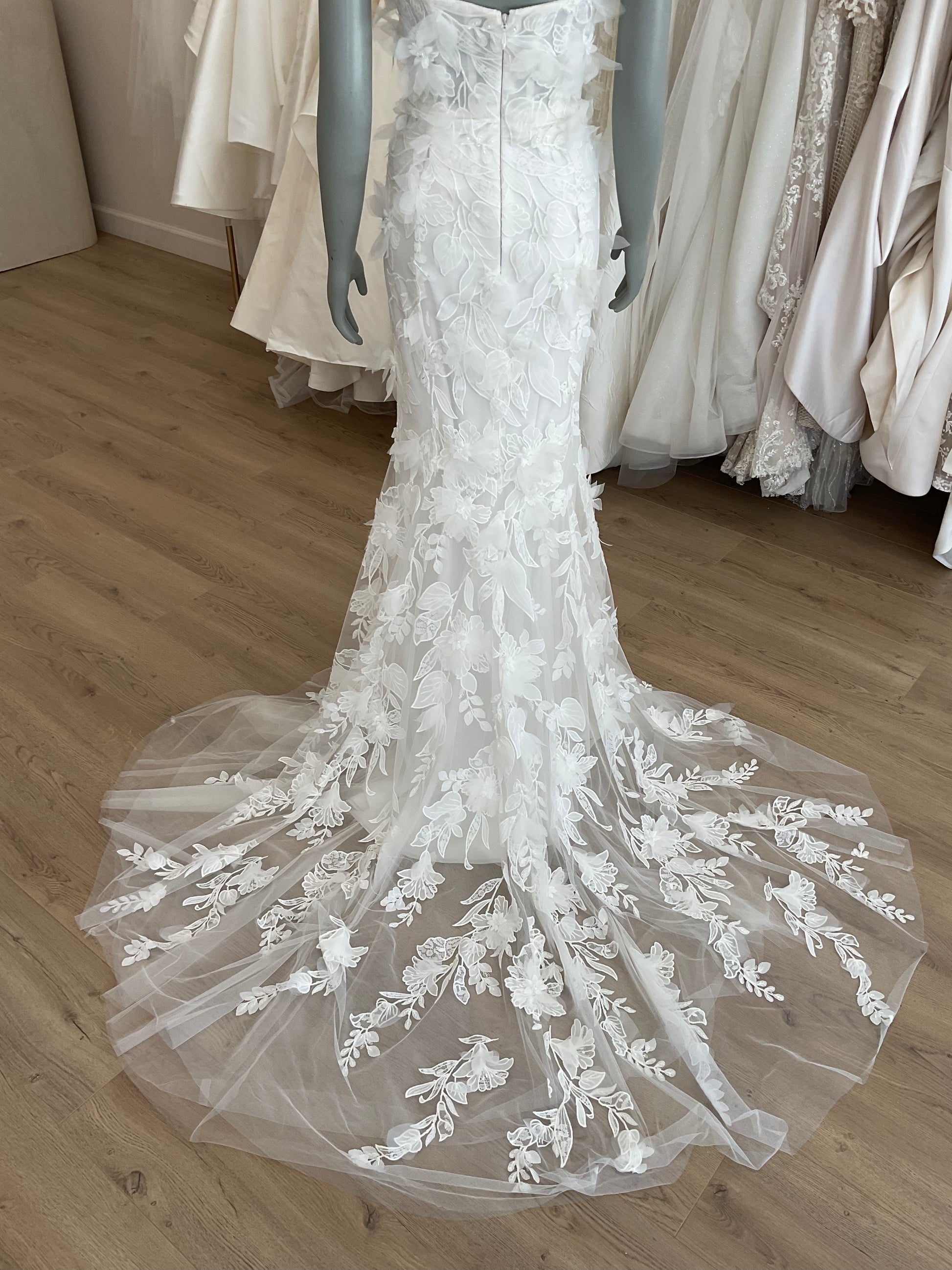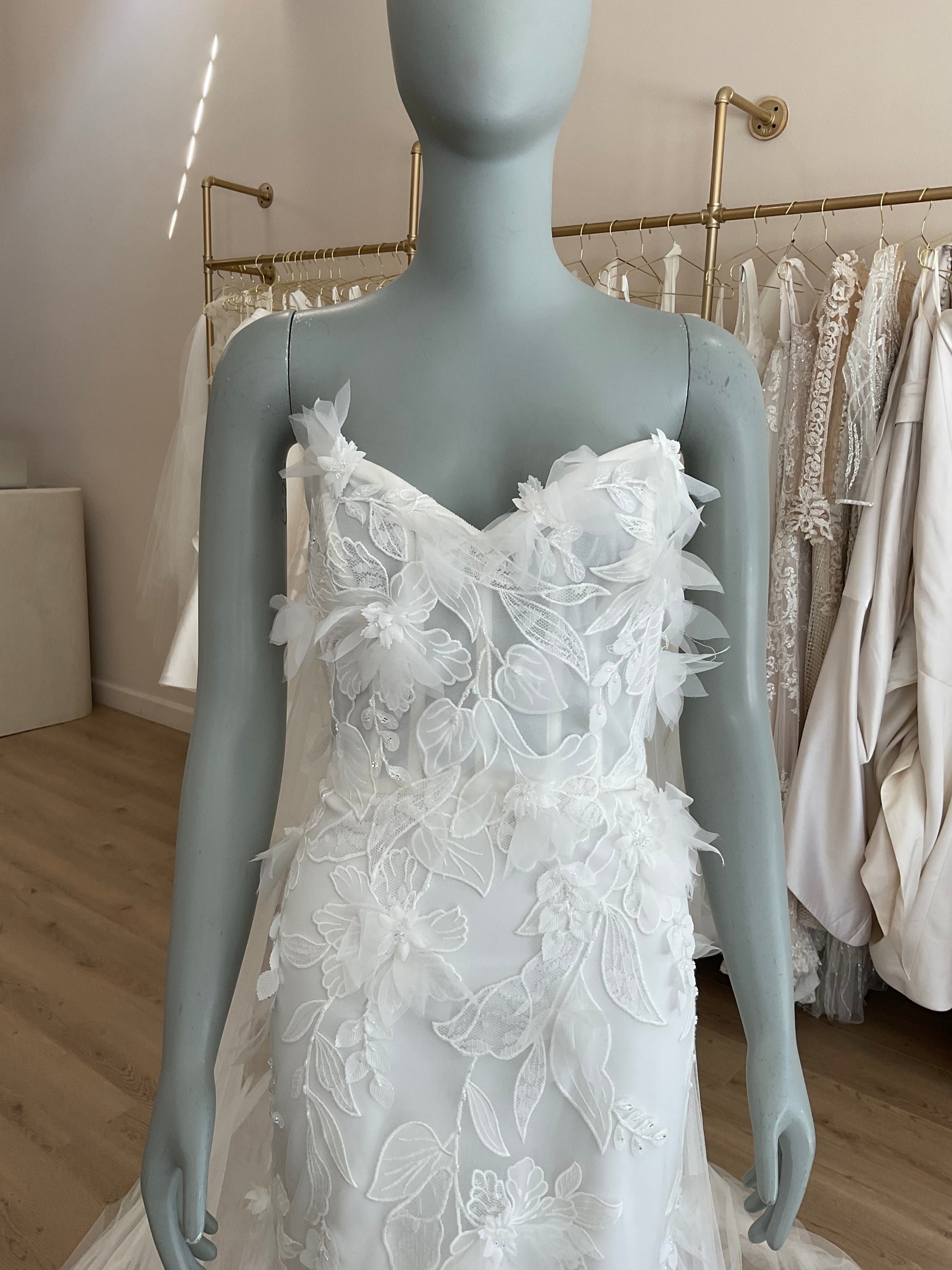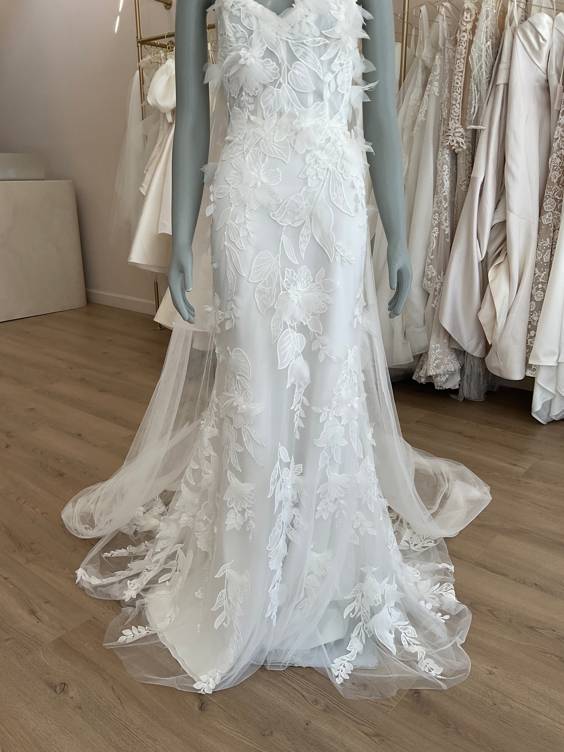 The Amsale Sylvan gown is a romantic subtle fit to flare with beautiful lace details. The more modern sweetheart has a slight point. There are 3D leaf like appliques throughout for added texture. The gown comes with a removable watteau train that snaps into the back neckline of the gown. This gown comes to us directly from the designer as a sample.