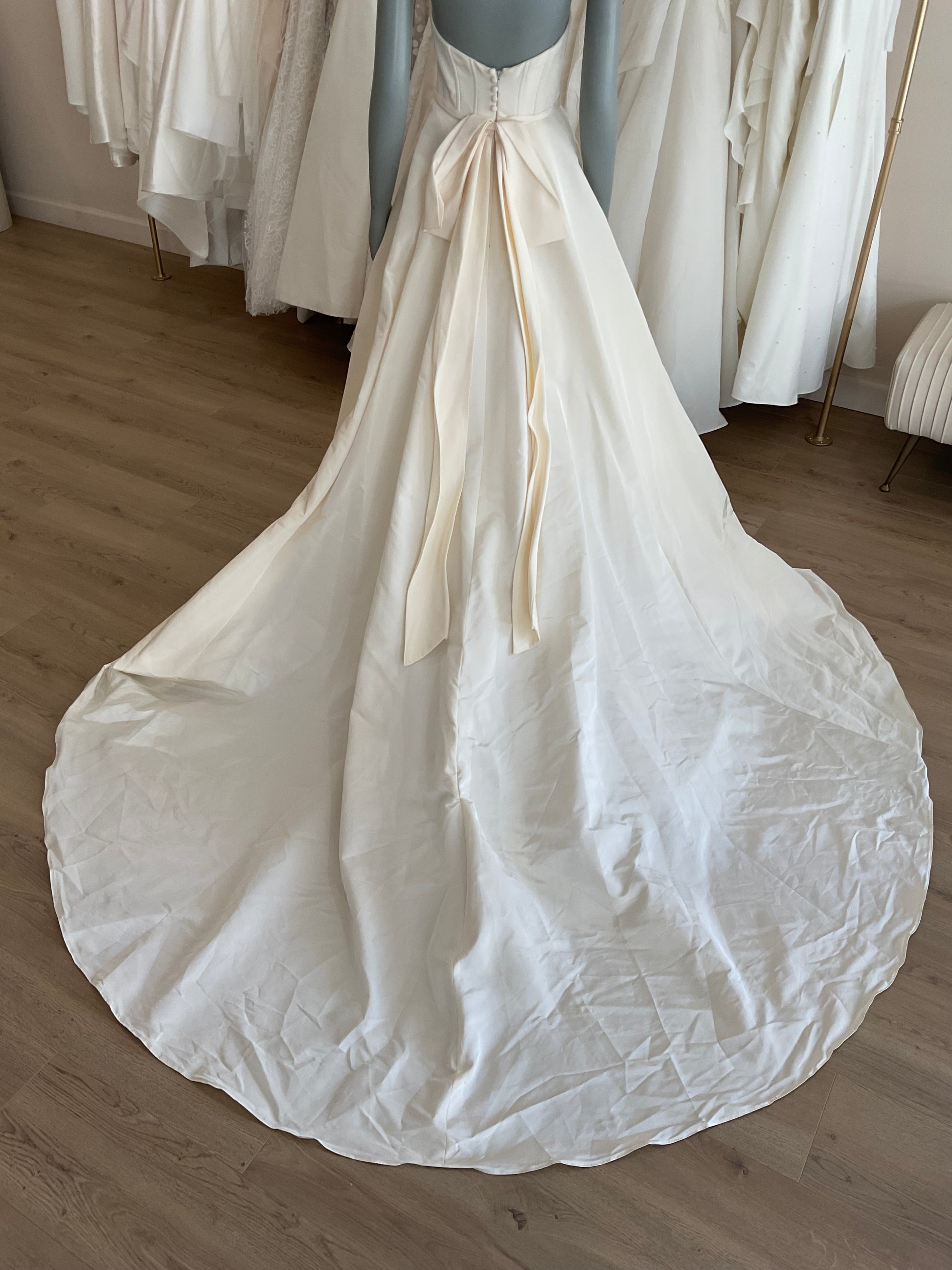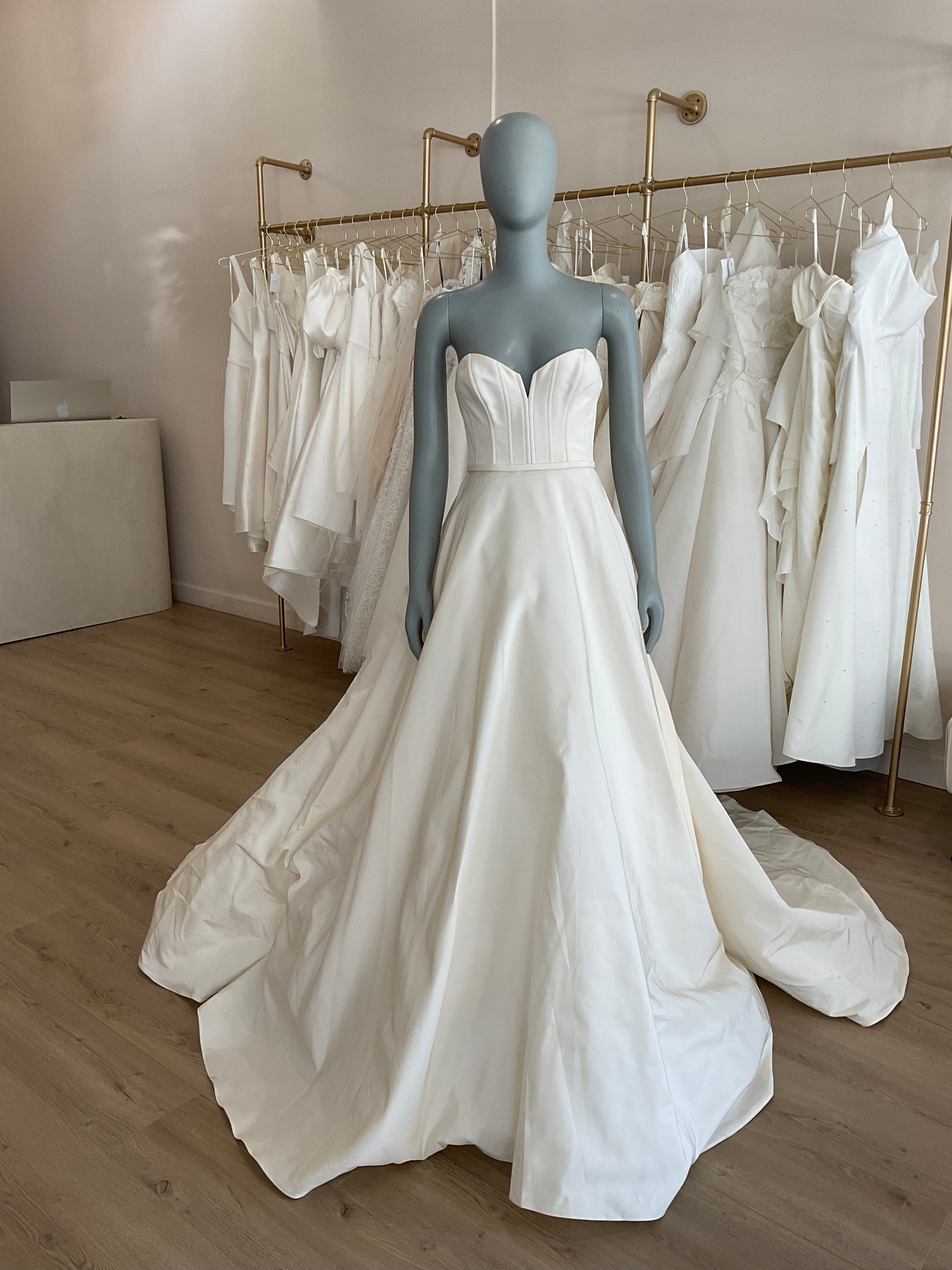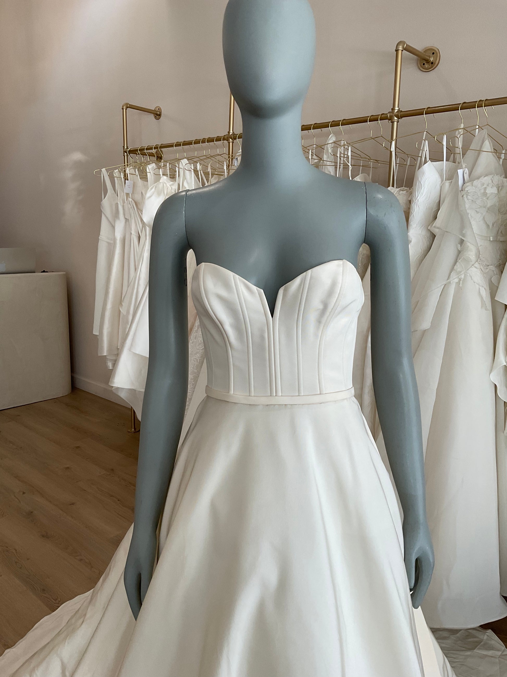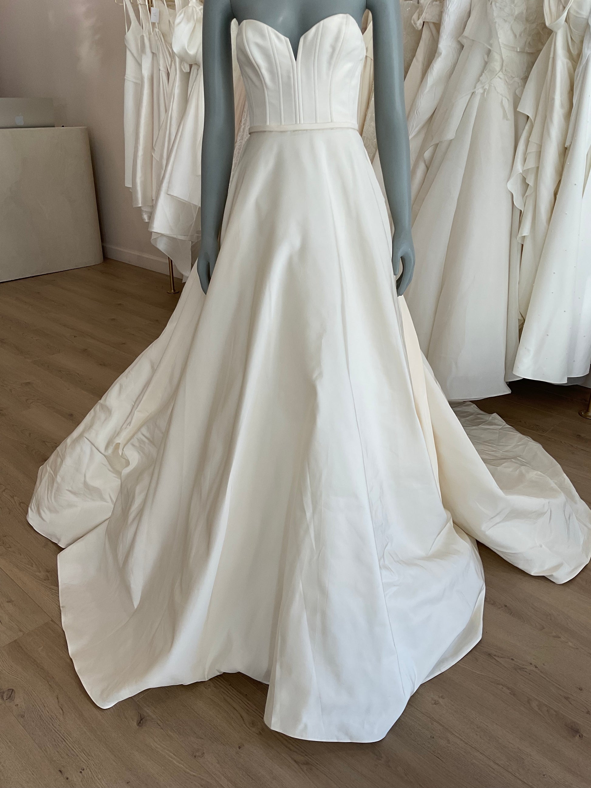 The Teddy by Amsale is a chic aline made of faille. The sweetheart neckline has a notched detail and exposed boning with a natural waist. There is no pleating in the waist which keeps the gown light with movement. This gown comes to us directly from the designer as a sample and it does not come with sleeves and train