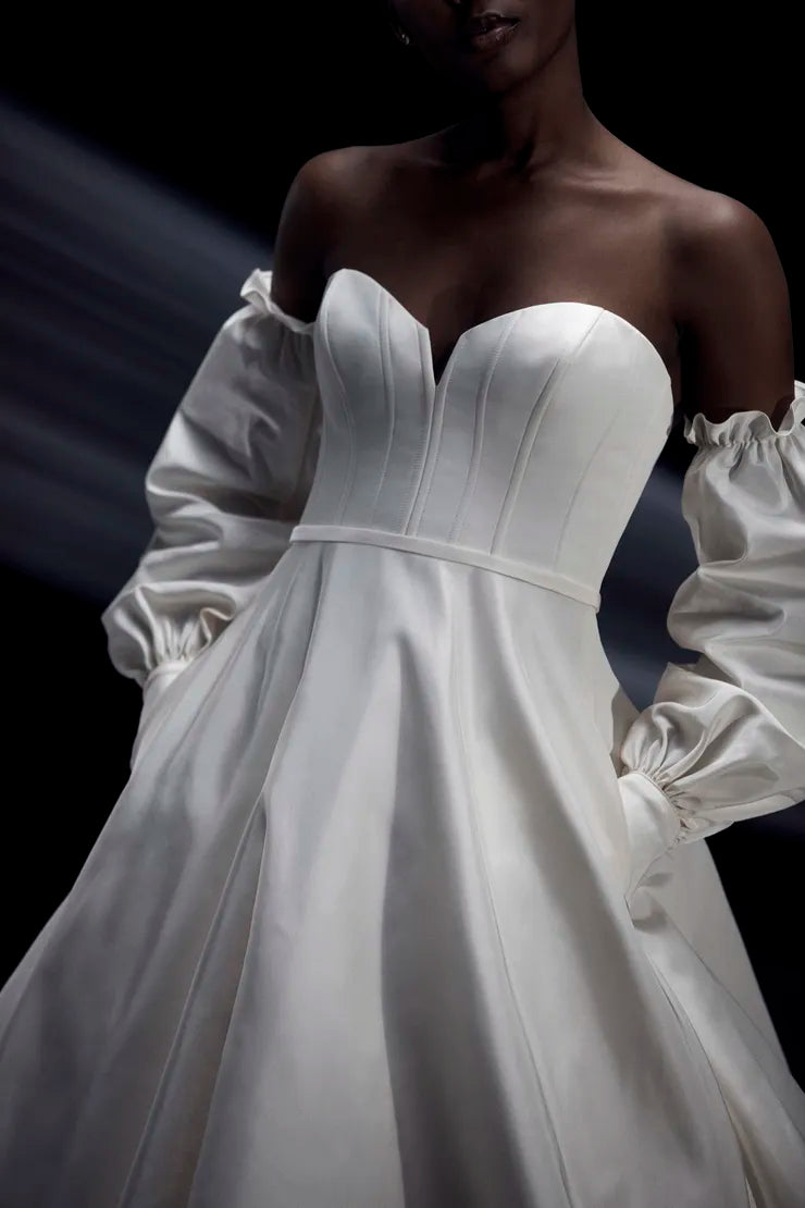 This gown comes to us directly from the designer as a sample and it does not come with sleeves and train