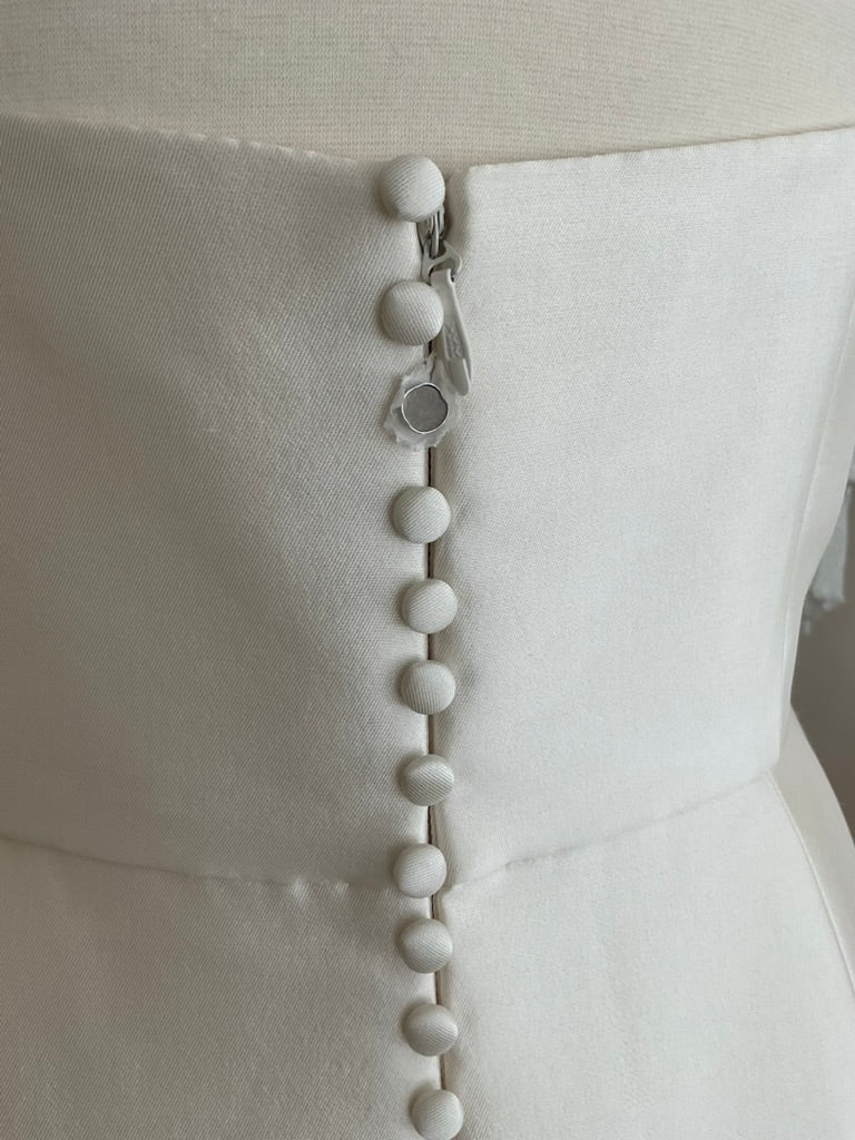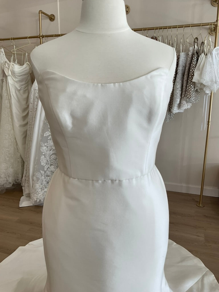 The Amsale Weston is sculpted in sleek faille, offering a strapless, fit-and-flare silhouette that exudes modern elegance. With a softly carved neckline and a row of covered buttons cascading down the back, it strikes a refined balance between architectural structure and feminine grace. Ideal for a bride seeking effortless sophistication, the gown feels timeless yet distinctly now. This gown comes to us directly from the designer as a sample.