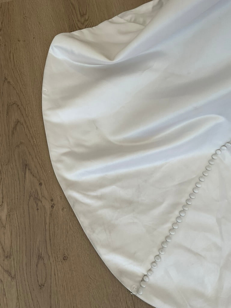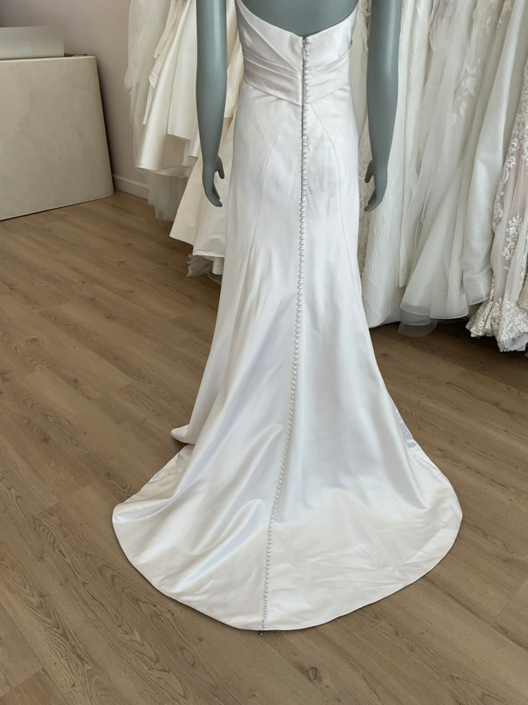 Flaws : As a sample, this gown has a few imperfections along the zipper and side seams. There is some dust along the edge of the train.