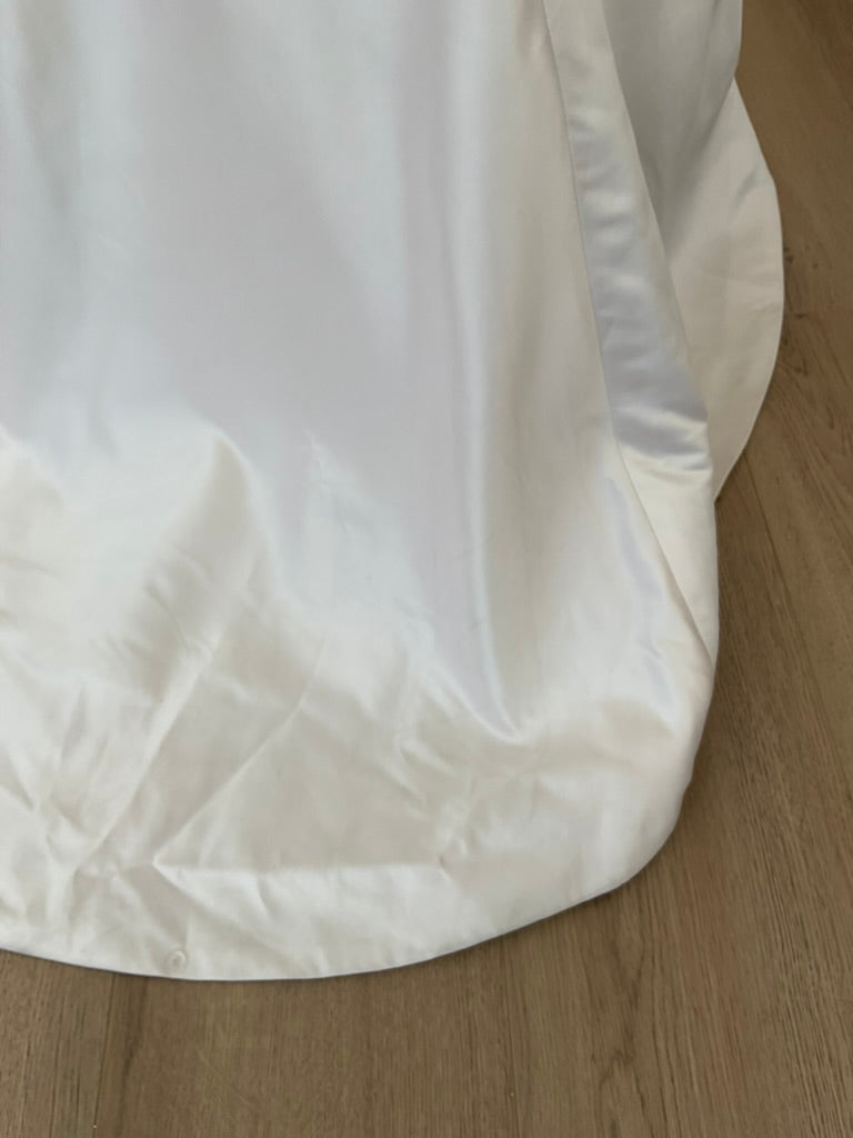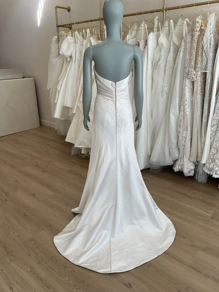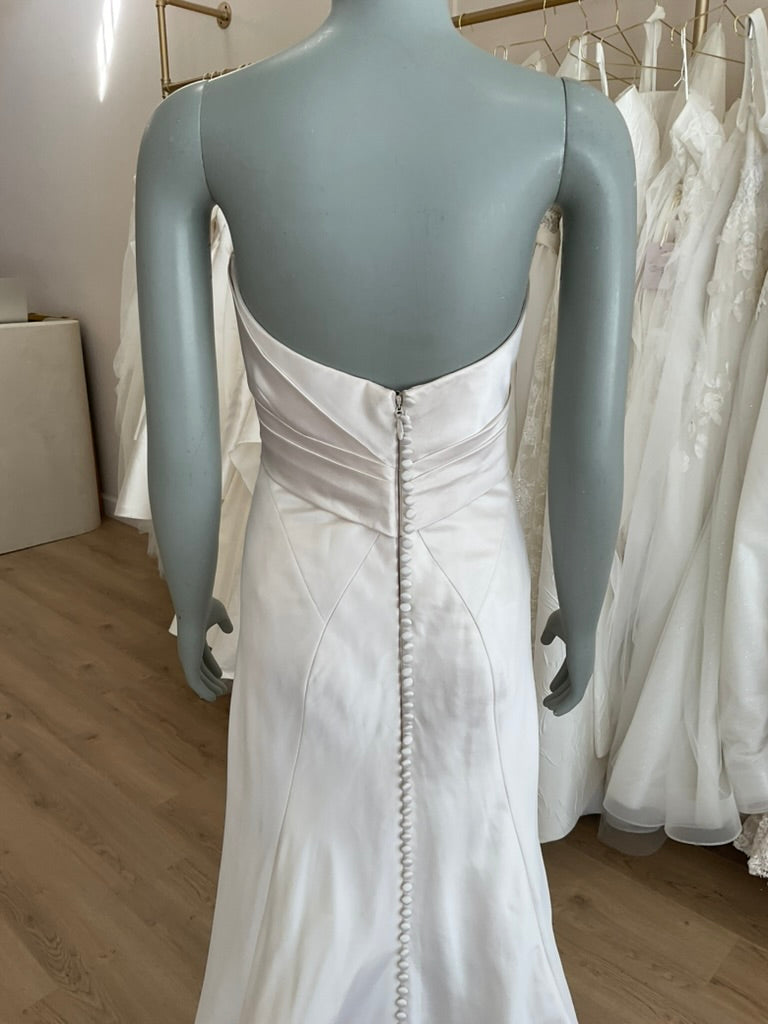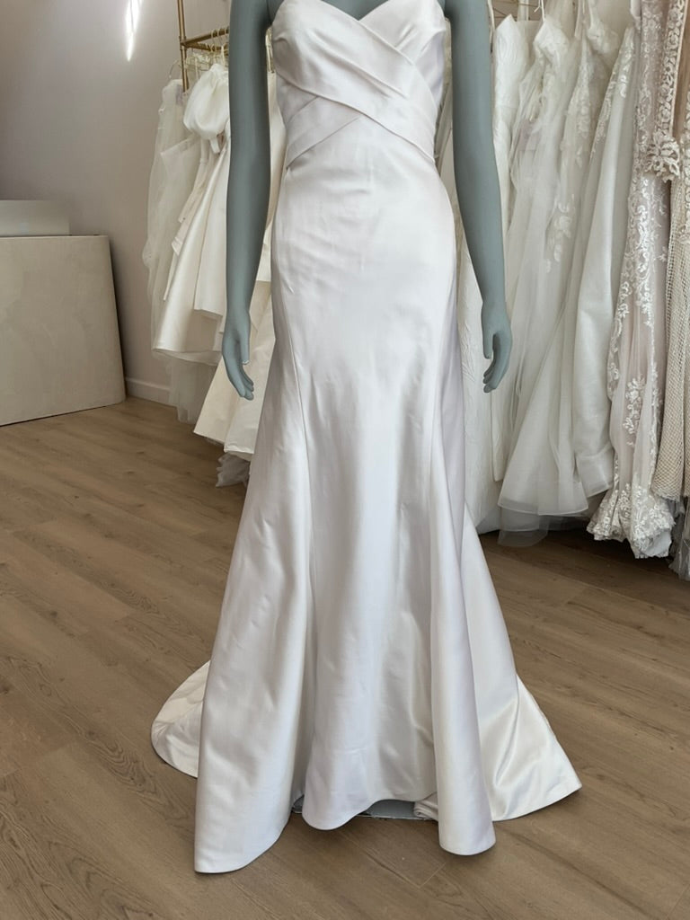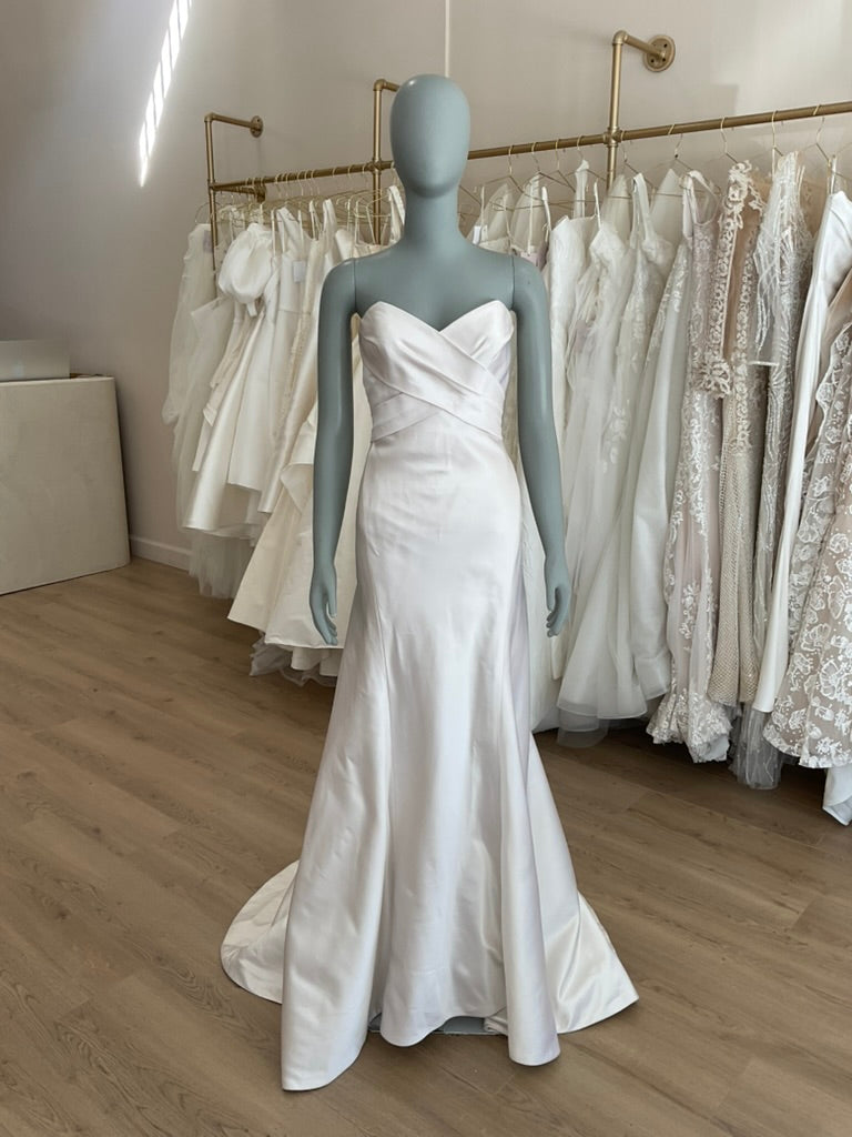 The Anna Maier Felicite gown is the epitome of timeless sophistication. Crafted in a luminous silk satin, this strapless beauty features a sculpted bodice with elegant pleating that wraps the waistline for a flattering, cinched silhouette. The sweetheart neckline adds a soft romantic touch, while the fit-and-flare shape effortlessly hugs the figure before flowing into a graceful skirt. Perfect for the bride seeking understated luxury and refined elegance. The gown is tagged as a size 10, but fits like an 8.