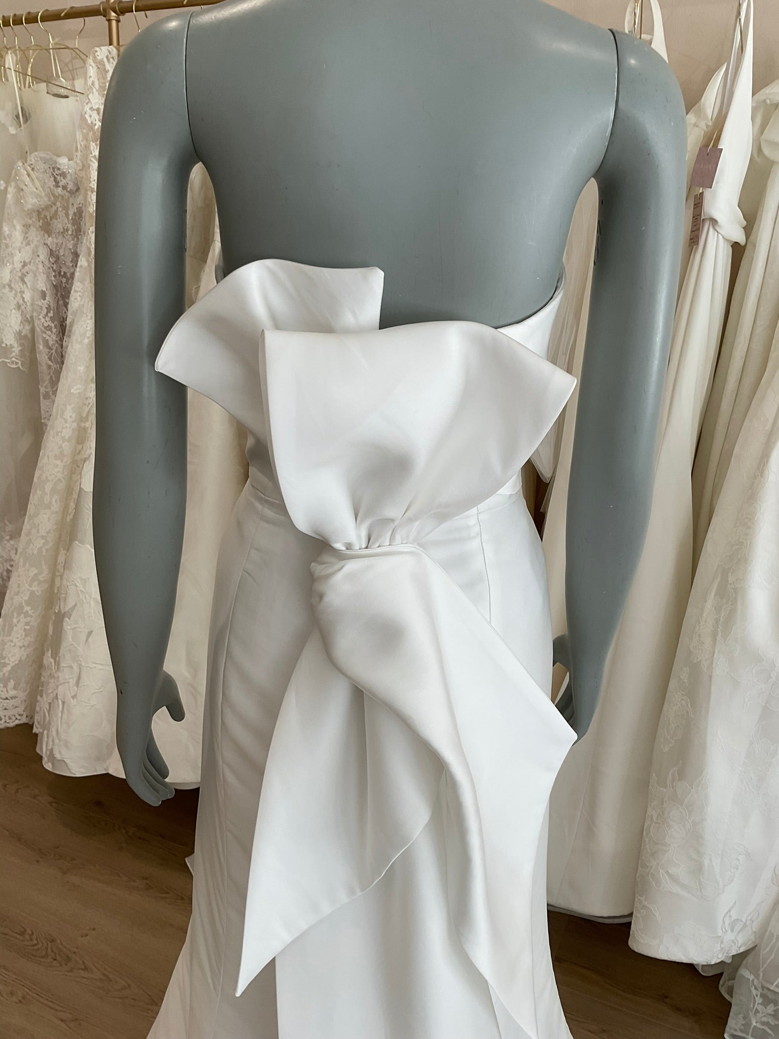 The Anne Barge Bisous is the epitome of modern sophistication with a touch of whimsical romance. This sleek, strapless fit-to-flare gown features architectural pleating across the bodice for a clean, sculptural effect that flatters the figure. Crafted from a luxurious silk stretch fabric, the silhouette hugs in all the right places before softly flaring into a chapel-length train. The back of the gown stuns with an oversized, structured bow that adds an unexpected yet elegant statement. Minimalist from the front, dramatic from the back — Bisous is perfect for the bride who wants timeless elegance with a twist.