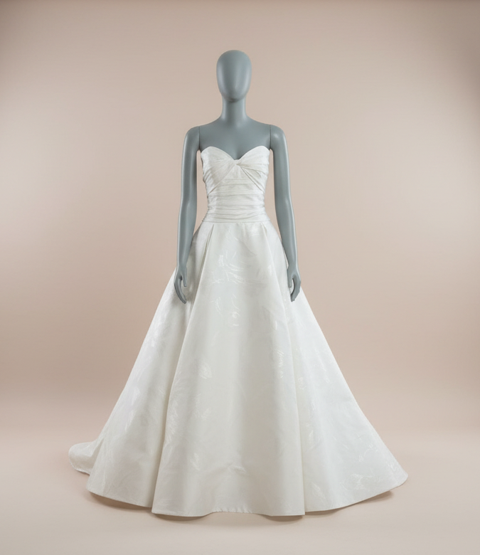 The Anne Barge Buckingham gown is a regal ballgown designed for the bride dreaming of timeless elegance. Crafted in luxe floral jacquard, the gown features a romantic sweetheart neckline with a ruched bodice that flatters and defines the waist. The full structured skirt flows into a sweeping train, adding dimension and drama while showcasing the rich texture of the fabric. The strapless silhouette and architectural pleating provide a modern update to classic bridal glamour. Perfect for a grand affair, the Buckingham gown exudes effortless sophistication with every step.