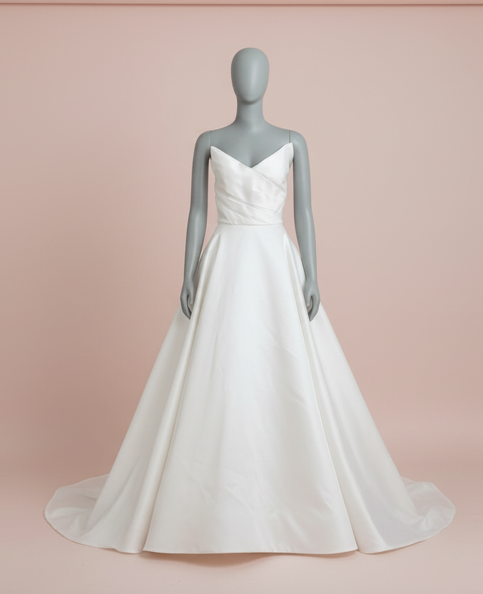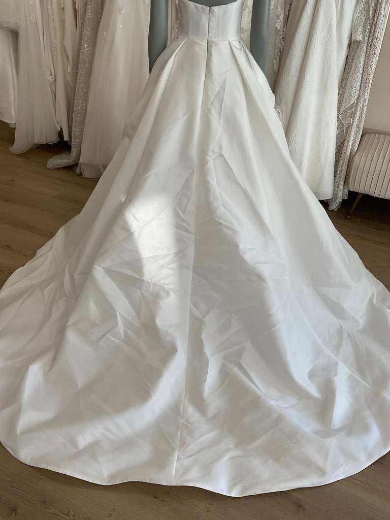 The Anne Barge Martins gown is a timeless ballgown crafted for the modern romantic. Featuring a softly draped strapless bodice with a subtle cateye neckline, this design balances classic elegance with contemporary structure. The full skirt creates a stunning visual dimension and adds a luxurious feel to the silhouette. Side pockets lend a touch of modernity and convenience, while the sweeping chapel-length train brings graceful drama from behind. Perfect for the bride seeking a sophisticated yet dimensional bridal look.