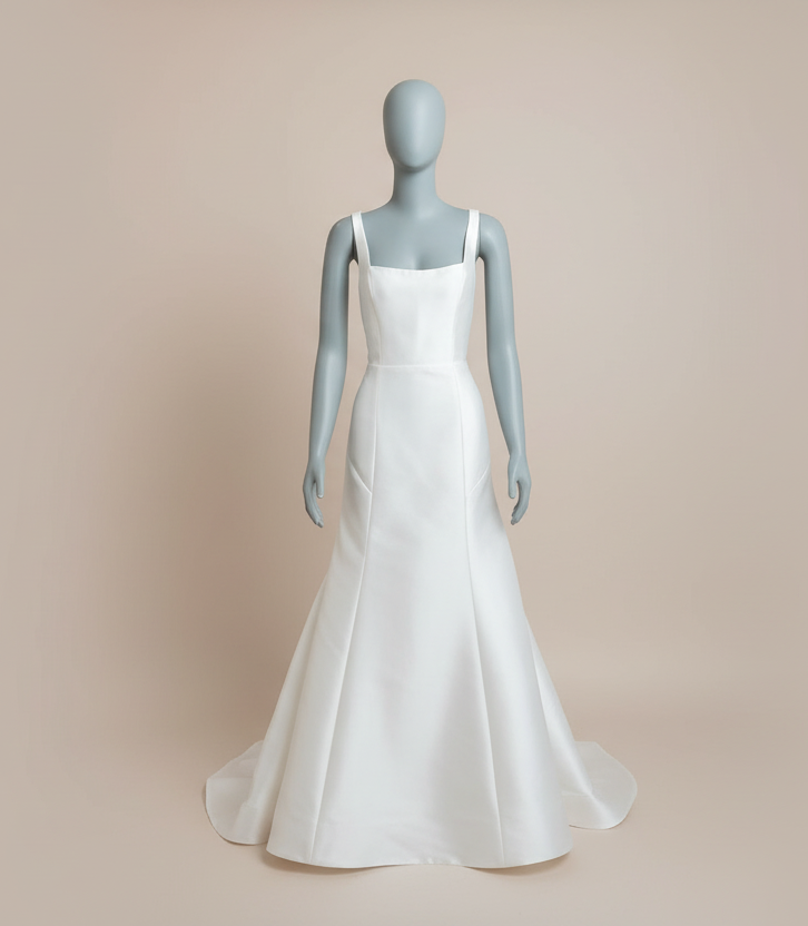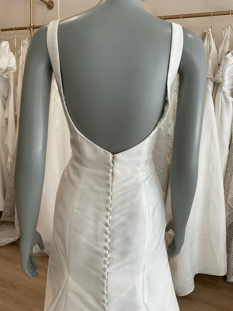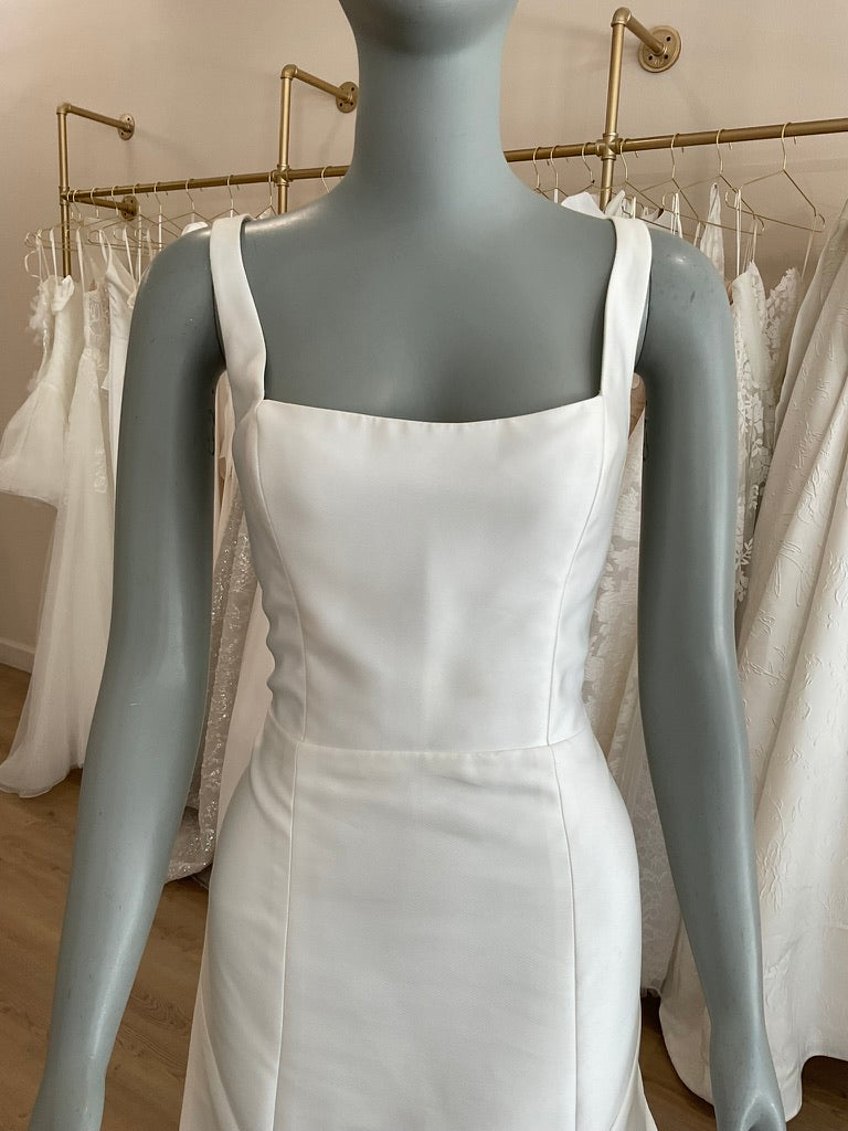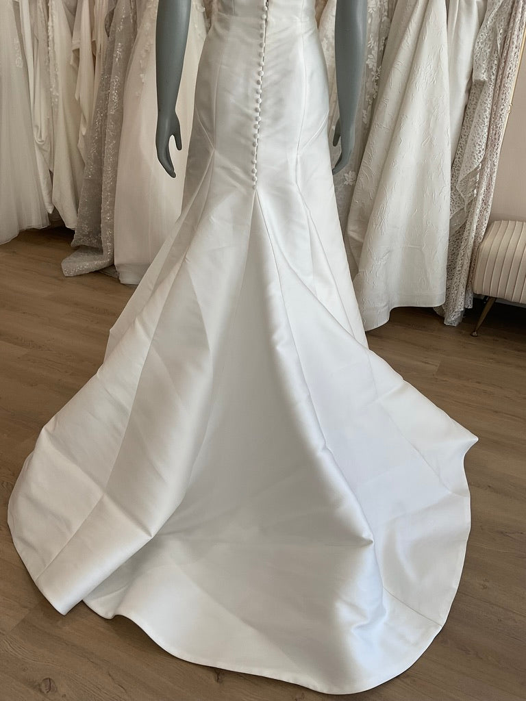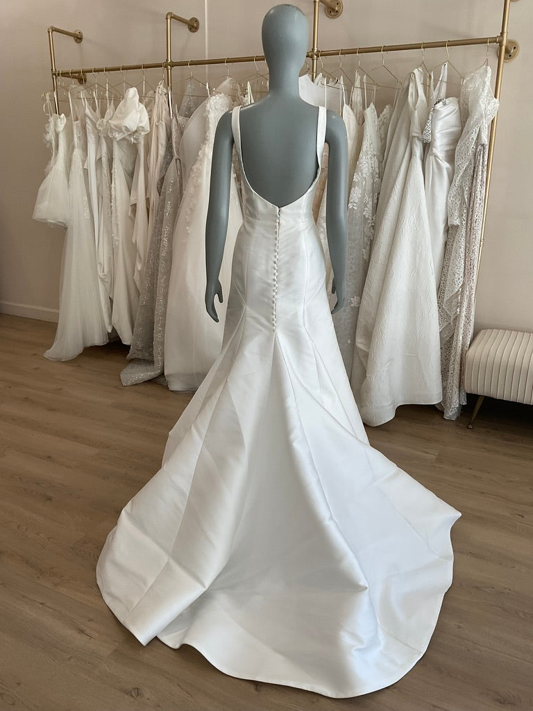 The Anne Barge Pauline is a timeless celebration of clean lines and refined elegance. Crafted from luxurious mikado scuba, this fit-and-flare gown features a modern square neckline and delicate shoulder bow details. The minimalist silhouette softly skims the figure and flares into a sweeping chapel-length train for an effortlessly graceful look. A low scoop back and a row of fabric-covered buttons add just the right amount of classic bridal romance. Ideal for the modern bride who loves a sleek, sophisticated aesthetic without sacrificing femininity.