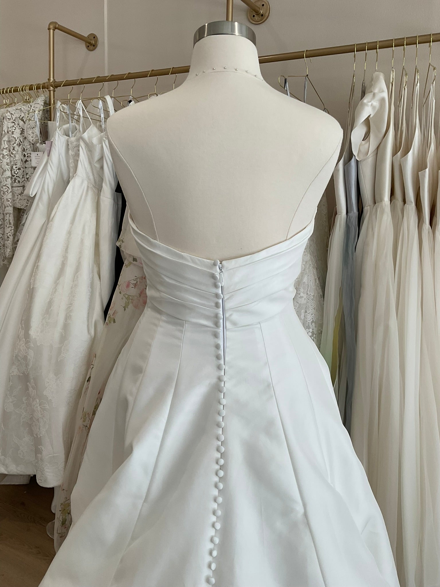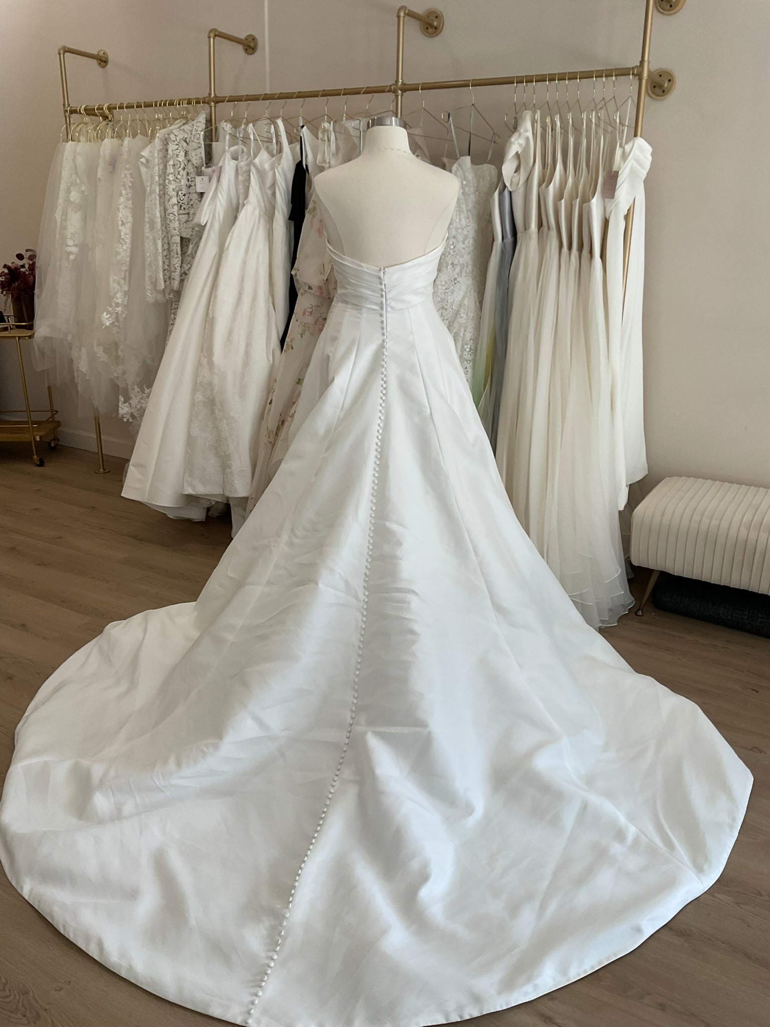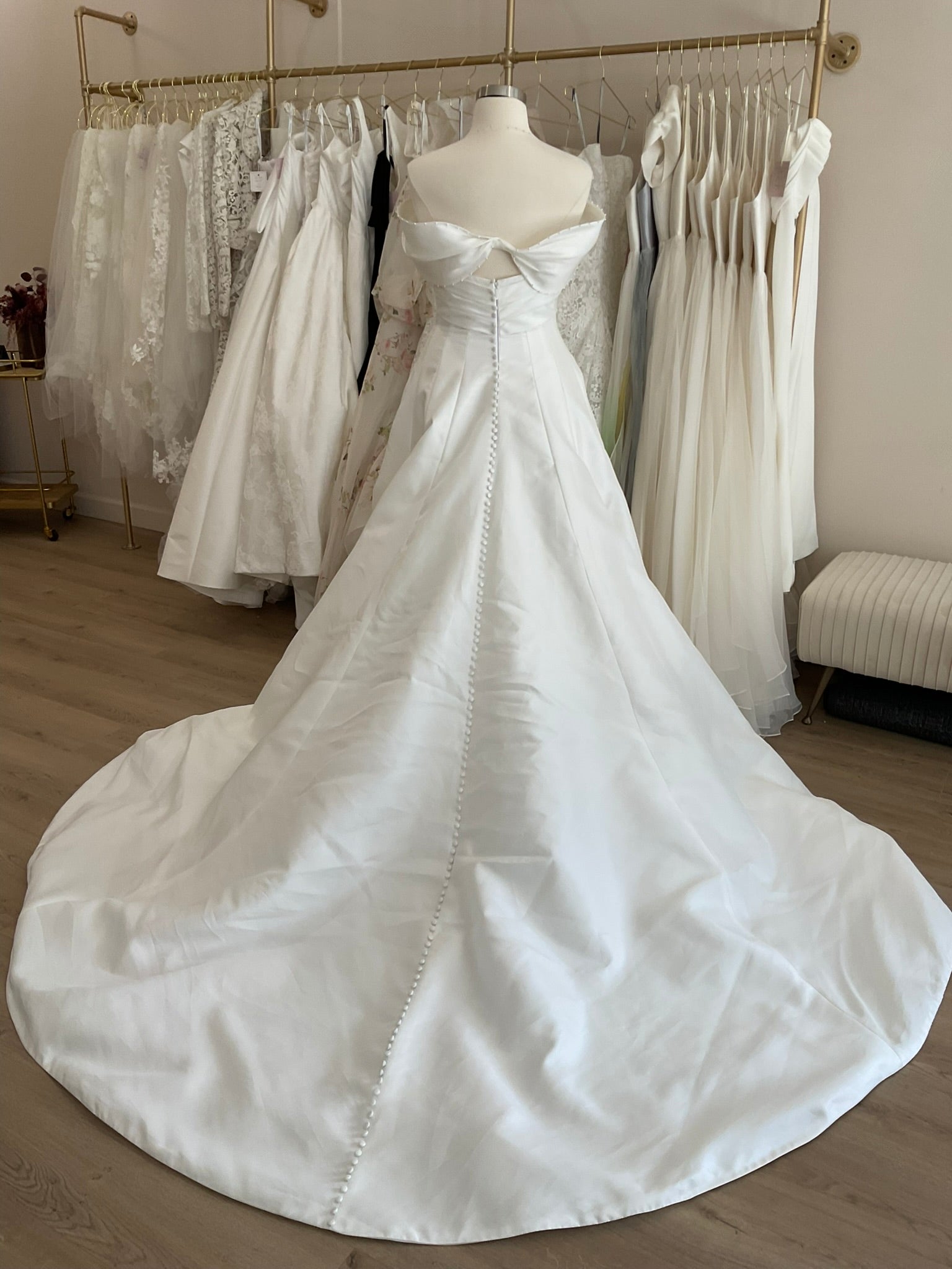 The Anne Barge Perola is a timeless and sophisticated ball gown designed for the modern romantic. Crafted from luxurious silk satin, this gown features a sculpted strapless bodice with a romantic, soft twist detail that accentuates the sweetheart neckline. The clean, structured silhouette flows into a full A-line skirt, creating a striking yet elegant presence. At the back, a trail of covered buttons cascades gracefully down the chapel-length train, adding a classic bridal touch to the minimalist design. Perfect for the bride who values refined elegance with an understated twist, the Perola is a true celebration of couture craftsmanship and timeless beauty.