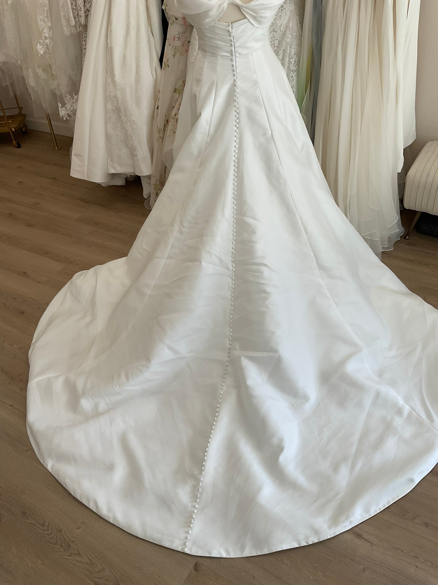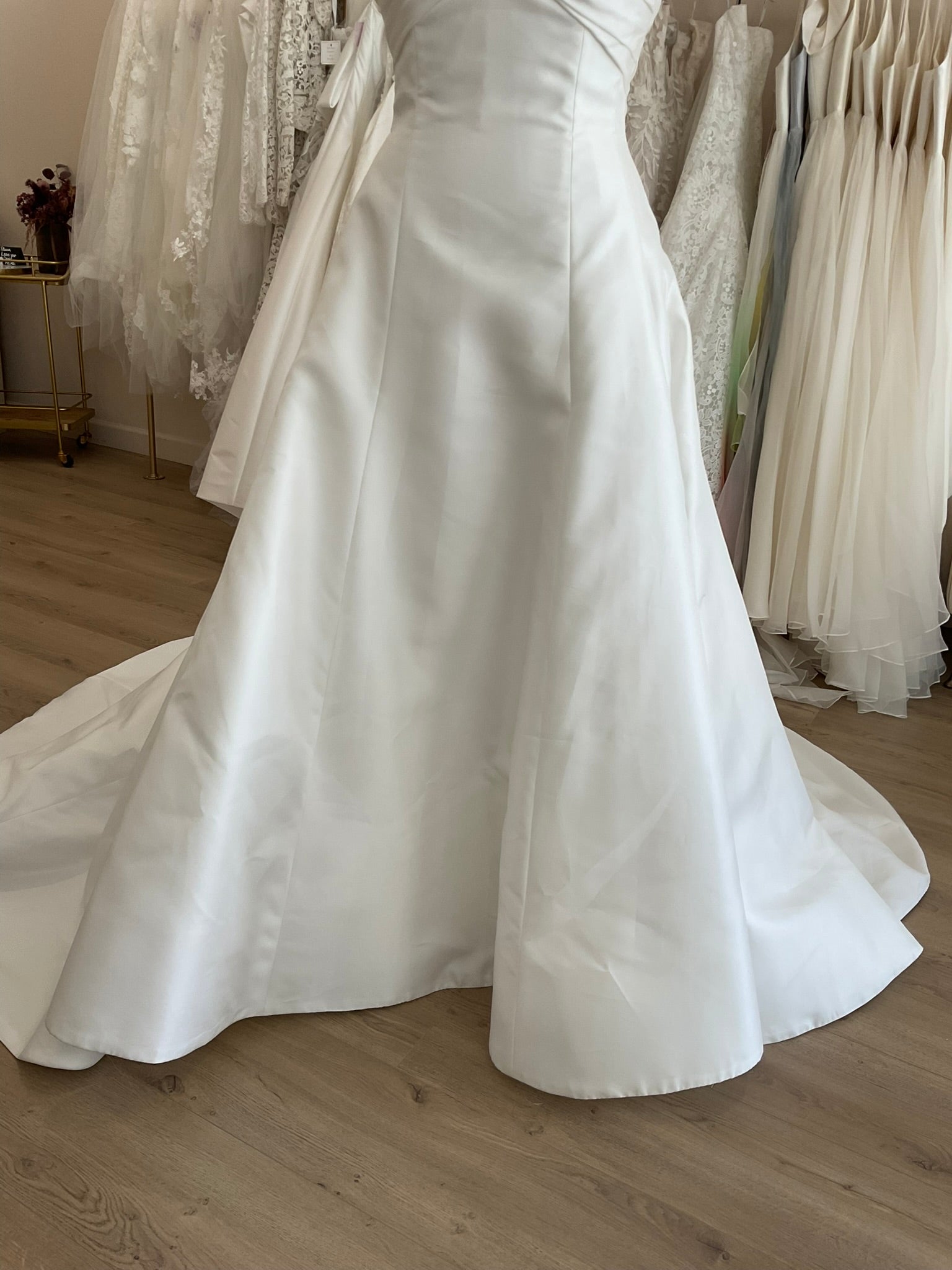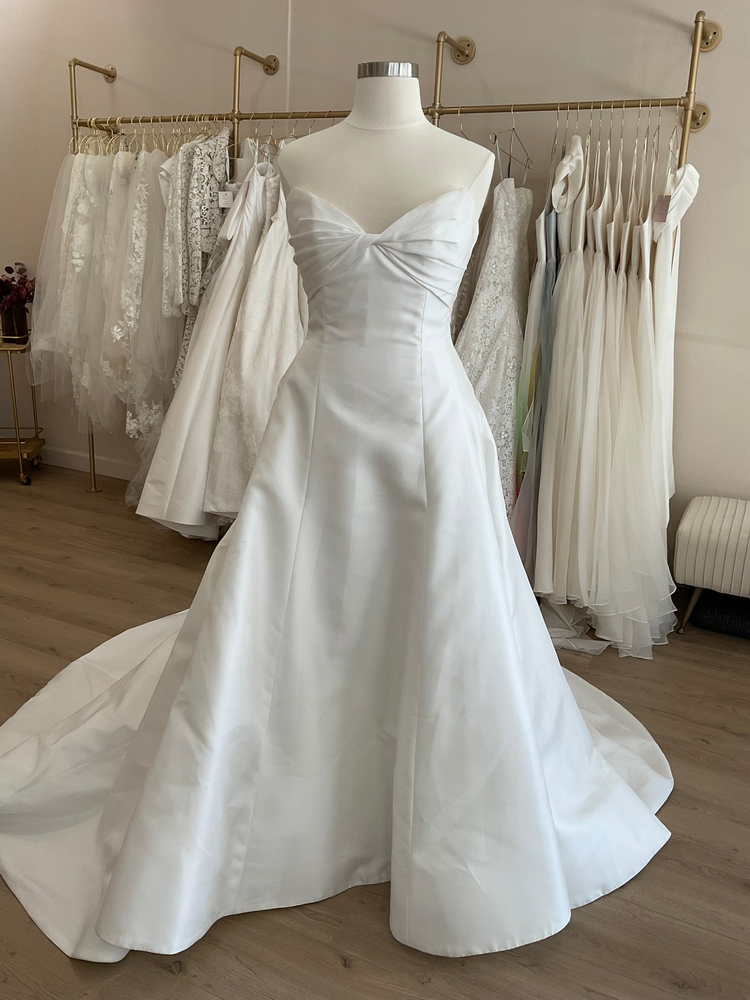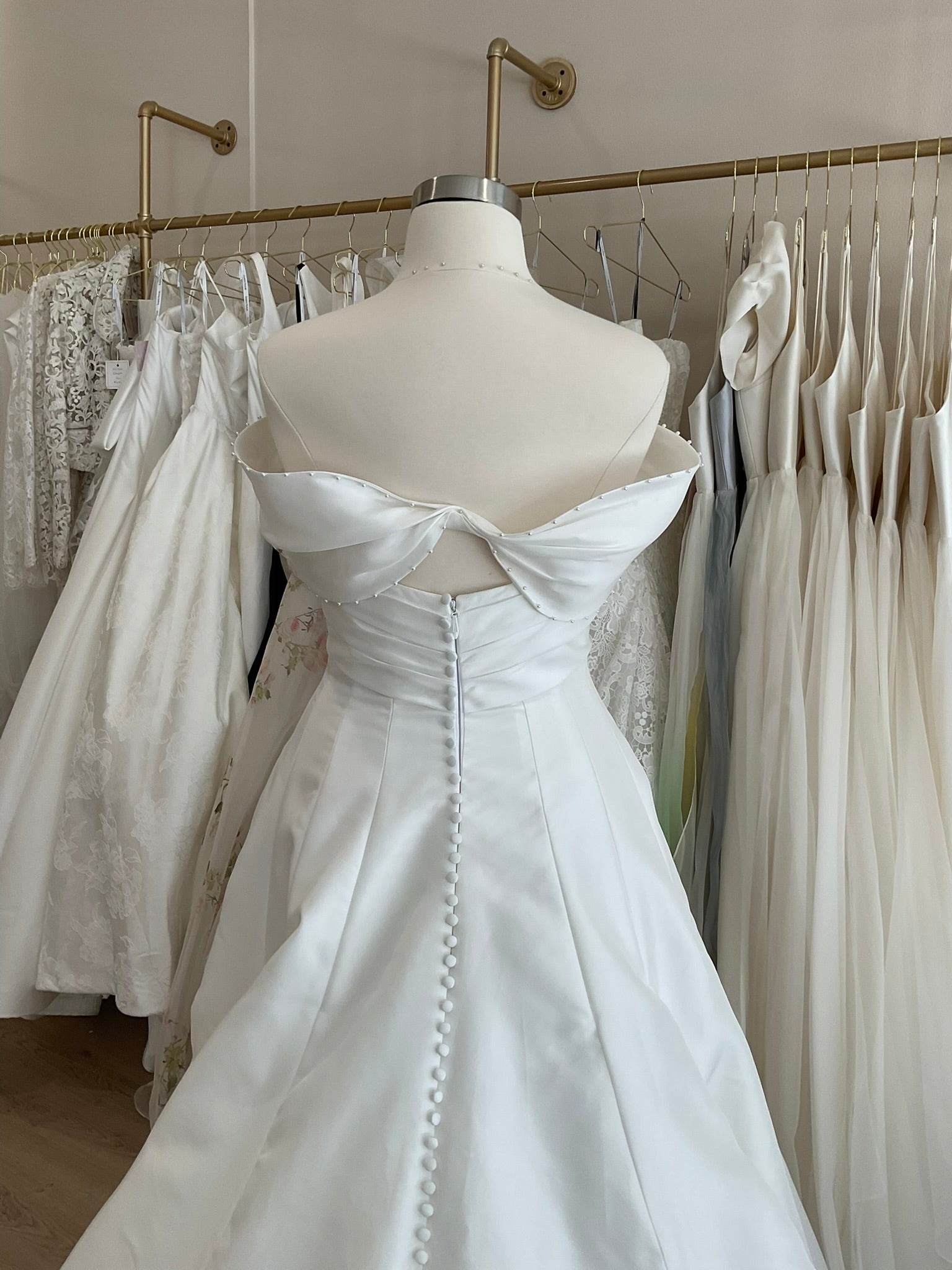 The Anne Barge Perola is a timeless and sophisticated ball gown designed for the modern romantic. Crafted from luxurious silk satin, this gown features a sculpted strapless bodice with a romantic, soft twist detail that accentuates the sweetheart neckline. The clean, structured silhouette flows into a full A-line skirt, creating a striking yet elegant presence. At the back, a trail of covered buttons cascades gracefully down the chapel-length train, adding a classic bridal touch to the minimalist design. Perfect for the bride who values refined elegance with an understated twist, the Perola is a true celebration of couture craftsmanship and timeless beauty.