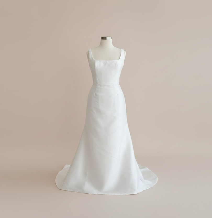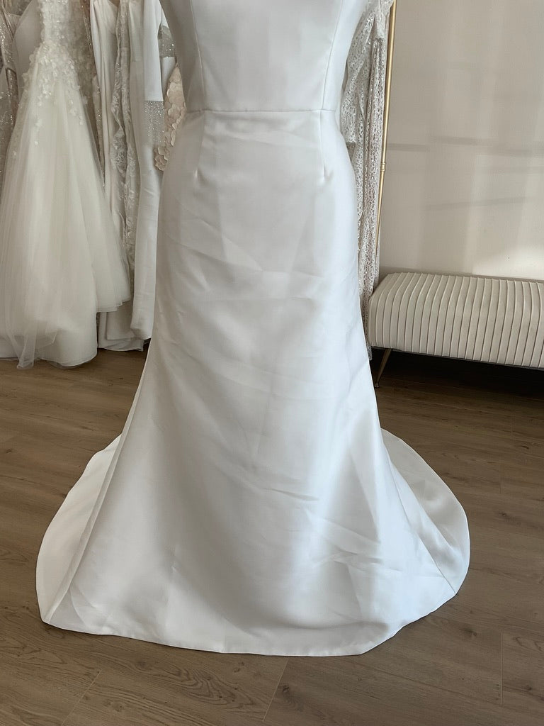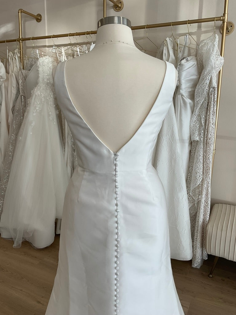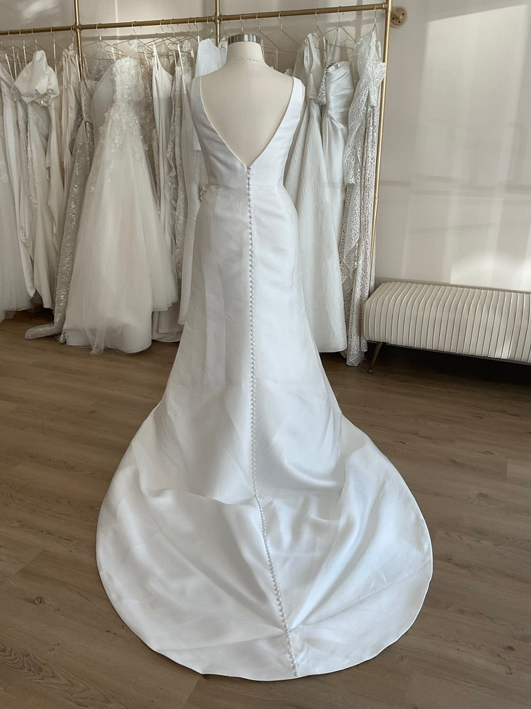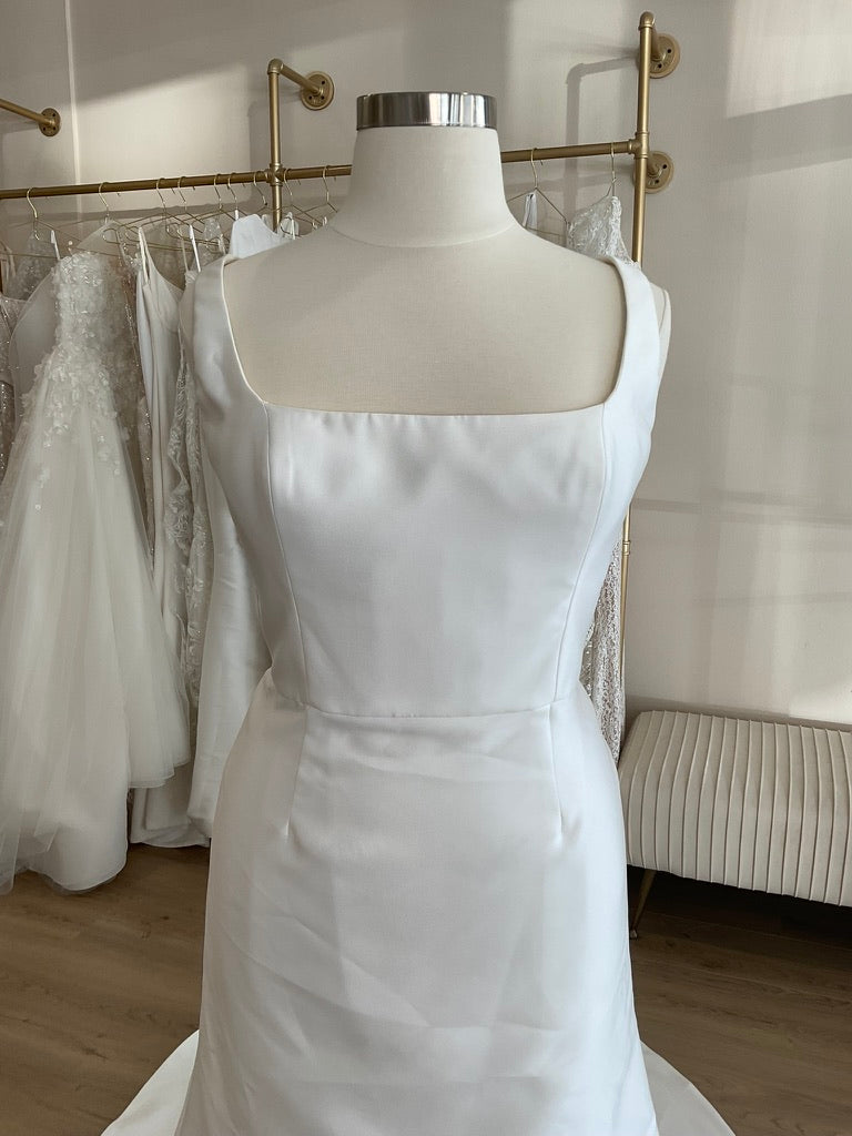 The Antonio Gual Lilly+ gown is the epitome of modern minimalism with a sultry twist. Crafted in luxurious silk mikado, this sleek sheath silhouette elongates the body with its clean lines and flawless tailoring. The square neckline is both contemporary and flattering, perfectly balancing the dramatic thigh-high slit that adds a bold, fashion-forward edge. A deep V-back adds just the right amount of allure, while the row of delicate buttons down the back enhances the gown’s timeless elegance. Finished with a sweeping chapel-length train, the Lilly+ is perfect for the bride seeking sophistication with subtle drama.