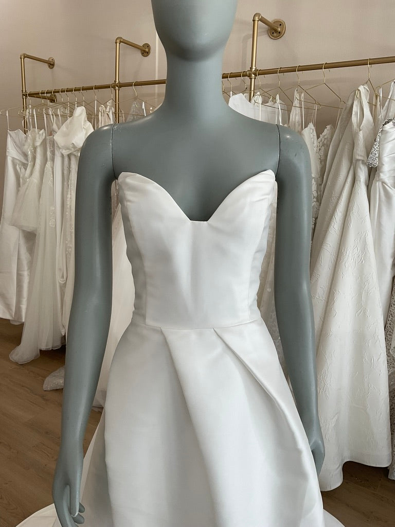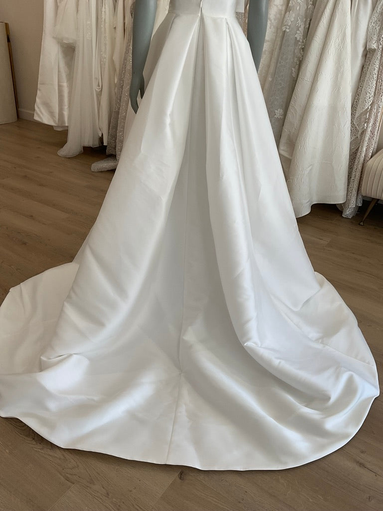 The Blue Willow Toulouse is a timeless A-line gown designed for the modern romantic. Crafted in luminous silk mikado, the structured bodice features a strapless, sweetheart neckline that flatters the décolletage and adds a touch of classic sophistication. The expertly tailored pleats create a soft wrap effect through the skirt, adding depth and elegance, while the thigh-high slit provides just the right amount of edge. At the back, a delicate layer of pearl-dotted tulle cascades from off-the-shoulder draping for an ethereal, barely-there sleeve effect. The sweep train flows effortlessly for a dramatic walk down the aisle. This dress blends crisp tailoring with soft, feminine details—perfect for a stylish bride seeking elegance with a twist. Bonus detail: it has pockets!