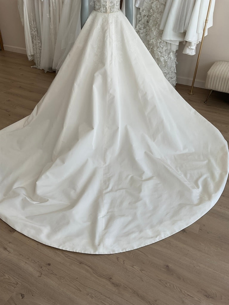 Info: The Pandora by Carolina Herrera is a classic aline. The soft sweetheart bodice is layered with a delicate swiss dot and macrame lace detail that tapers past the natural waist. The silk faille skirt is an effortless fabric for movement and structure. The gown has a chapel length train. This gown is a sample and does need to have the zipper replaced.