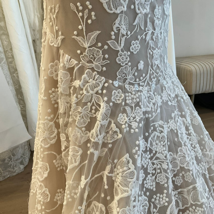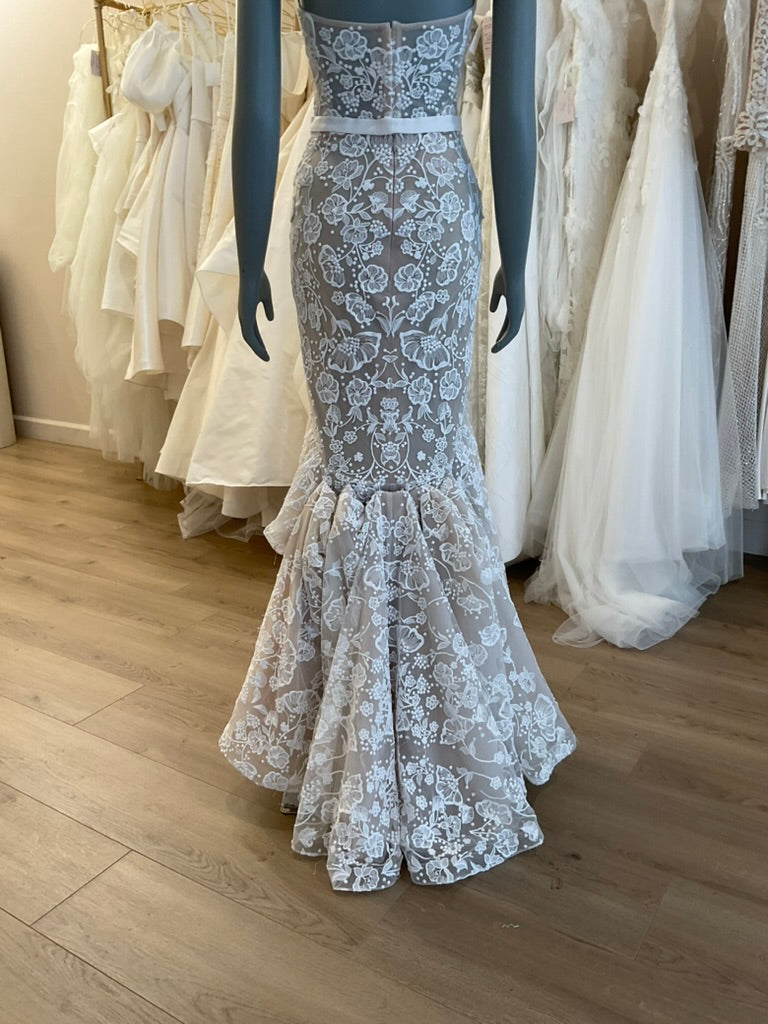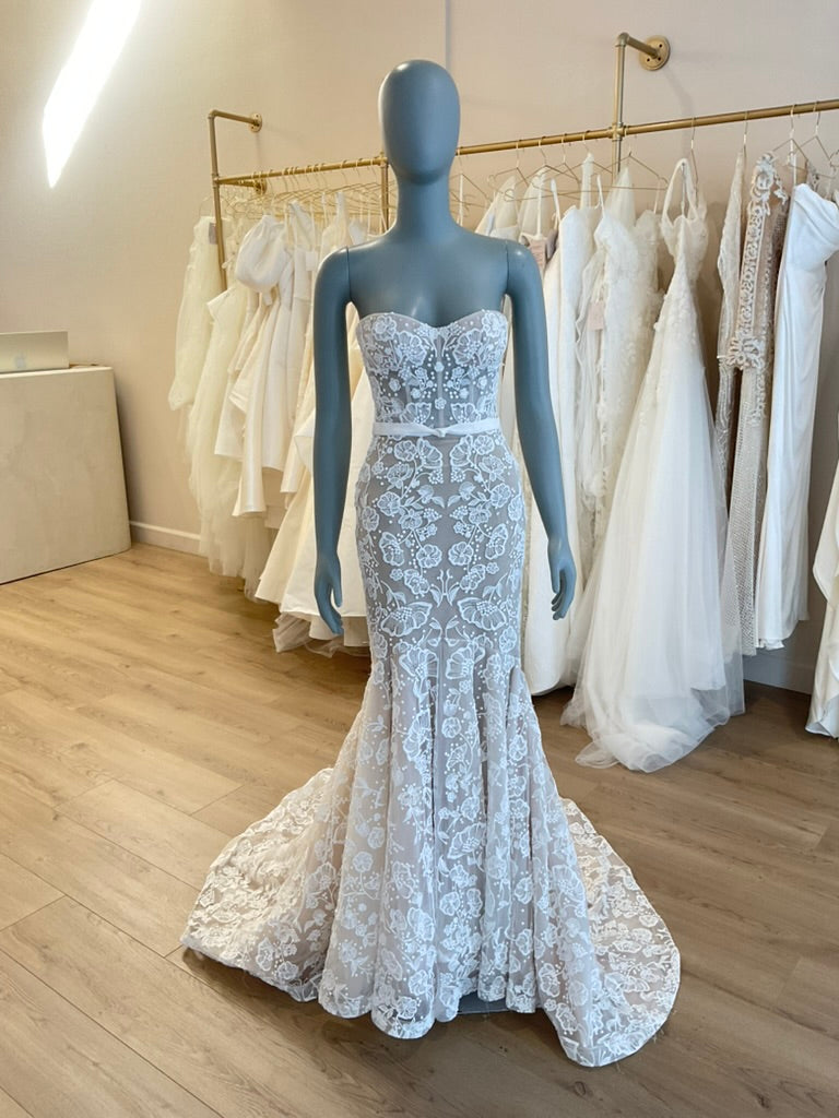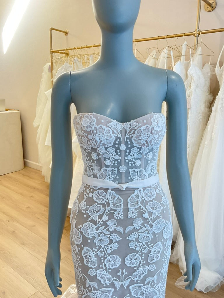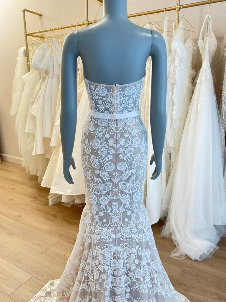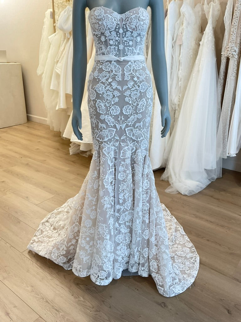 The Eisen Stein Grace is a breathtaking blend of romance and elegance, perfect for the modern bride who dreams of timeless glamour. This strapless gown features a structured bodice adorned with intricate floral lace and subtle boning, creating a flattering and secure fit. The soft sweetheart neckline adds a touch of femininity, while the fitted silhouette flares gently into a mermaid-style skirt for a graceful and elongated look. The lace detailing continues throughout the skirt and into the sweeping train, adding depth and texture. A delicate satin waistband accentuates the natural waist, offering the perfect finishing touch. Effortlessly chic and undeniably romantic, the Grace exudes elevated simplicity and timeless sophistication.