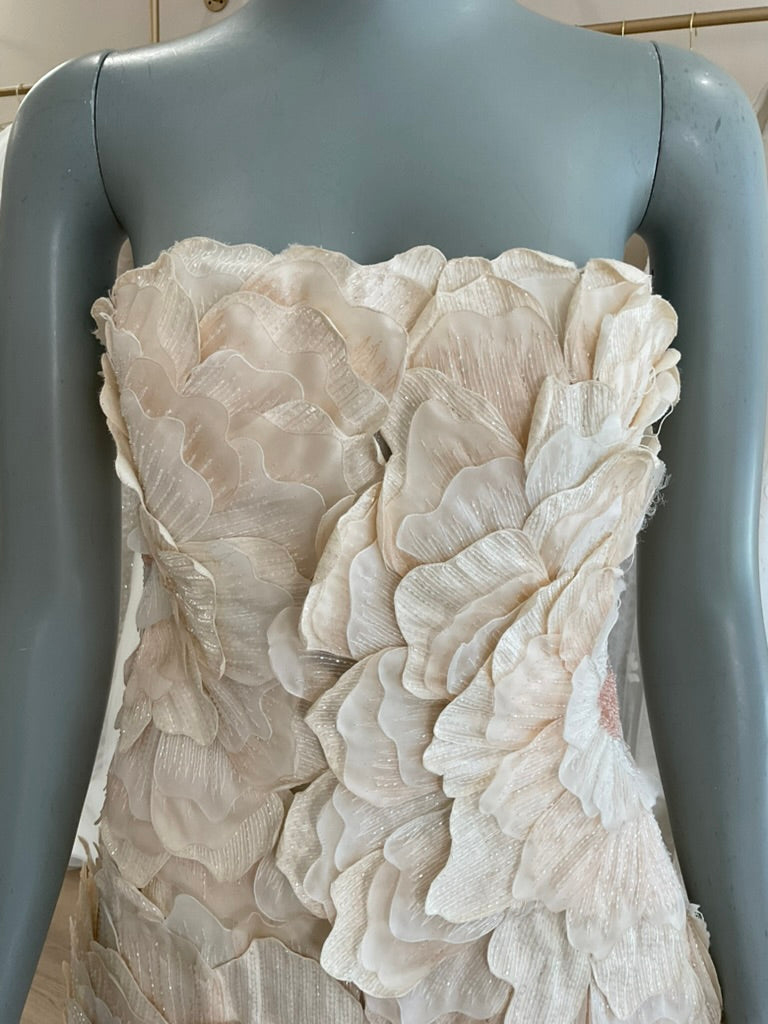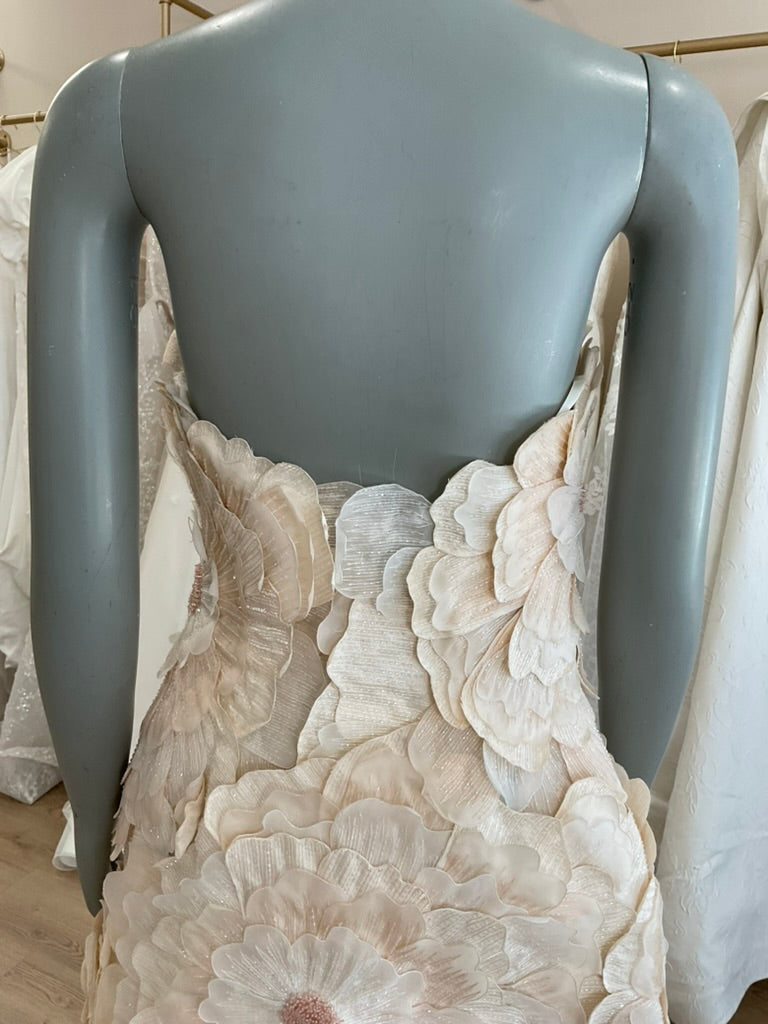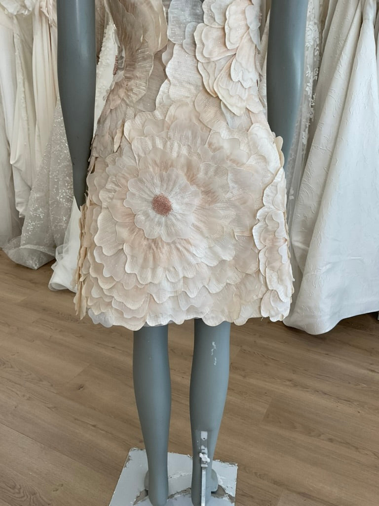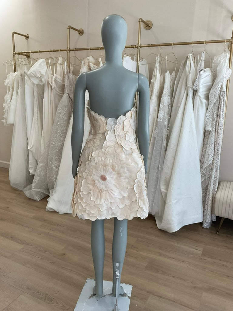 The Enaura Rhodes dress is a show-stopping mini for the modern bride who’s ready to make a bold statement. This strapless silhouette is adorned with oversized, hand-appliquéd floral motifs crafted from shimmering organza and textured fabric for a rich, dimensional effect. Each petal is carefully layered to create a blooming, sculptural look that catches the light from every angle. The fitted bodice hugs the waist, while the short hemline adds a playful twist—perfect for a reception change or a fashion-forward ceremony. The Rhode is a celebration of artistry, femininity, and fearless bridal style.
