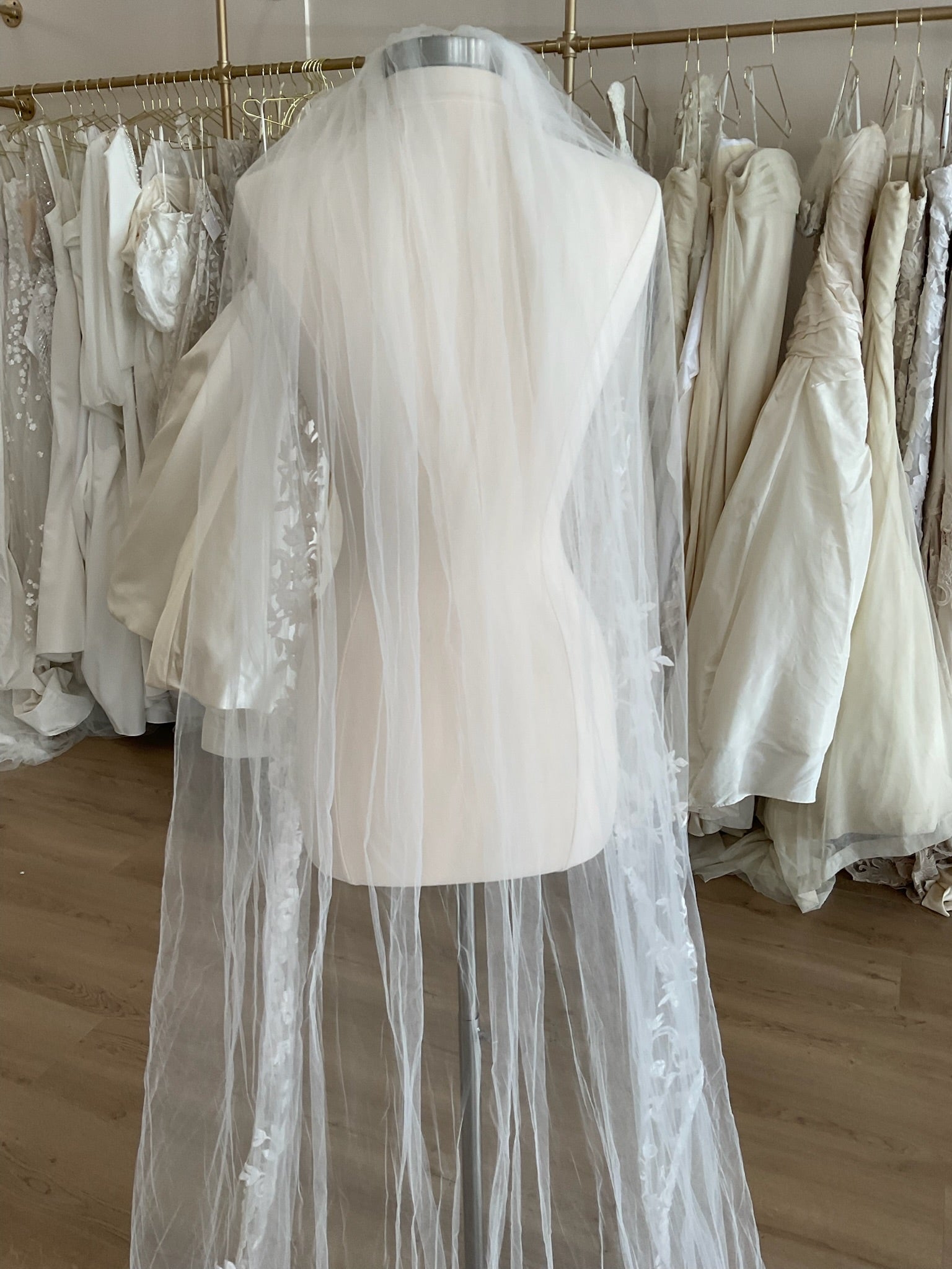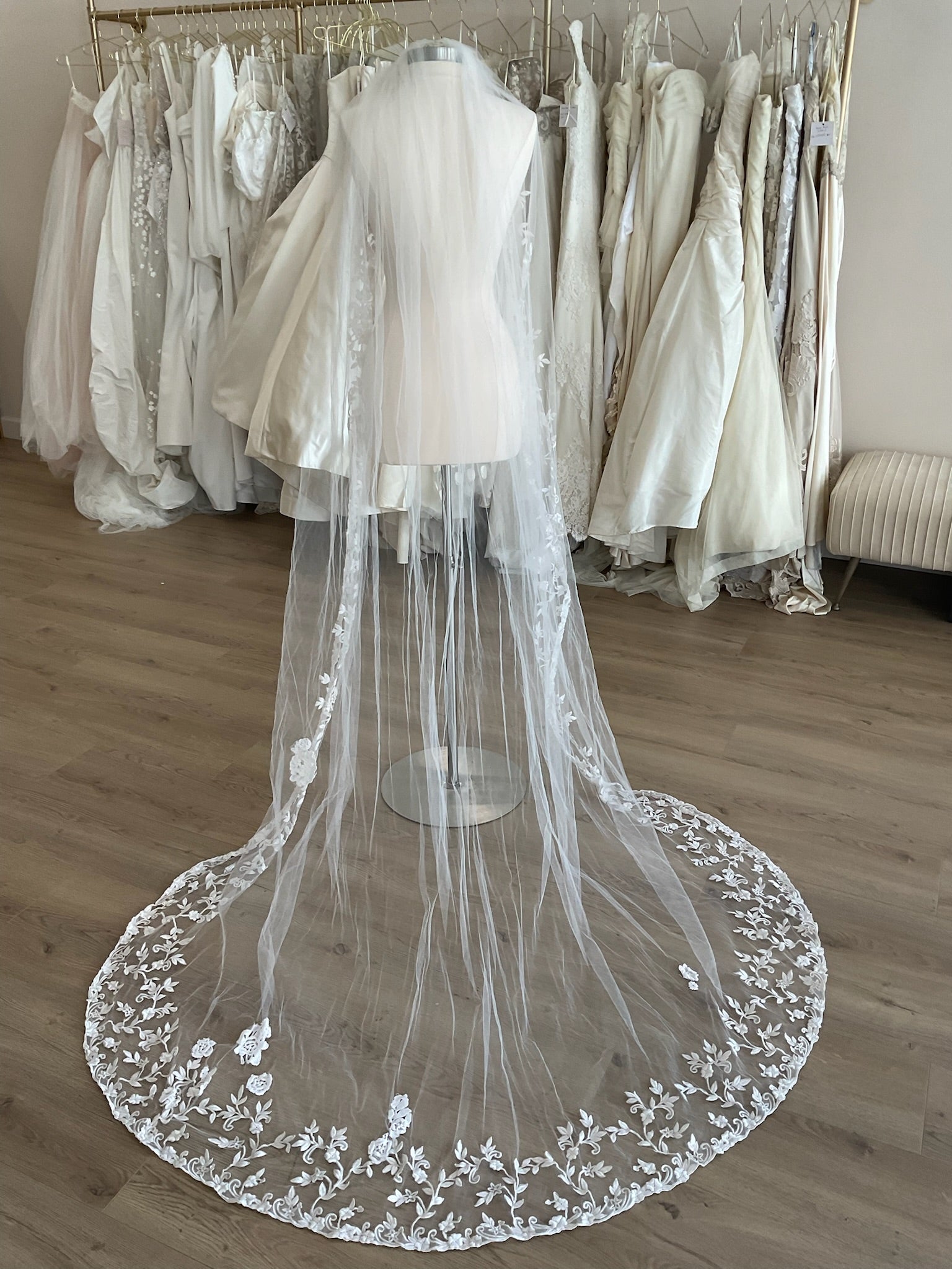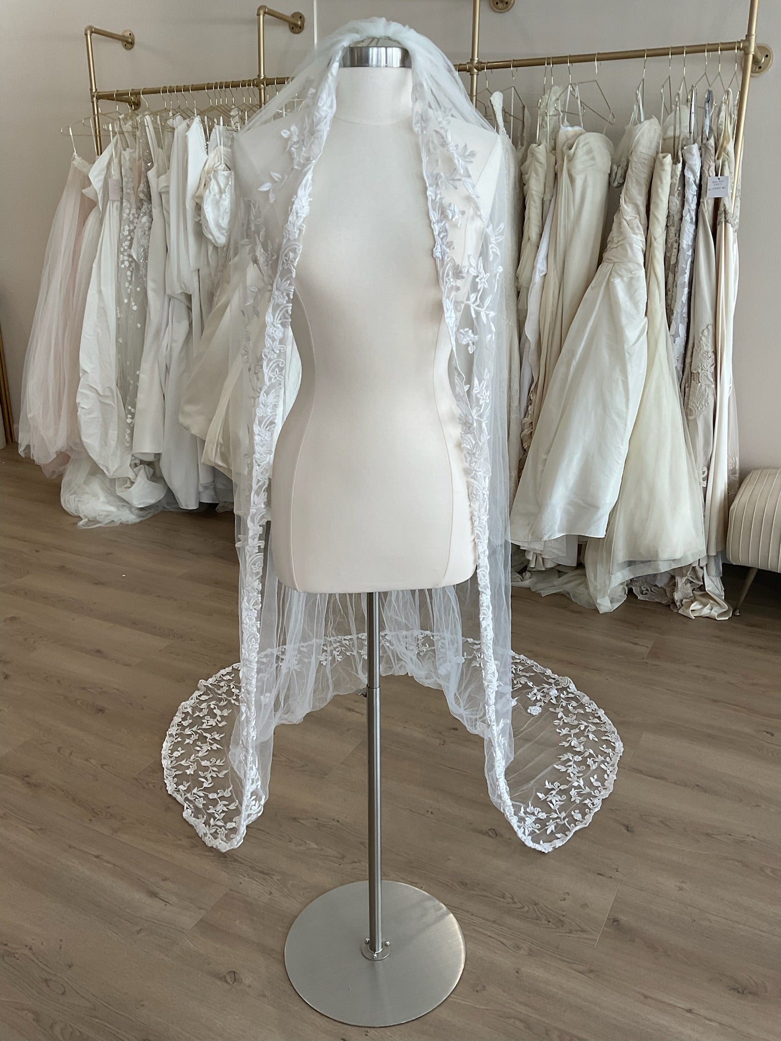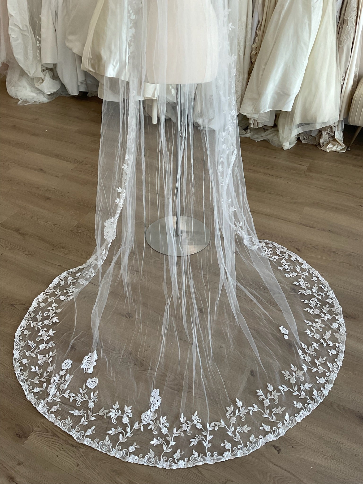 This single layer chapel length ivory veil has a beautiful floral applique that starts at the top of the comb and trims the entirety of the veil. The veil is 93'' long.