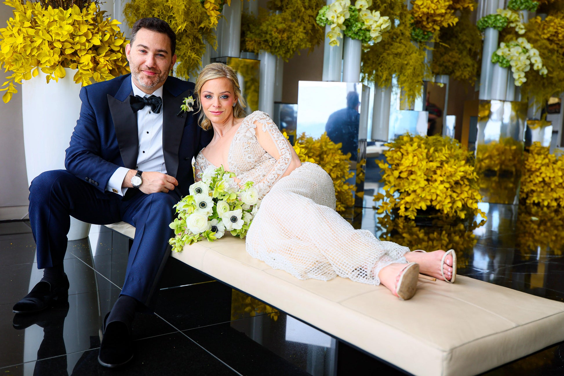 The Galia Lahav Bella is a daring and luxurious gown for the bride who wants to make an unforgettable entrance. Designed in shimmering beaded fabric that hugs every curve, this glamorous mermaid silhouette features an illusion deep V neckline framed by intricate floral appliqué and delicate cap sleeves. The moderately sheer bodice showcases exposed corsetry, adding both structure and shape. The drama continues in the back with a stunning open illusion panel framed by ornate lace and long, embellished sleeves leading into a sparkling fitted skirt. A delicate sweep train finishes the look with timeless elegance. Bella is a bold blend of sensuality and sophistication.