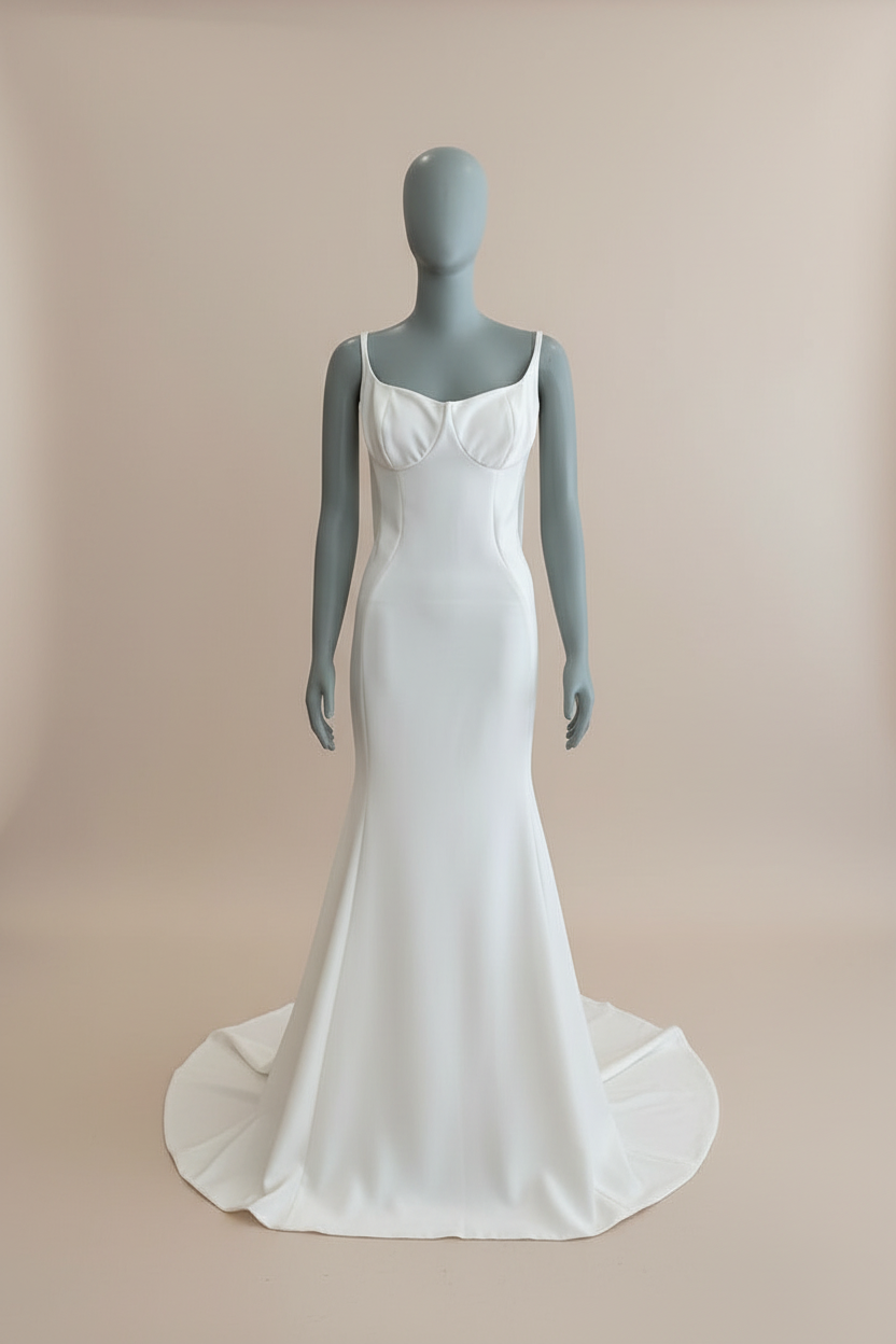 The Galia Lahav Dia is a sleek and romantic option for the modern minimalist bride. Crafted in a luxurious silk-like fabric, this fitted gown follows the body's natural curves with an effortlessly elegant silhouette. The structured bodice features a soft scoop neckline with delicate gathered shoulder ties that add a playful, feminine touch. The back stuns with a dramatic draped cowl that cascades into a low open detail, framed by sheer side panels for added intrigue. The skirt flows into a gentle train, offering graceful movement and timeless sophistication for your walk down the aisle.
