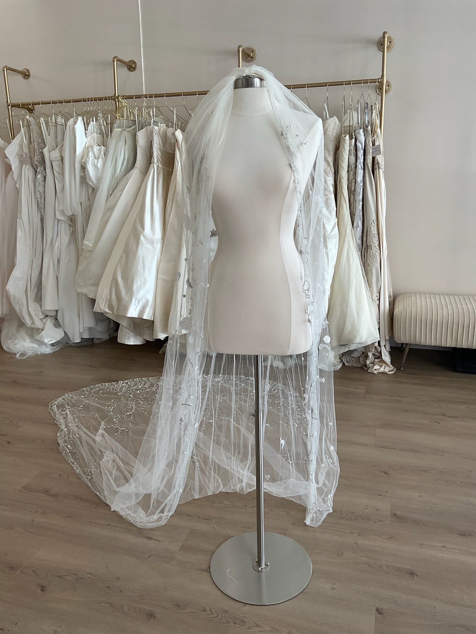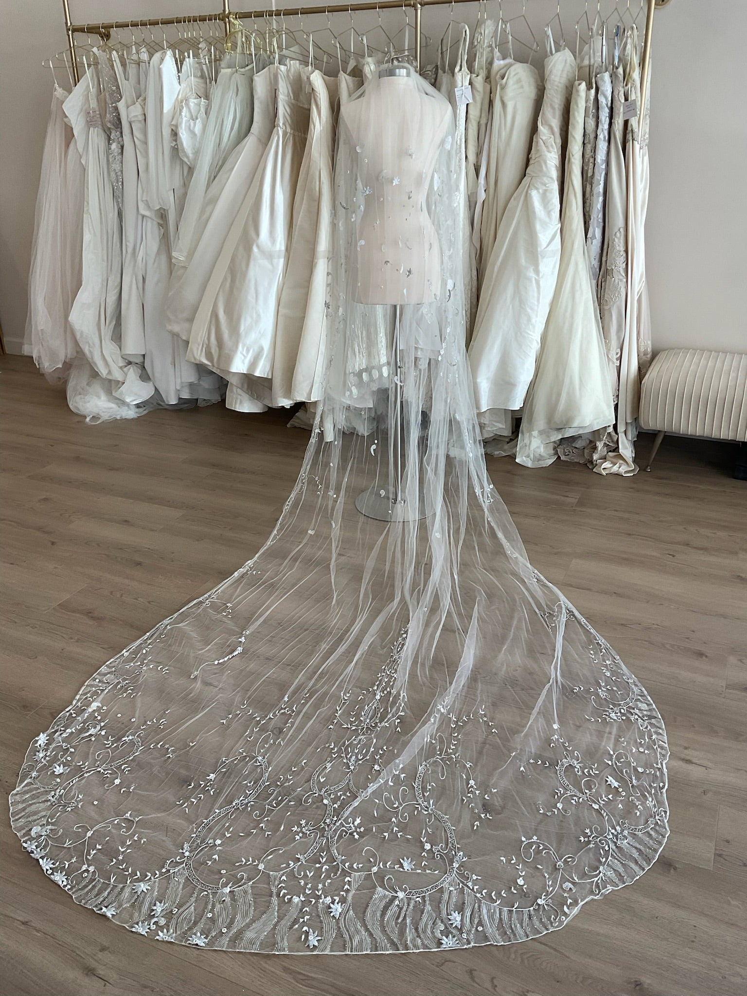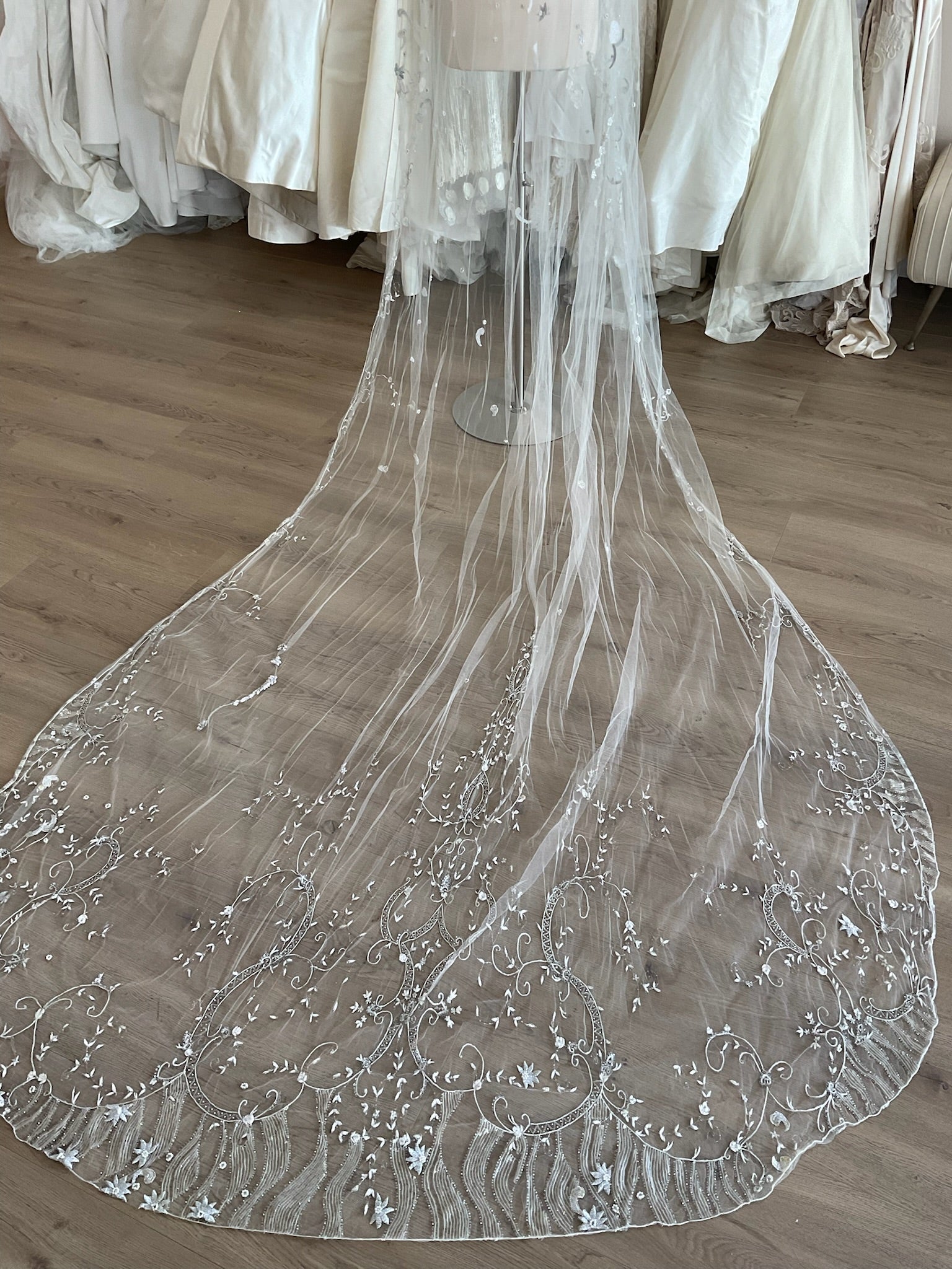 This single layer ivory tulle royal cathedral veil has a stunning silver floral embroidery throughout the entire veil. What starts at the comb gets less dense through the center and builds towards the edge. The vertical beadwork adds a unique touch. Please note this veil has a bit of yellowing. The veil measures 130'' long.
