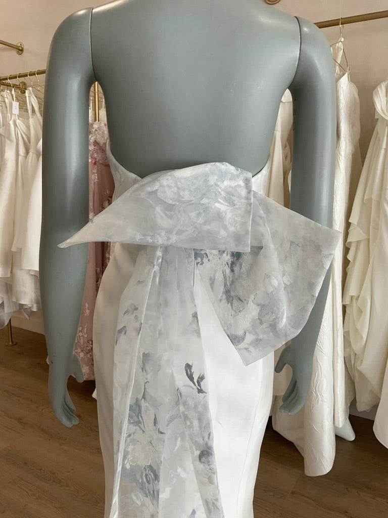 The Emilie gown by House of Savin is classic mikado fit to flare with a subtle touch of blue color. The straight neckline has a foldover lapel finish made of a water colored organza touch that wraps into a bow finish at the back of the dress.