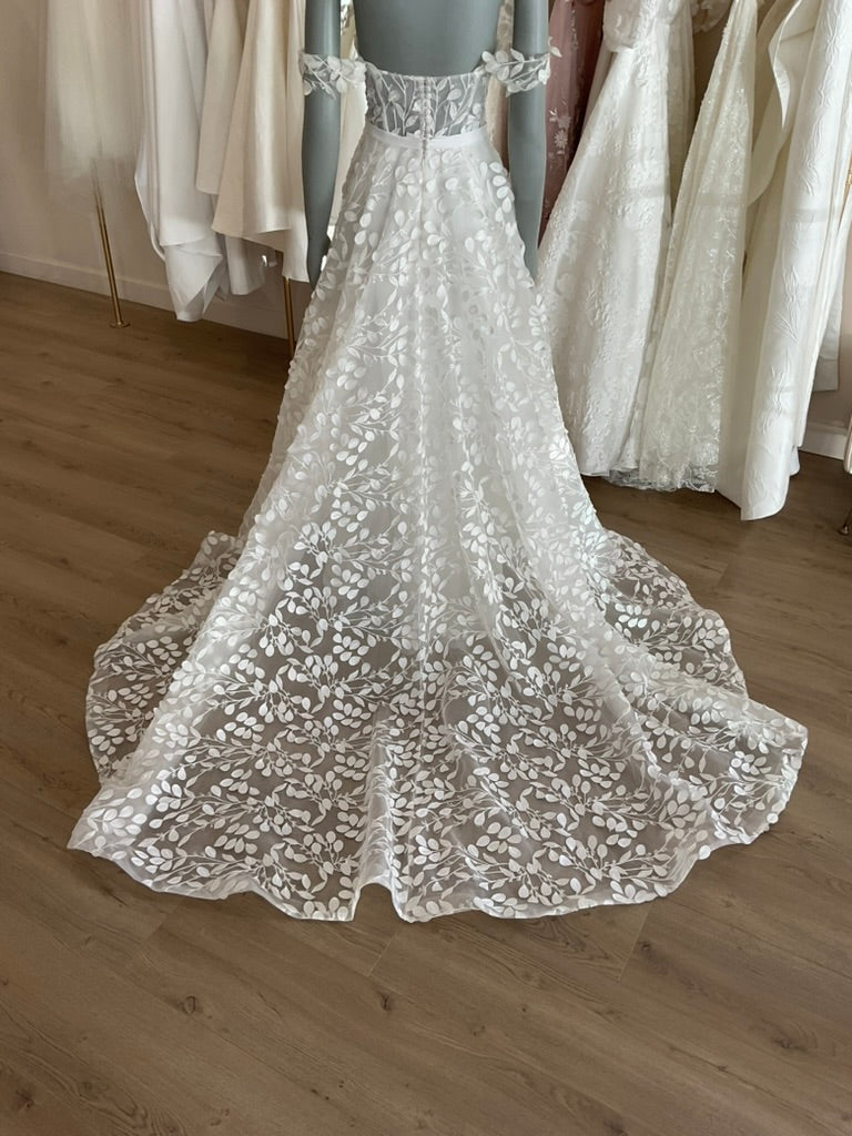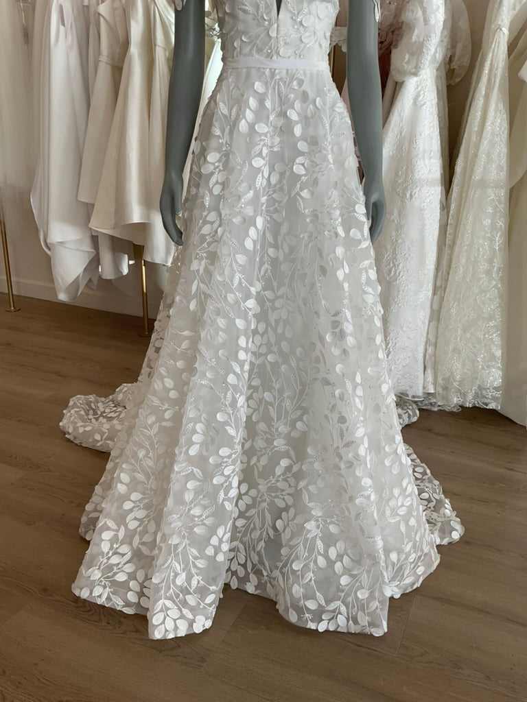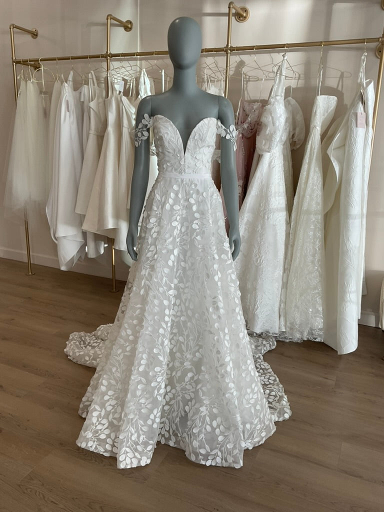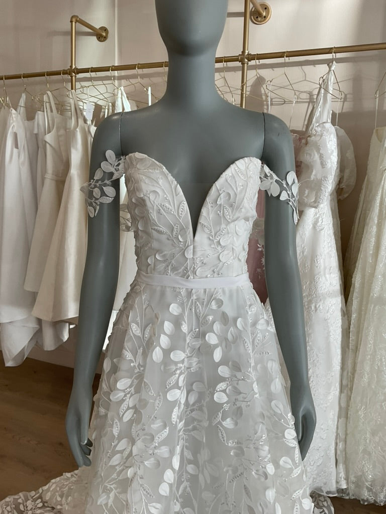 The Hollie gown by House of Savin is a dreamy A line gown with a plunging sweetheart neckline, sheer off should sleeves, and a slim skirt full of leaf appliques with a slightly sparkly branch pattern connecting them. This gives it a classic feel while still being a breath of fresh air.