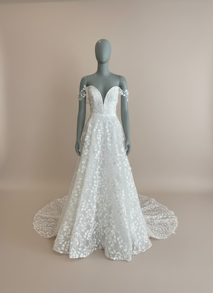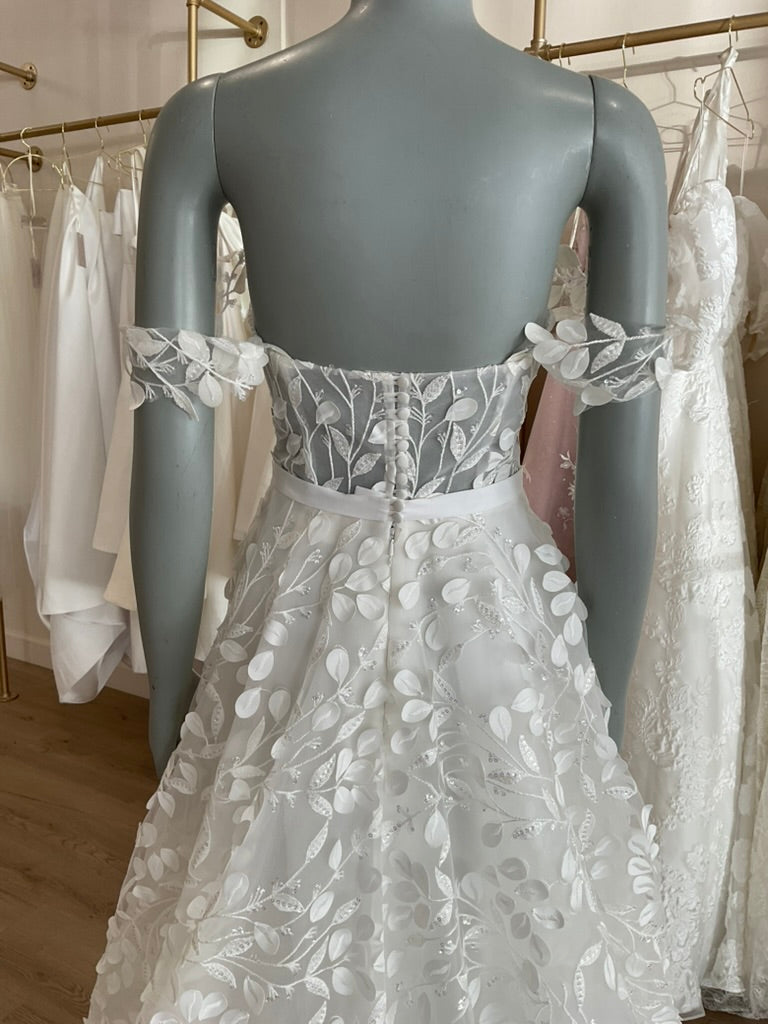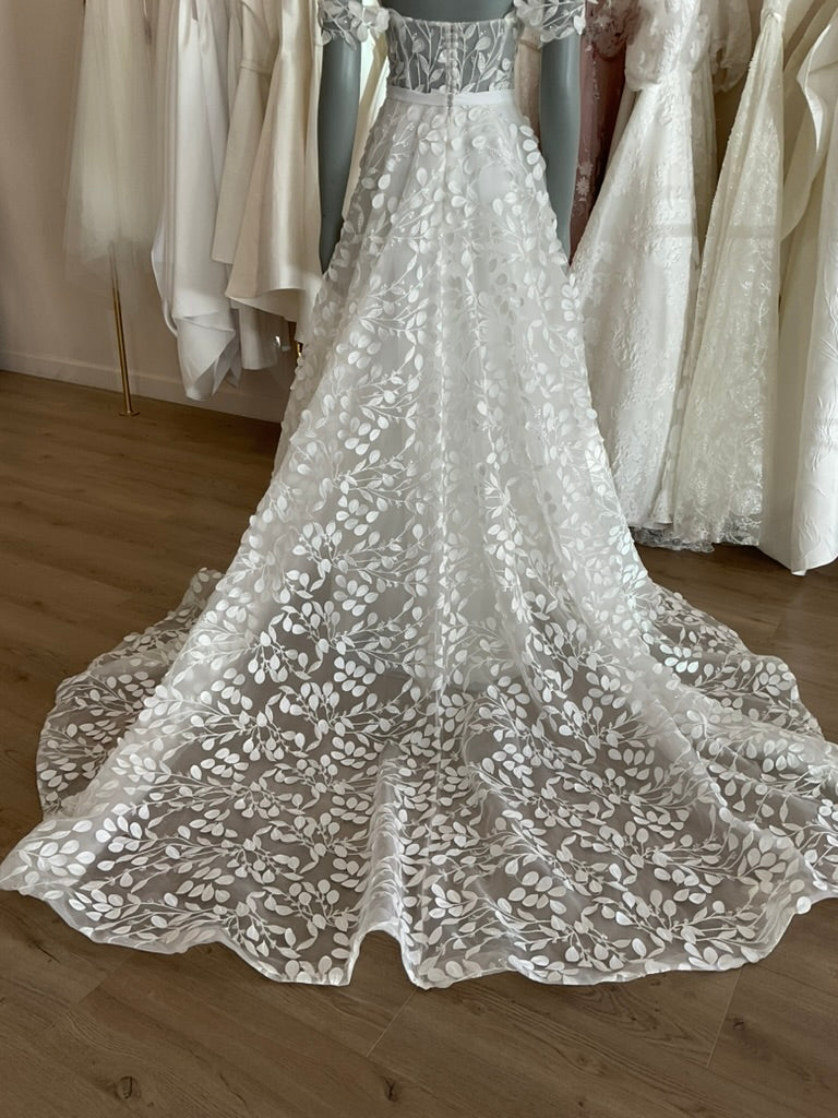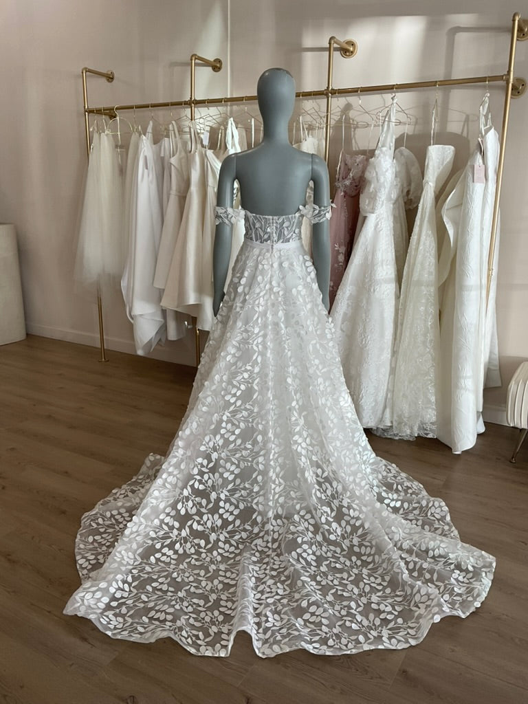 The Hollie gown by House of Savin is a dreamy A line gown with a plunging sweetheart neckline, sheer off should sleeves, and a slim skirt full of leaf appliques with a slightly sparkly branch pattern connecting them. This gives it a classic feel while still being a breath of fresh air.
