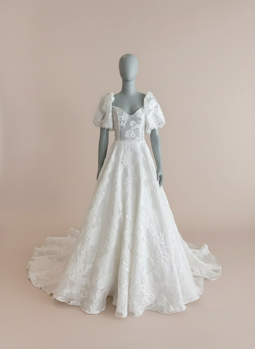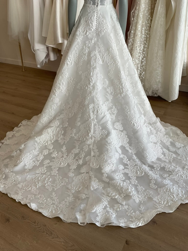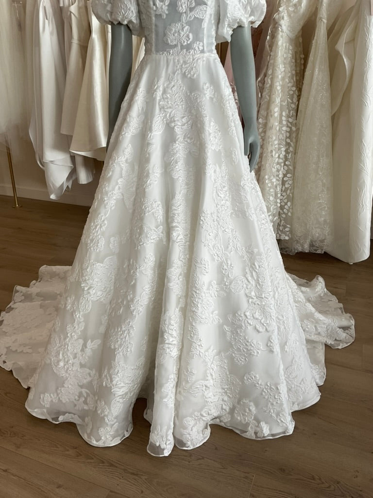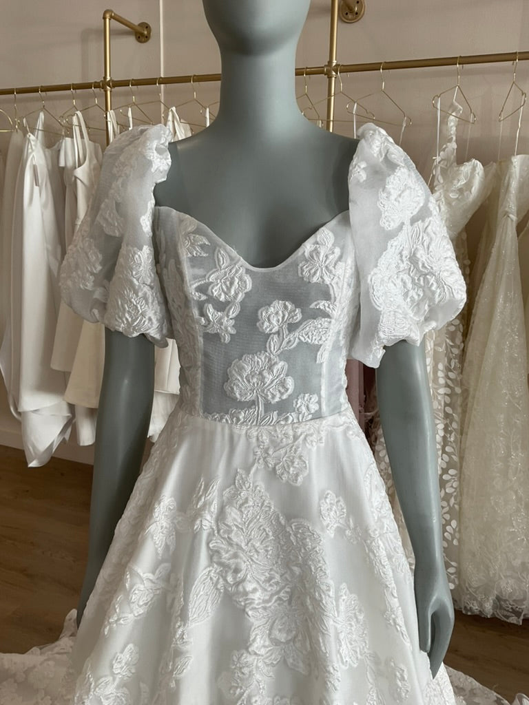 The Naomi gown by House of Savin is beautiful aline. The subtly sheer corset has a jacquard print with a subtle v neckline. The puff sleeve adds a touch of whimsical romance to match the movement in the skirt. The train is a wide chapel length.
