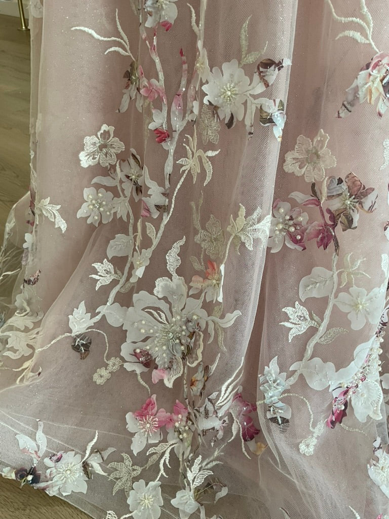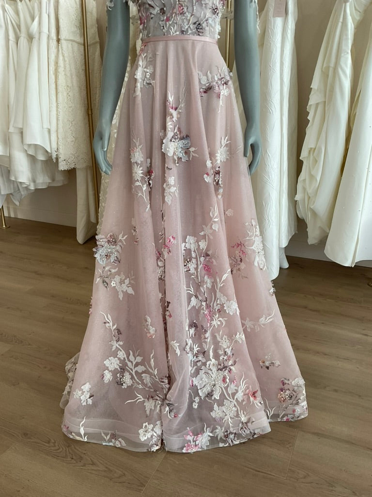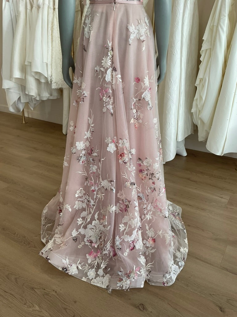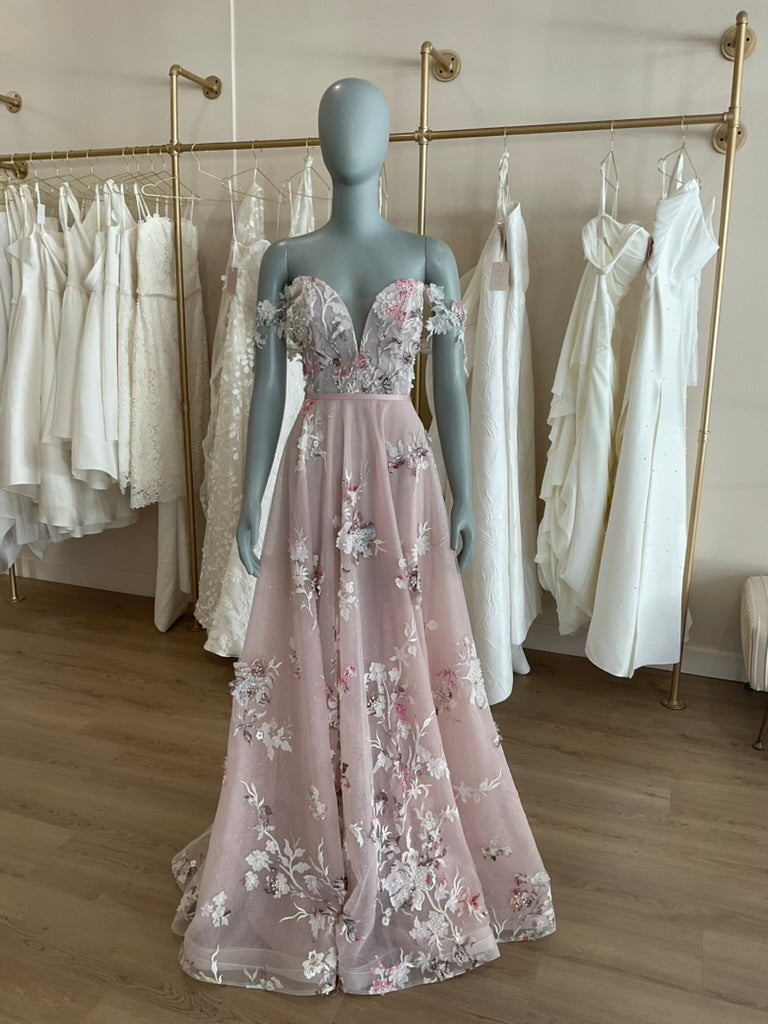 The Rosaline gown by House of Savin is whimsical colorful aline. The sweetheart neckline has a subtle plunge cut out and a soft off the shoulder lace detail. The blush lining helps with contrast to the pink/purple/blush/ivory lace. In the appliques are organza pieces that are screen printed. This gown is truly special.