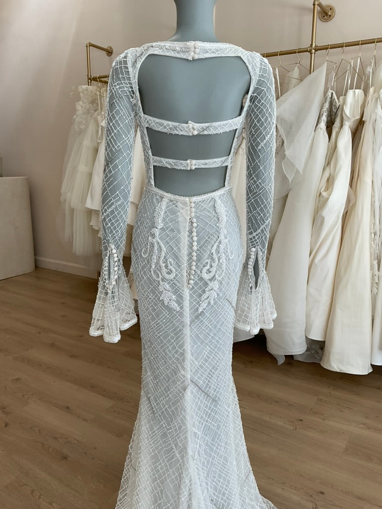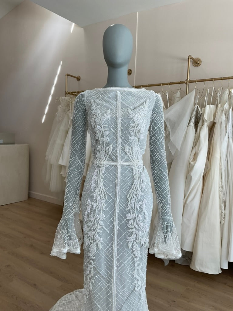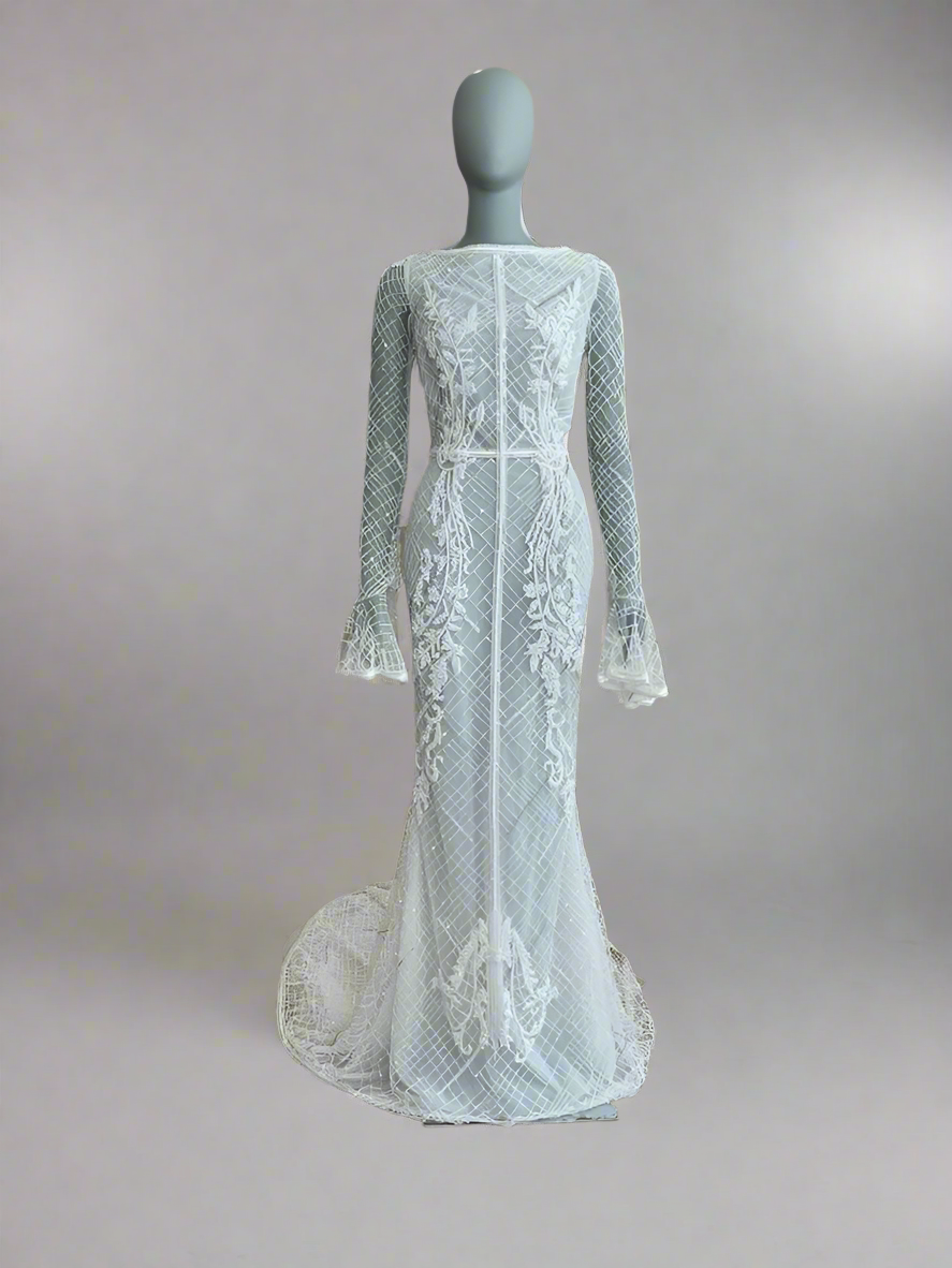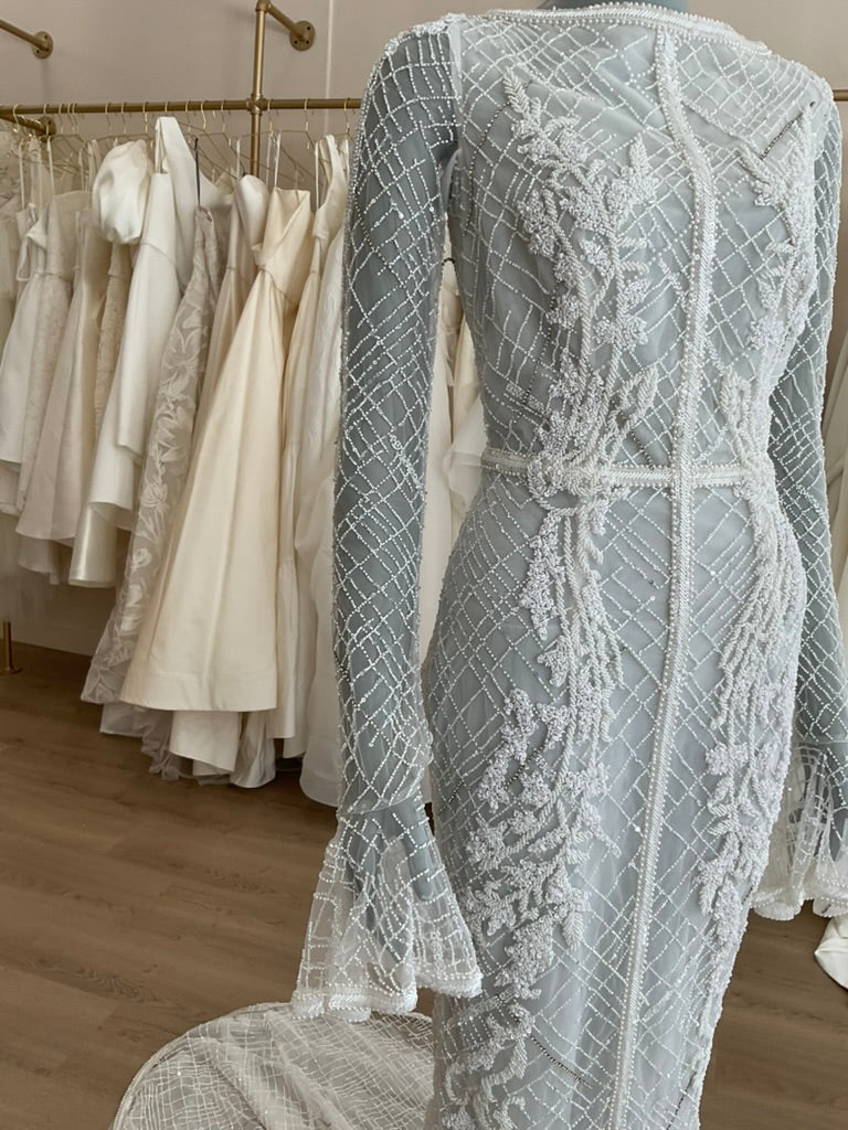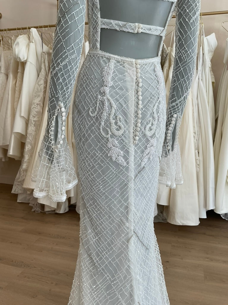 The J. Andreatta Café De Flor is a romantic dream for the bride who craves vintage elegance with a modern twist. This figure-hugging gown features a sheer illusion overlay adorned with intricate hand-beaded latticework and cascading floral appliqué throughout. The high bateau neckline and full-length sleeves add timeless sophistication, while the flared cuffs create delicate movement. The back is a true showstopper—three horizontal cut-outs framed by beaded bands add bold intrigue to the otherwise demure silhouette. The fitted skirt flows effortlessly into a soft chapel-length train, balancing structure with grace. Café De Flor is perfect for the bride seeking high-fashion drama with ethereal delicacy.
