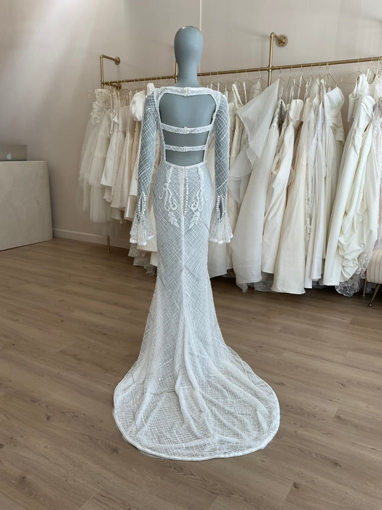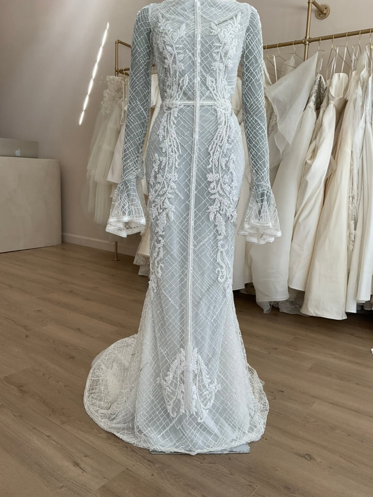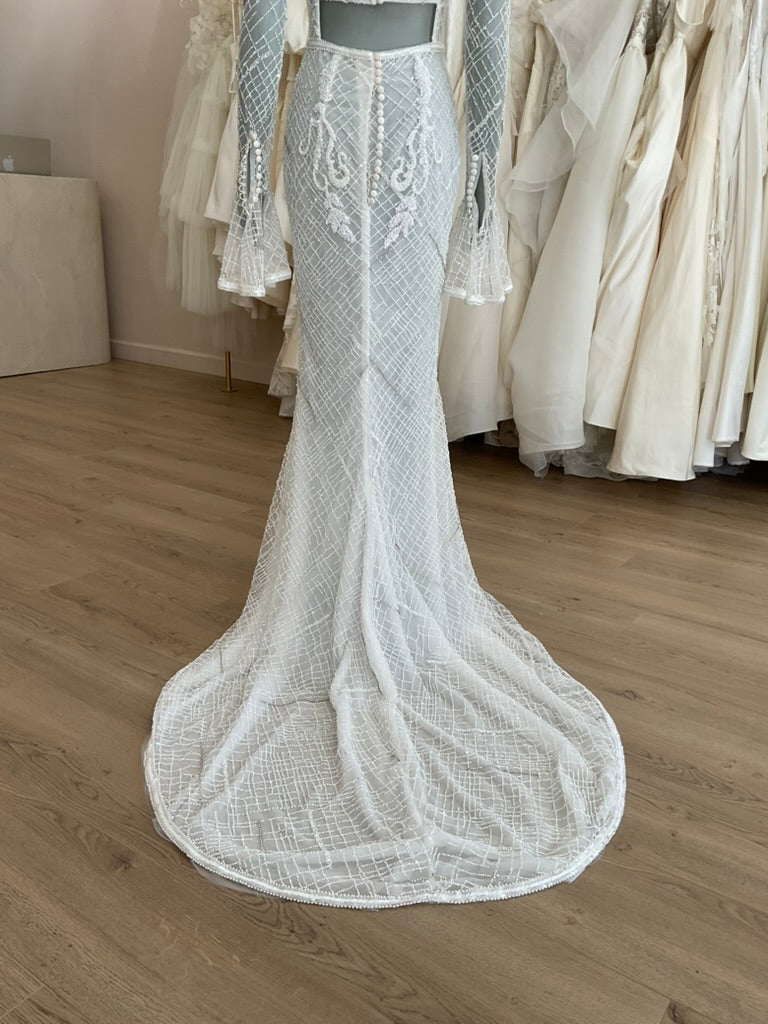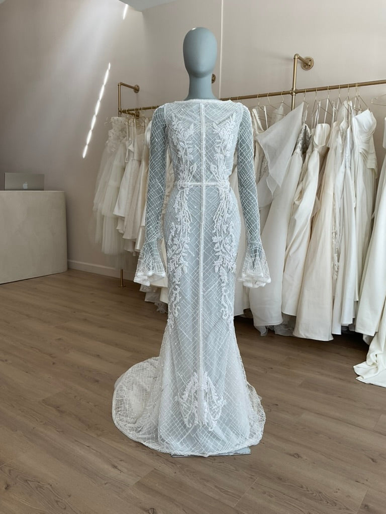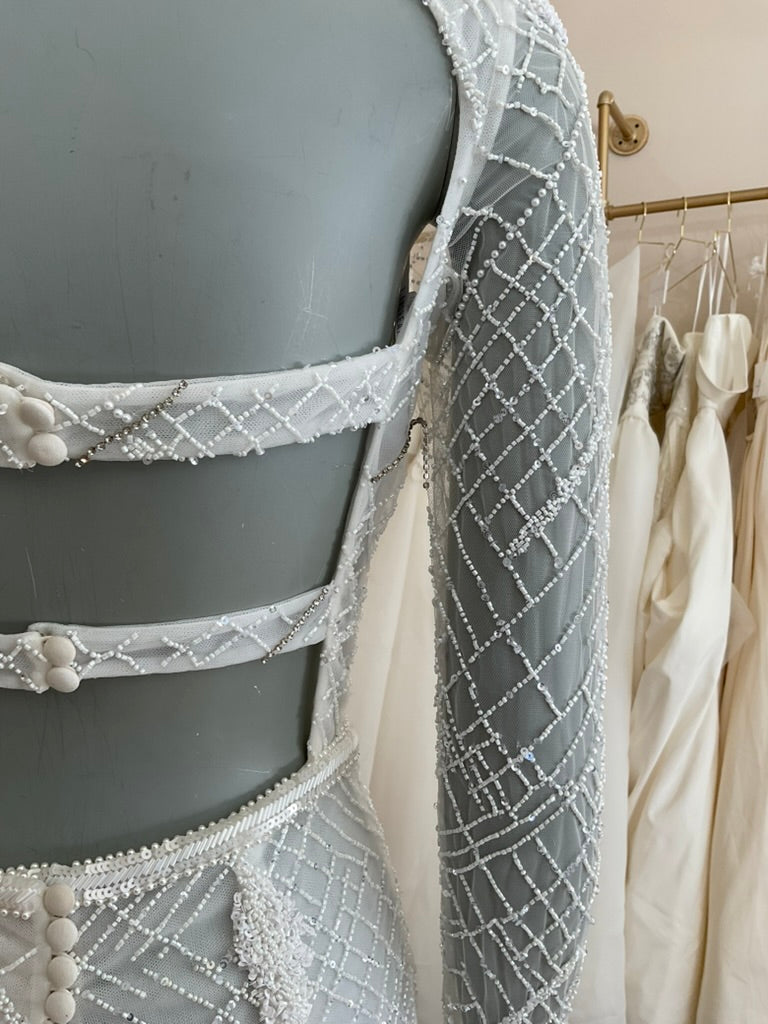 The J. Andreatta Café De Flor is a romantic dream for the bride who craves vintage elegance with a modern twist. This figure-hugging gown features a sheer illusion overlay adorned with intricate hand-beaded latticework and cascading floral appliqué throughout. The high bateau neckline and full-length sleeves add timeless sophistication, while the flared cuffs create delicate movement. The back is a true showstopper—three horizontal cut-outs framed by beaded bands add bold intrigue to the otherwise demure silhouette. The fitted skirt flows effortlessly into a soft chapel-length train, balancing structure with grace. Café De Flor is perfect for the bride seeking high-fashion drama with ethereal delicacy.