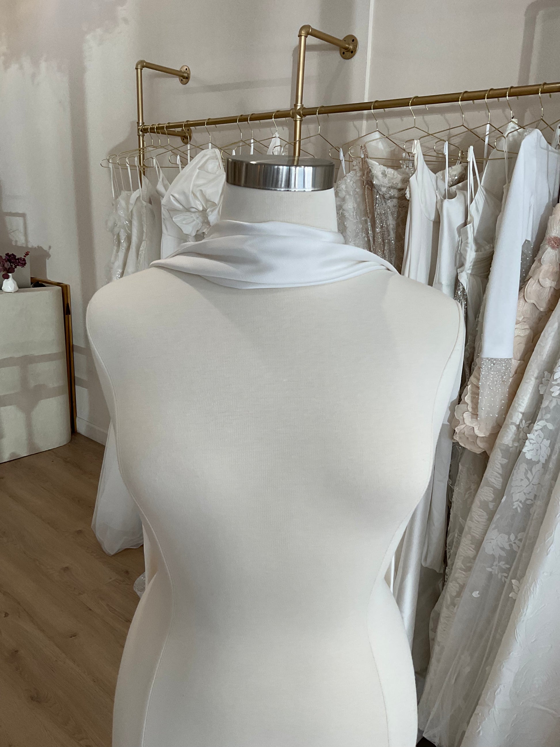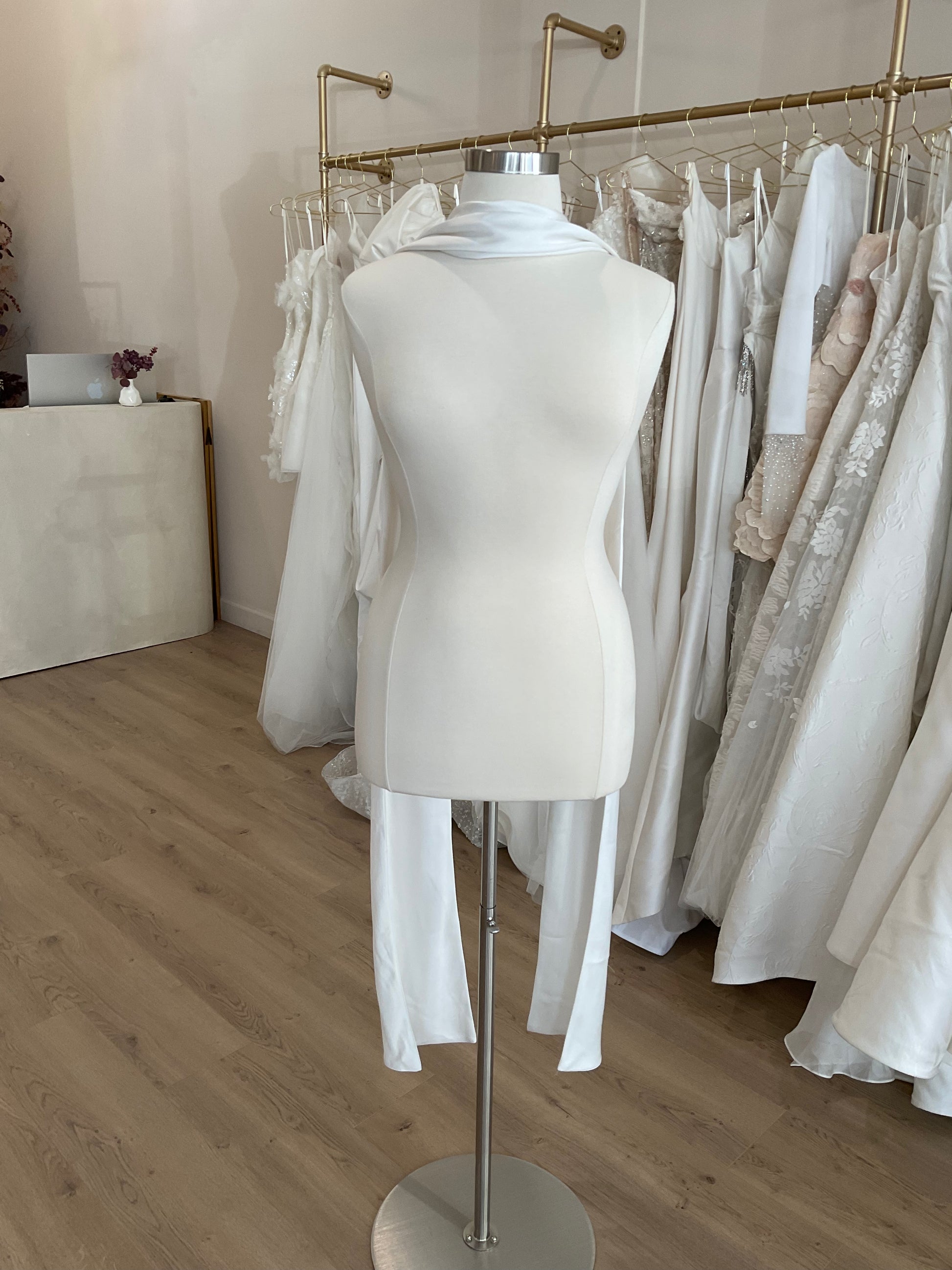 The Jenny Yoo Satin Neck Scarf is the perfect finishing touch for the minimalist bride with a modern edge. Crafted from luxuriously smooth satin, this statement accessory drapes elegantly around the shoulders or can be styled as a dramatic neck tie for a chic, fashion-forward look. Its generous length allows for versatile styling — whether knotted, wrapped, or left to cascade down the back for a dose of elegant drama. The crisp, clean ivory tone complements a wide variety of gowns, making it a seamless addition to your bridal ensemble. Ideal for ceremonies, receptions, or even a wedding weekend look, this scarf is sophisticated simplicity at its finest.