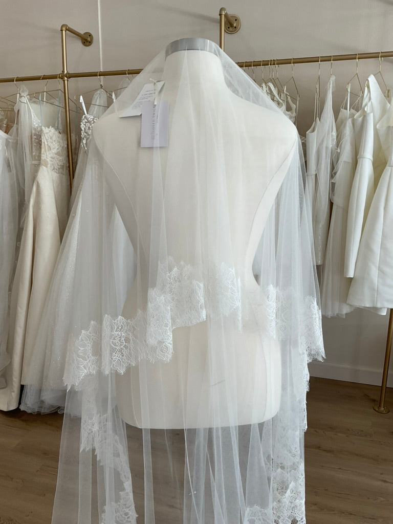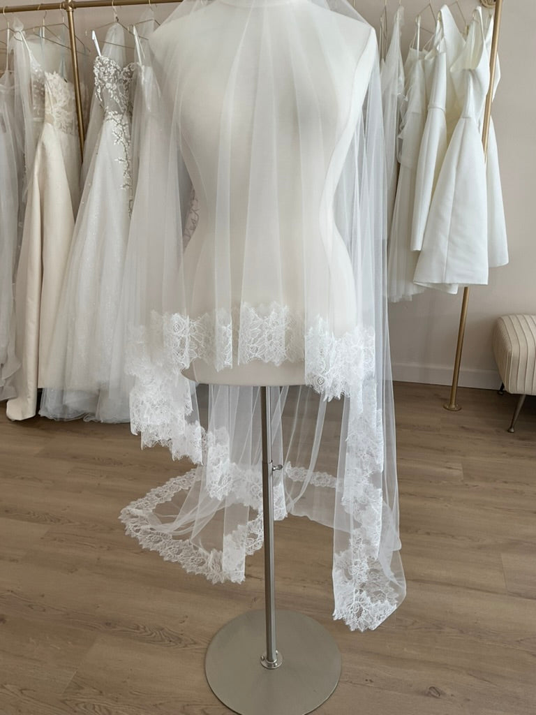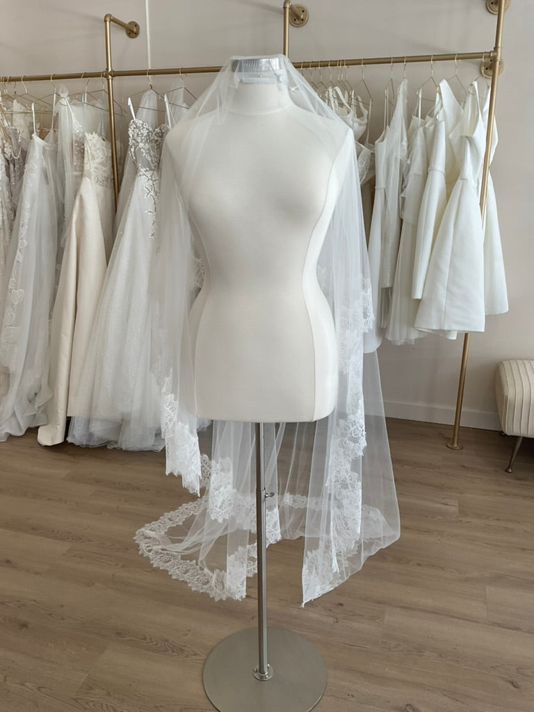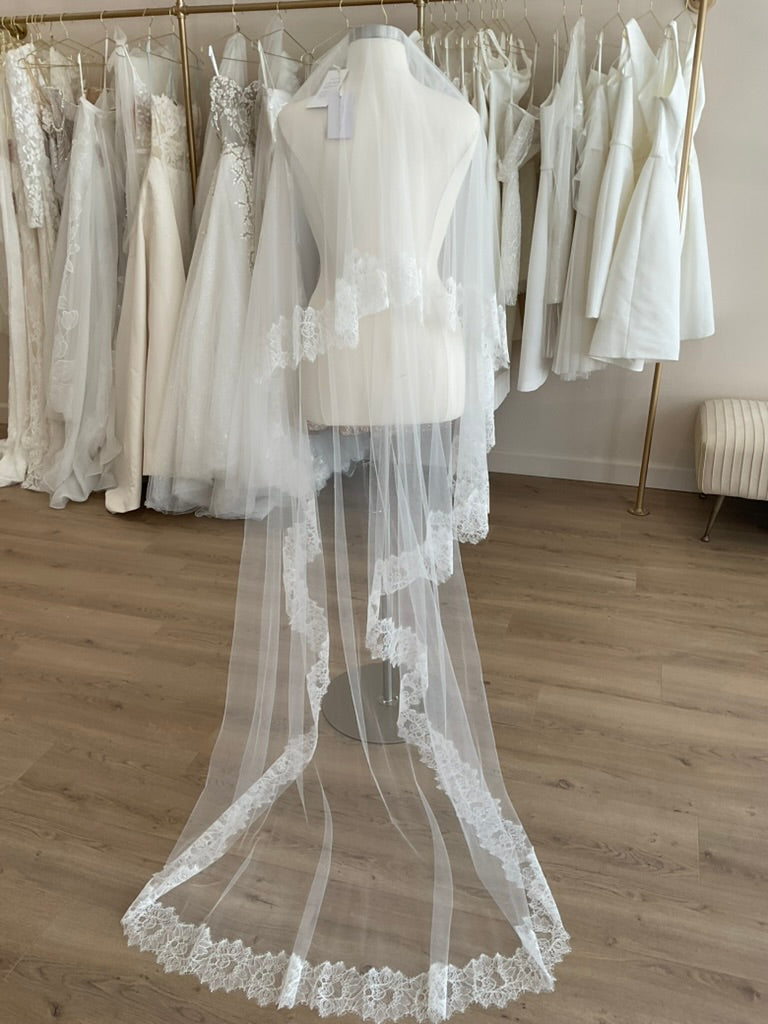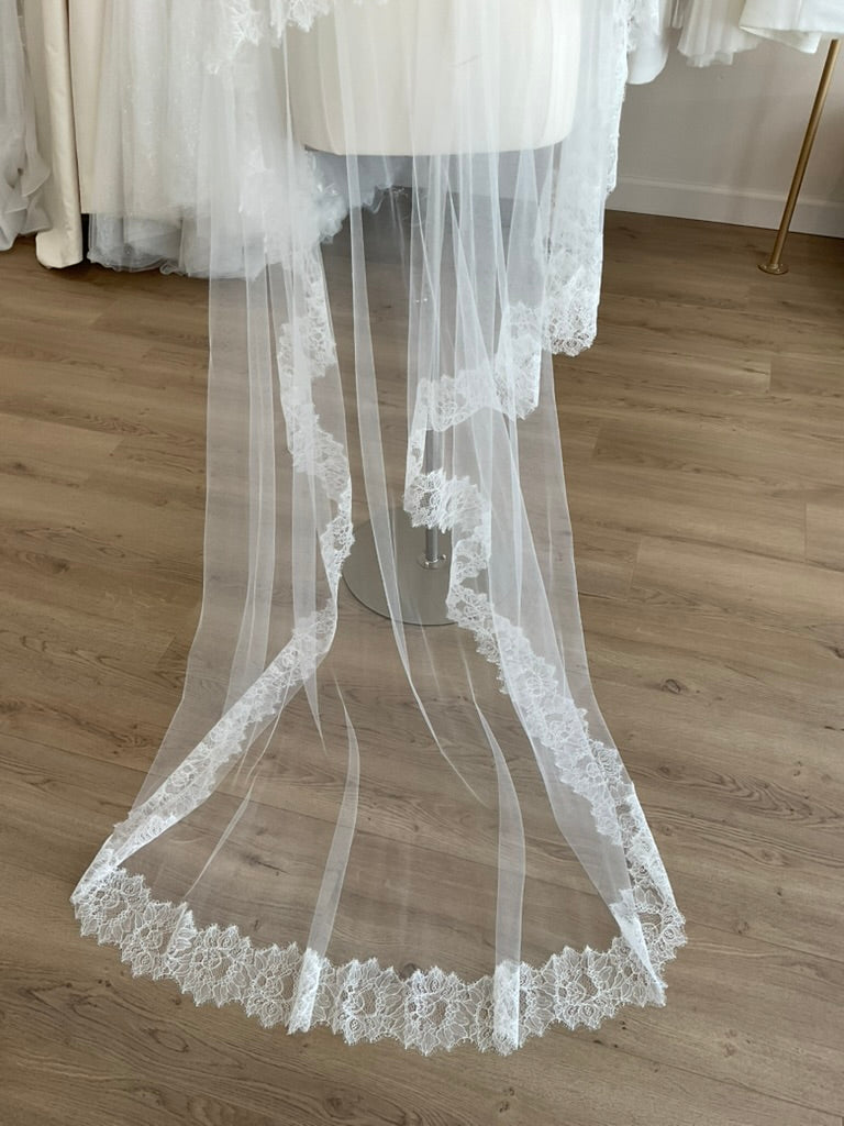 The double layer chapel length veil finished with a delicate Chantilly lace edge on both layers. The soft tulle has no volume in the comb.