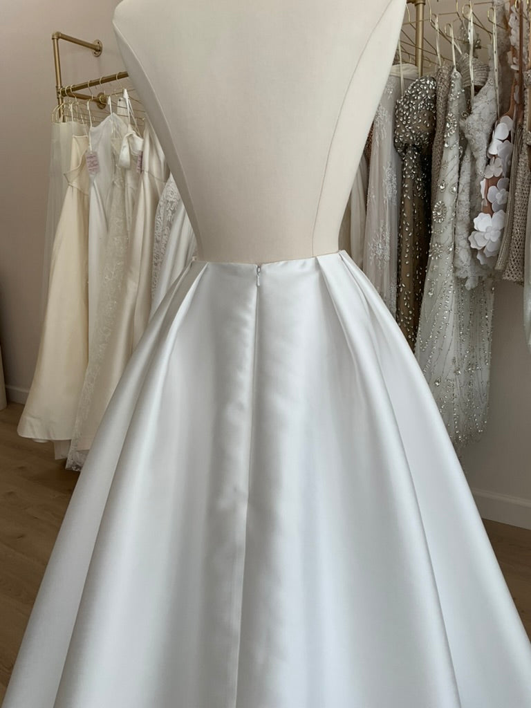 The custom mikado overskirt is a luxurious complement to almost any gown. The subtle box pleat adds a touch of elegance. The overskirt has a chapel length train.