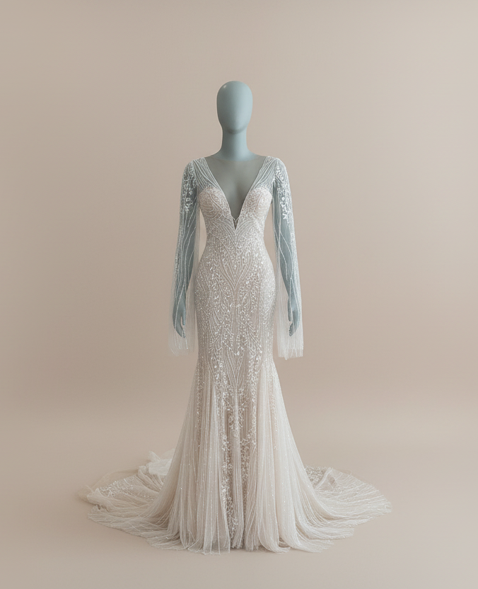 The Julie Vino Amanda - 2403 is a captivating fusion of elegance and allure for the bride who wants to make an unforgettable entrance. This fitted mermaid silhouette is masterfully embroidered with delicate vine motifs and shimmering beadwork, creating luxurious texture and sparkle from every angle. The plunging V-neckline is enhanced with sheer long sleeves that finish in romantic, flowing tulle cuffs for a modern yet ethereal touch. A low scoop back adds drama, perfectly balancing the gown’s enchanting front. The soft tulle godets in the skirt flow into a graceful chapel-length train, offering movement and dimension with every step. A breathtaking gown for the bride who loves timeless sophistication with a fashion-forward twist.