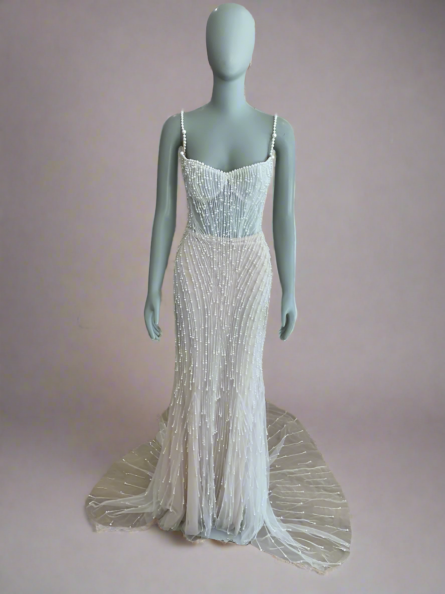 Info: The Scarlet gown by Julie Vino is a show-stopping choice for the bride who loves sparkle and sophistication. Its figure-flattering silhouette is adorned with shimmering beadwork and a corset-inspired bodice, creating a glamorous yet timeless look. Lightweight straps and a soft train balance the drama with ease and wearability.