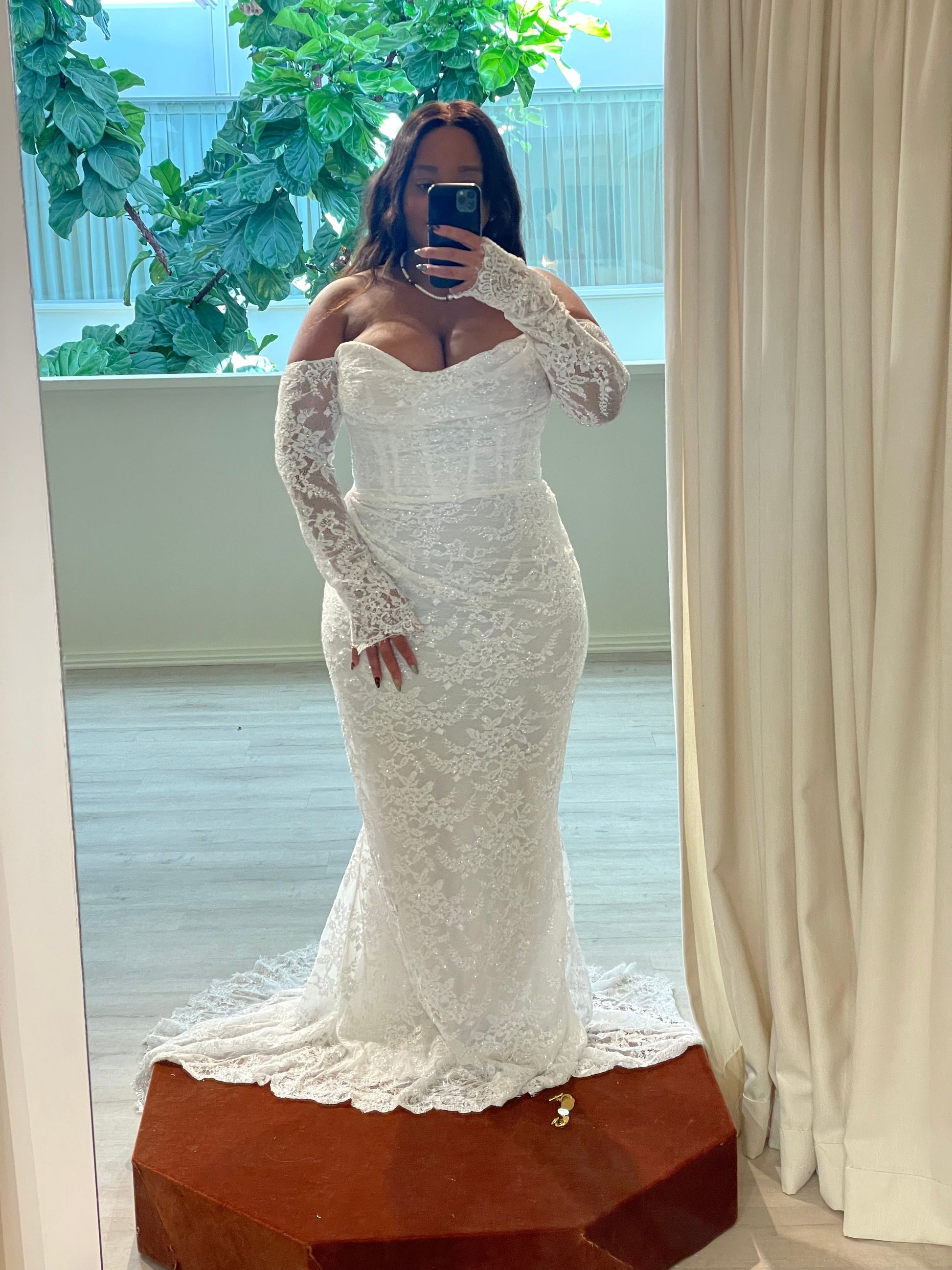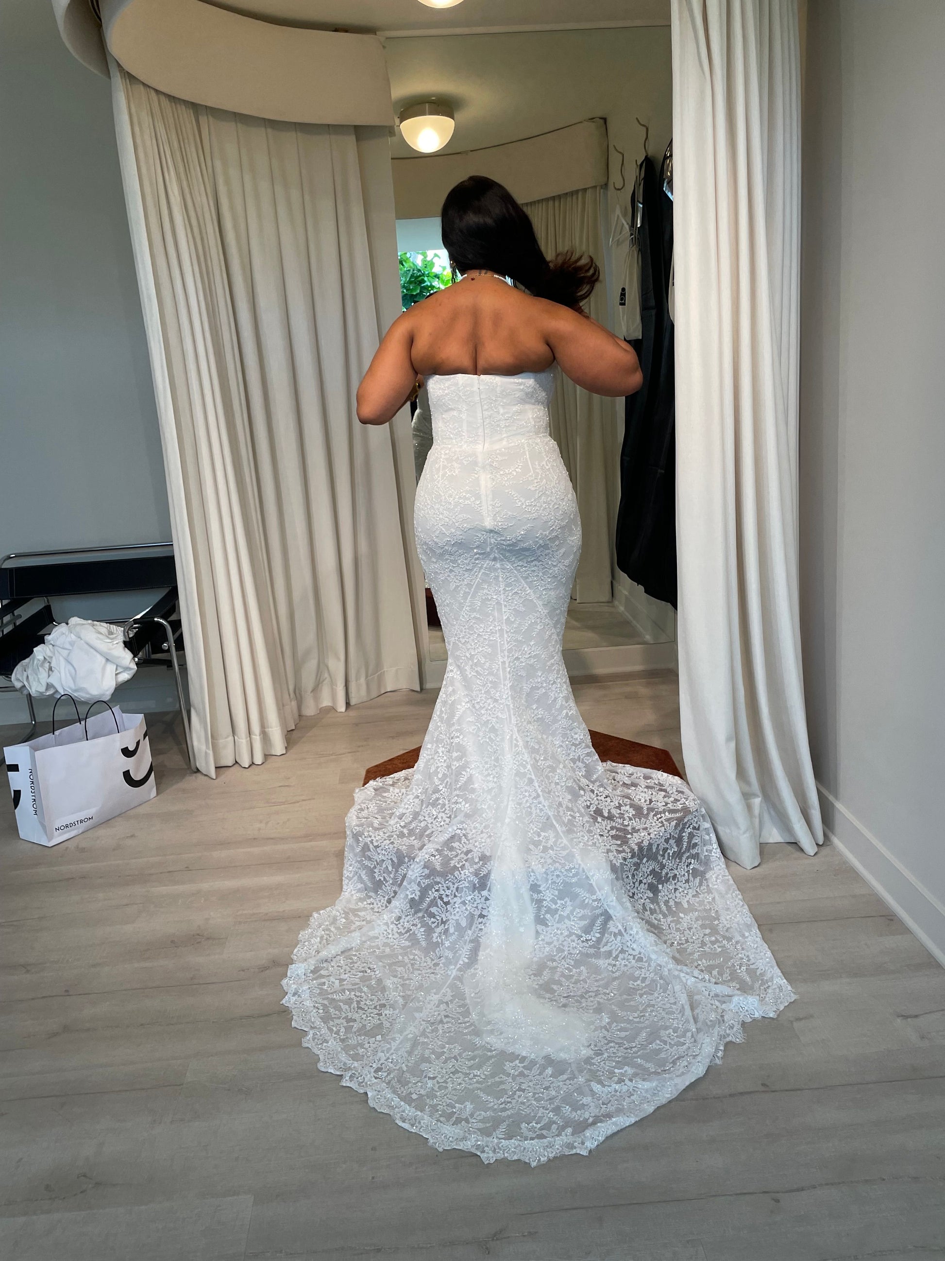 NOT LOCAL TO LA-Schedule a free 30 minute virtual fitting appointment before it's too late. Our inventory of hard to find wedding dresses is limited, and this is the only dress in stock and is available on a first come, first-served basis. Click here for a virtual Appointment