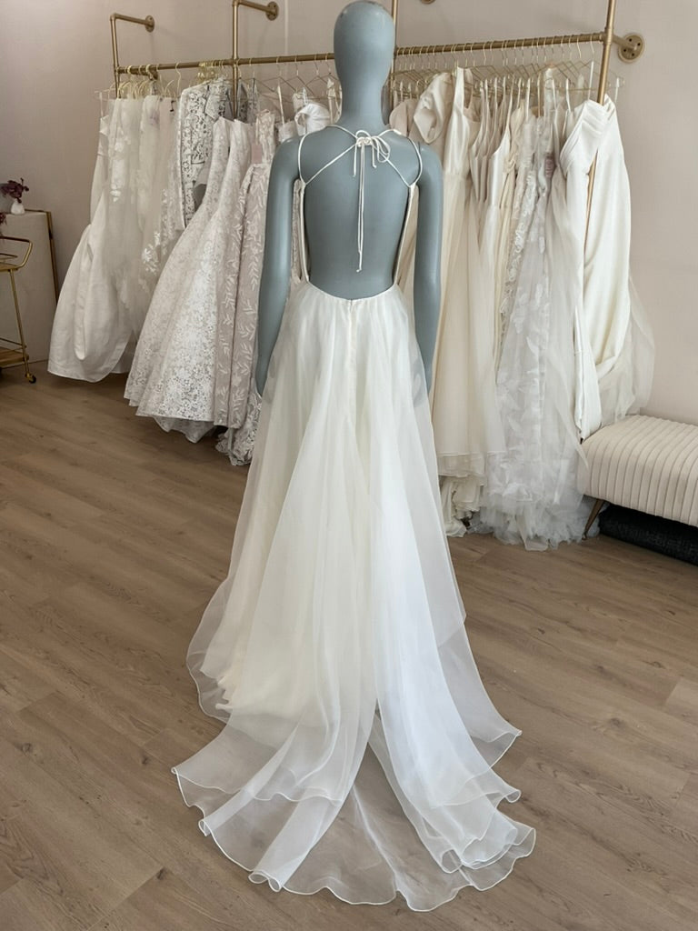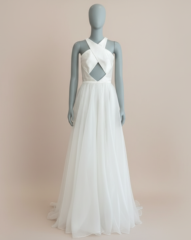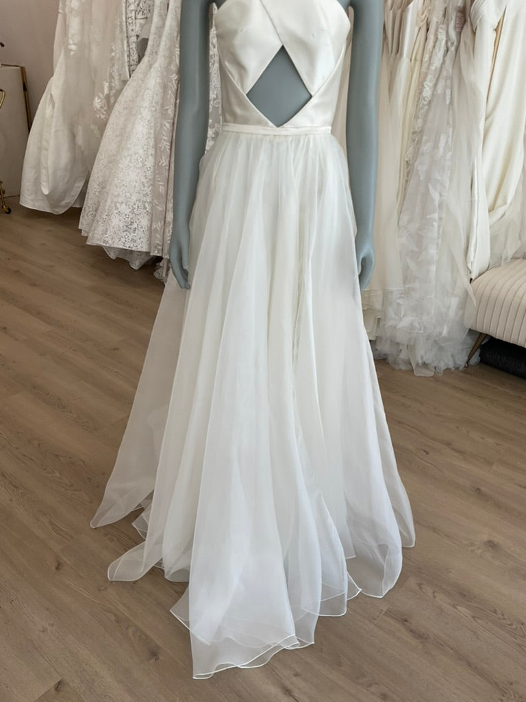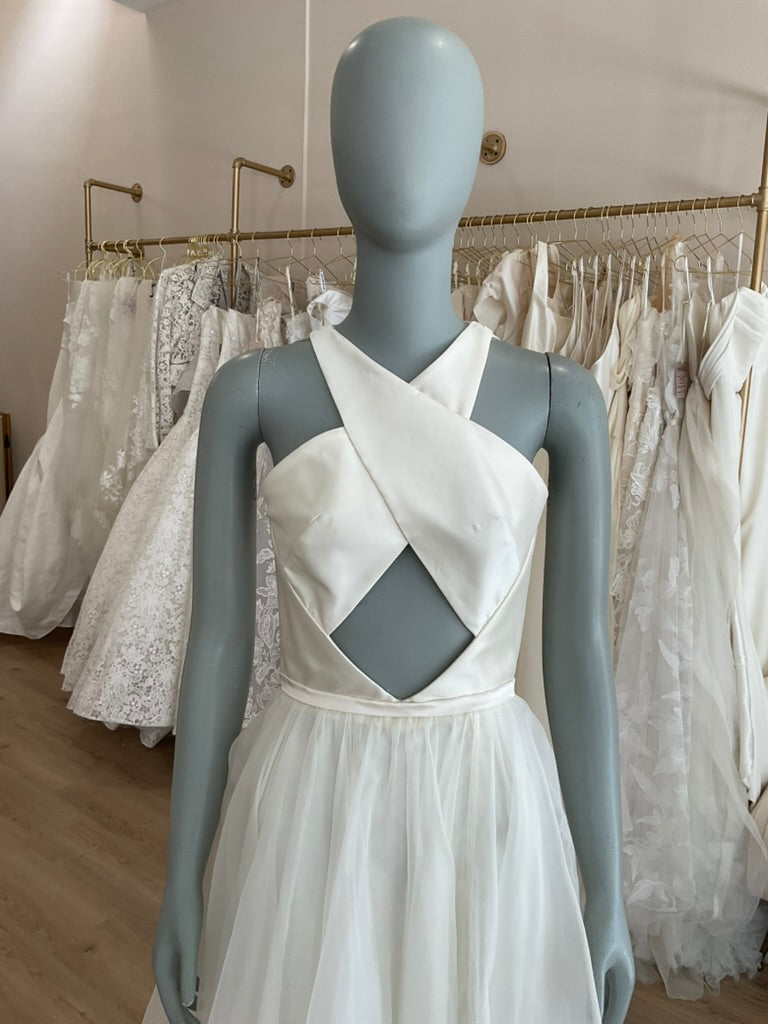 The Leanne Marshall Freya gown is a modern ethereal dream. Featuring a unique cross-over silk bodice with wide straps and subtle structure, the angular neckline adds architectural elegance while softening into a dreamy silk organza skirt. The airy, full A-line silhouette floats with every step, creating movement and romance without weight. Perfect for the bride seeking a minimalist yet artistic look, the Freya balances clean lines with effortless softness. Ideal for garden, beach, or gallery weddings, this gown is a striking choice for the modern romantic.
