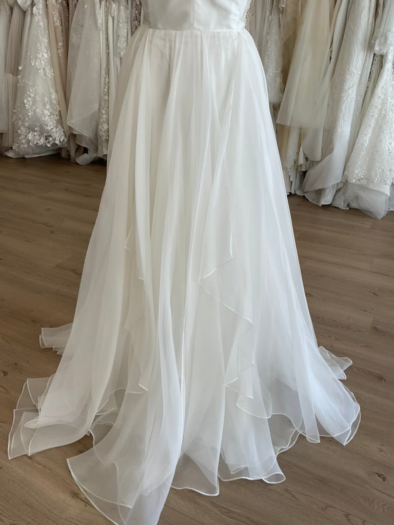 The Leanne Marshall Gabrielle gown is a romantic and ethereal choice for the effortlessly elegant bride. Featuring a sleek silk bodice with a plunging V-neckline and delicate spaghetti straps, this gown flatters the décolletage while offering modern sophistication. The soft A-line silhouette flows into a dreamy layered organza skirt, creating movement and volume with every step. The low scoop back adds a touch of allure, finishing in a clean zip closure for a seamless fit. Light as air and stunningly simple, Gabrielle is perfect for the bride who wants to feel free, feminine, and graceful on her wedding day.