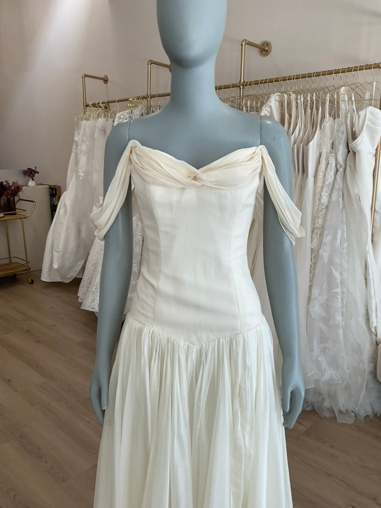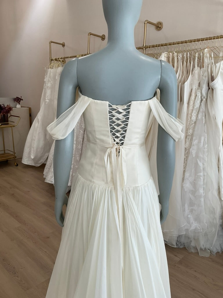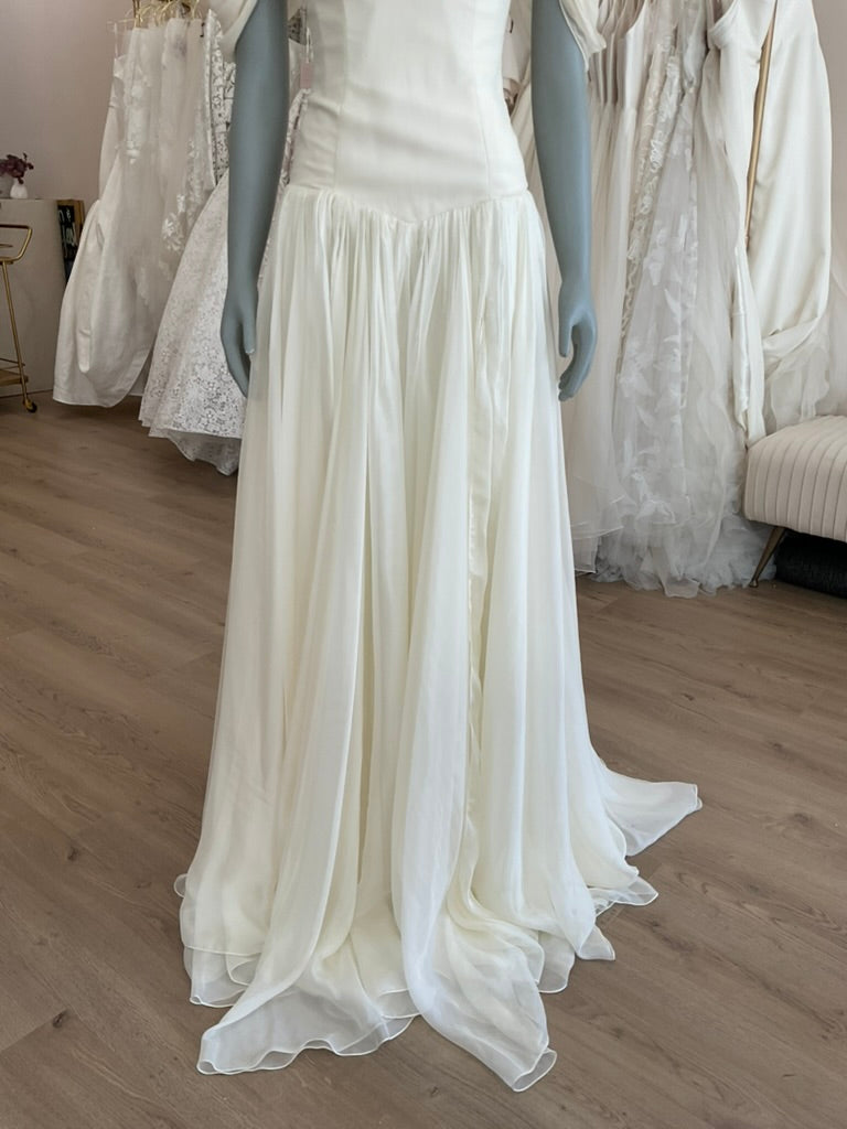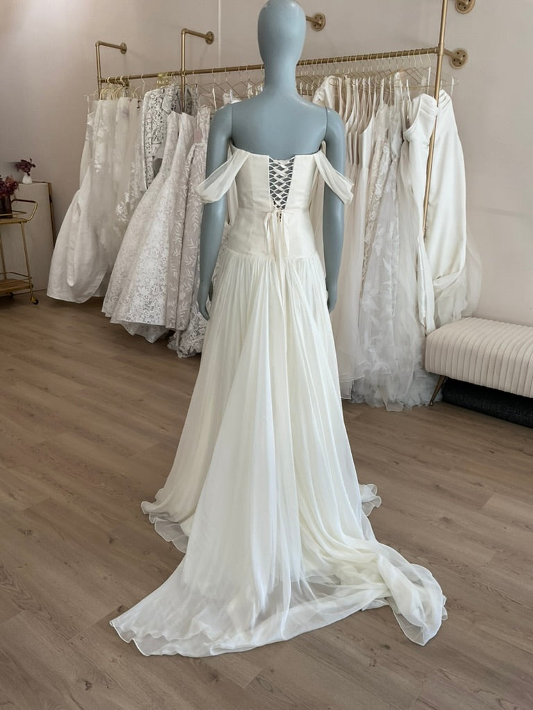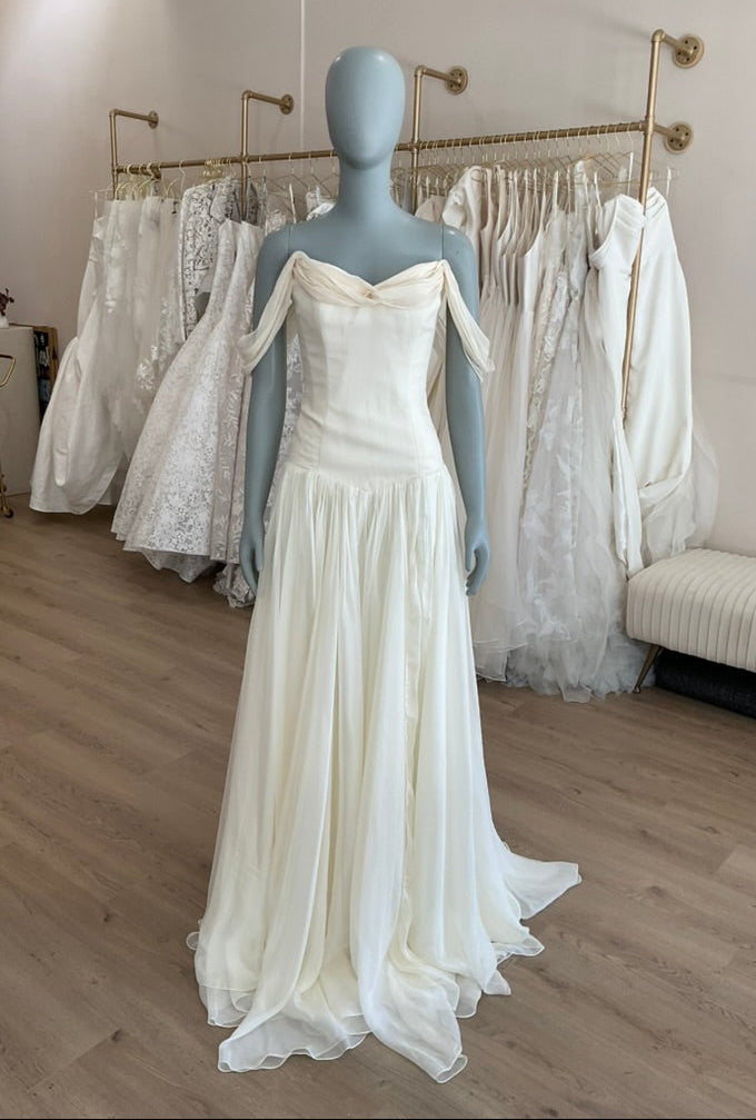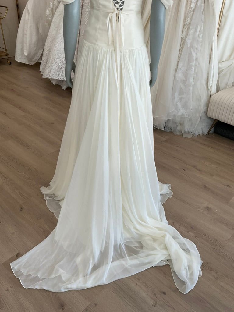 The Leanne Marshall Mariah gown is an ethereal masterpiece for the romantic bride. Crafted from light-as-air silk chiffon, this A-line silhouette floats effortlessly with every step. The bodice features a sculpted sweetheart neckline adorned with hand-draped chiffon that softly cascades into off-the-shoulder flutter sleeves, creating an effortlessly graceful look. The dropped waist elongates the torso, while layers of flowy chiffon fall into a full, sweeping skirt for a dreamy, weightless movement. The back stuns with a dramatic lace-up corset closure, offering both a secure fit and a touch of vintage-inspired elegance. The Mariah’s flowing chapel length train completes the look, perfect for a walk down the aisle that feels like a fairytale