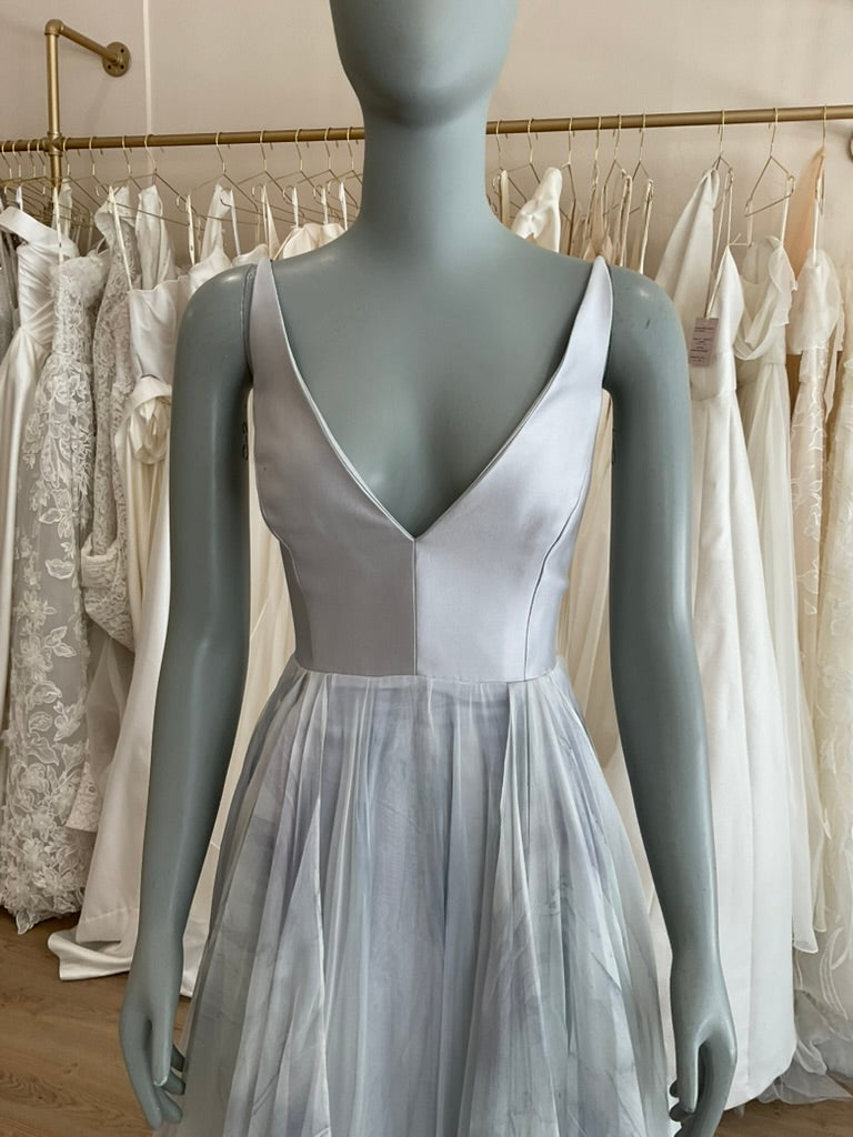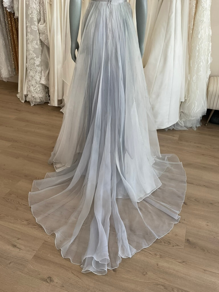 The Leanne Marshall Raincloud is a dreamlike gown that captures the ephemeral beauty of a misty sky. Designed for the bride who wants a soft, ethereal presence on her wedding day, this gown features a plunging V-neck bodice crafted from structured silk with delicate spaghetti straps and a sweeping open back that feels effortlessly elegant. The true showstopper is the layered skirt, hand-dyed in moody gray-blue tones reminiscent of a drifting raincloud—light-as-air silk organza cascades beautifully to the floor, creating movement and depth with every step. The subtle ombré effect adds drama without overpowering the gown's softness. Finished with a romantic ribbon-tied detail at the back waist and a graceful train, the Raincloud gown is perfect for the modern bride drawn to artistic detail, moody romance, and timeless femininity.
