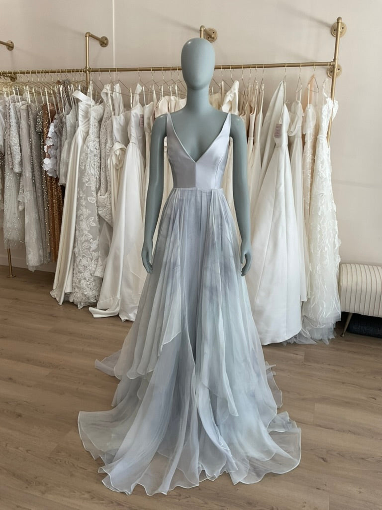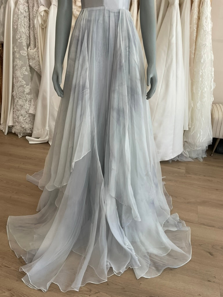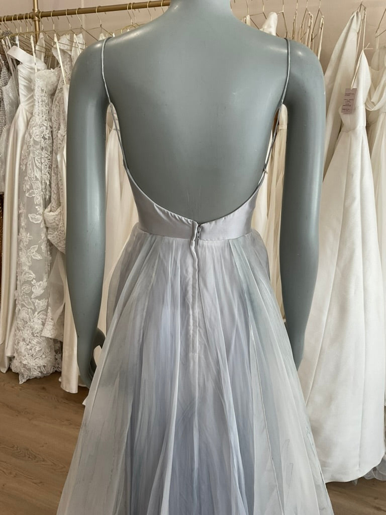 The Leanne Marshall Raincloud is a dreamy, ethereal gown designed for the romantic bride with a love for whimsy. Featuring a structured bodice with a deep V neckline and delicate spaghetti straps, this gown flatters and elongates the silhouette. The soft grey ombré tulle skirt cascades from the waist in airy, layered waves, reminiscent of a passing raincloud—light, graceful, and utterly unforgettable. The open back closes with a subtle button detail and adds a modern, minimalist touch. Finished with a flowing train, the Raincloud gown moves effortlessly, making it perfect for an outdoor ceremony or an artful, contemporary celebration.