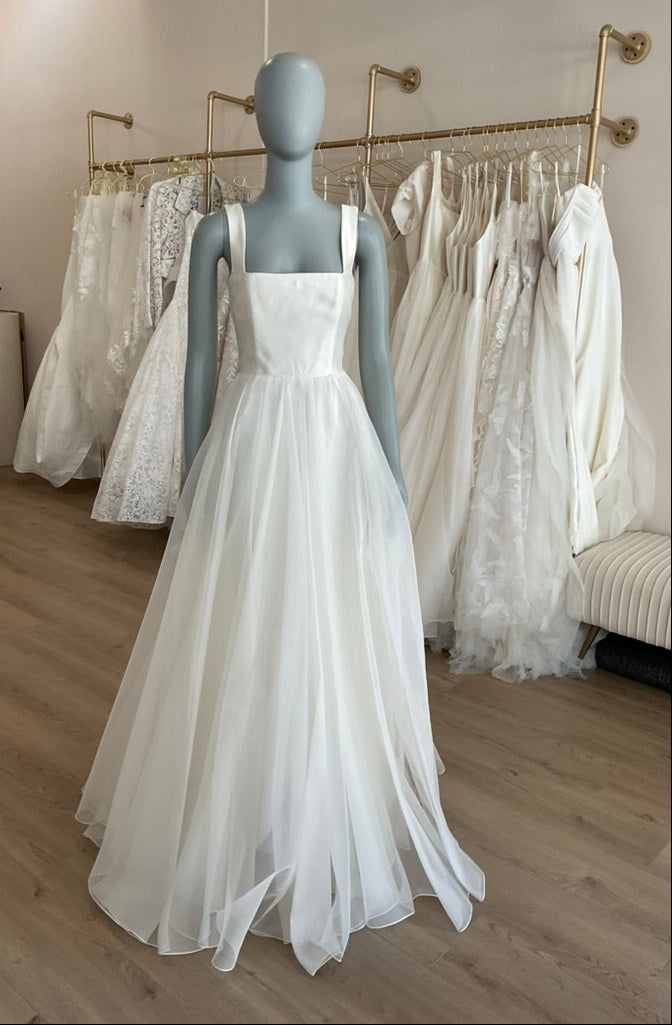 The Leanne Marshall Vivica Organza gown is a breath of fresh air for the bride seeking ethereal elegance and effortless movement. Crafted from lightweight silk organza, this gown features a modern square neckline and wide straps that frame the décolletage beautifully. The structured bodice flows into a soft, gathered A-line skirt that falls with graceful fluidity, complete with a thigh-high slit for a touch of unexpected allure. From the back, a deep scoop adds subtle drama, while the flowing train trails behind in soft, romantic layers. The Vivica is an airy, minimalist dream — ideal for the bride who wants understated sophistication with just a hint of whimsy.
